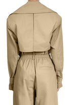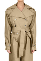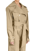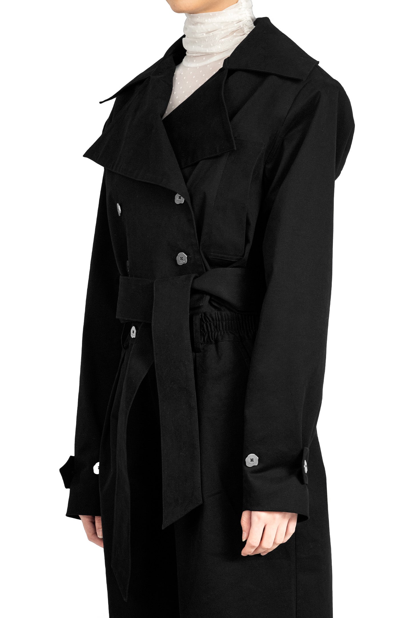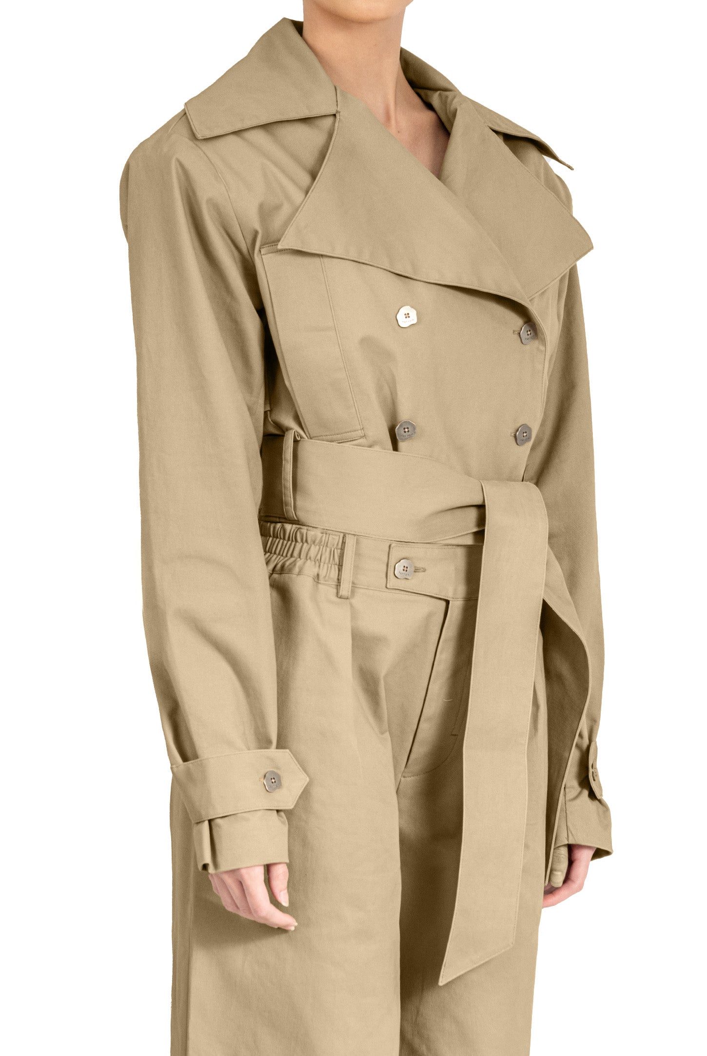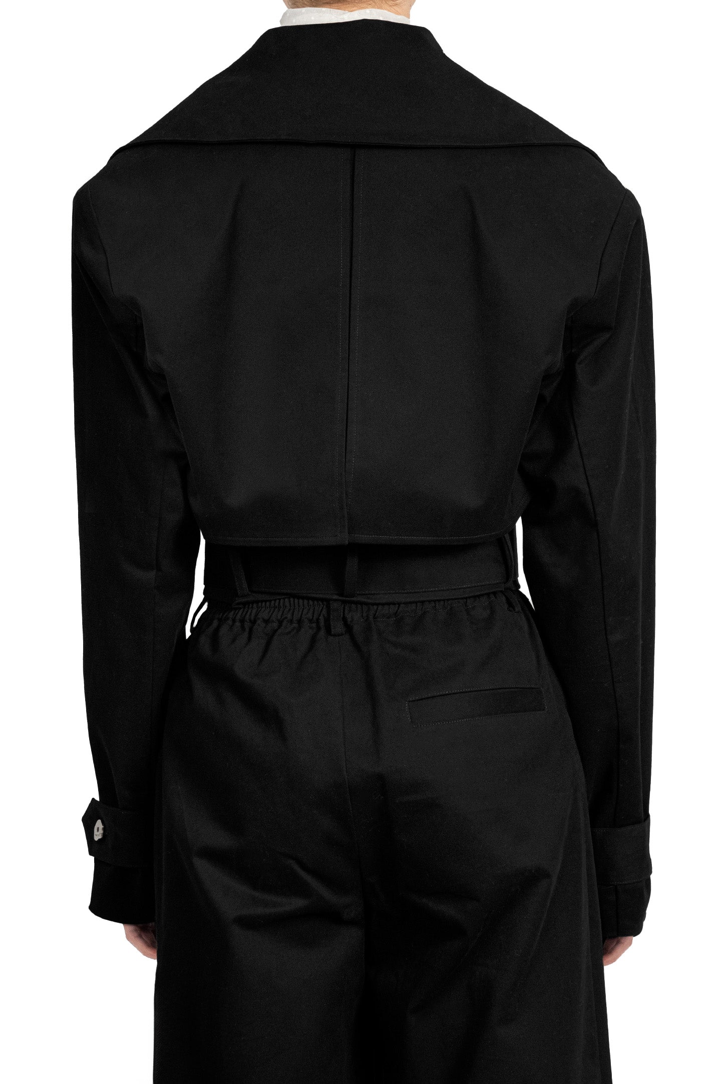 A coat with a cropped length, exaggerated shoulder pads, double-breast closure with metal logo buttons, adjustable buttoned cuffs, side welt pockets, and a removable belt.