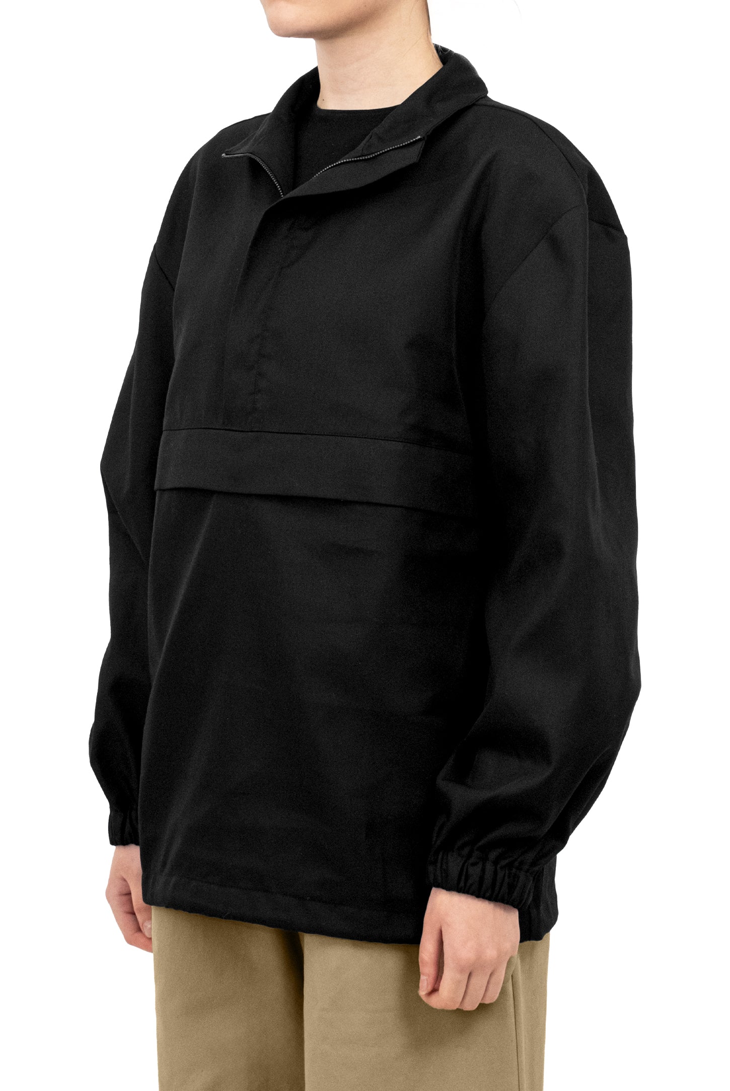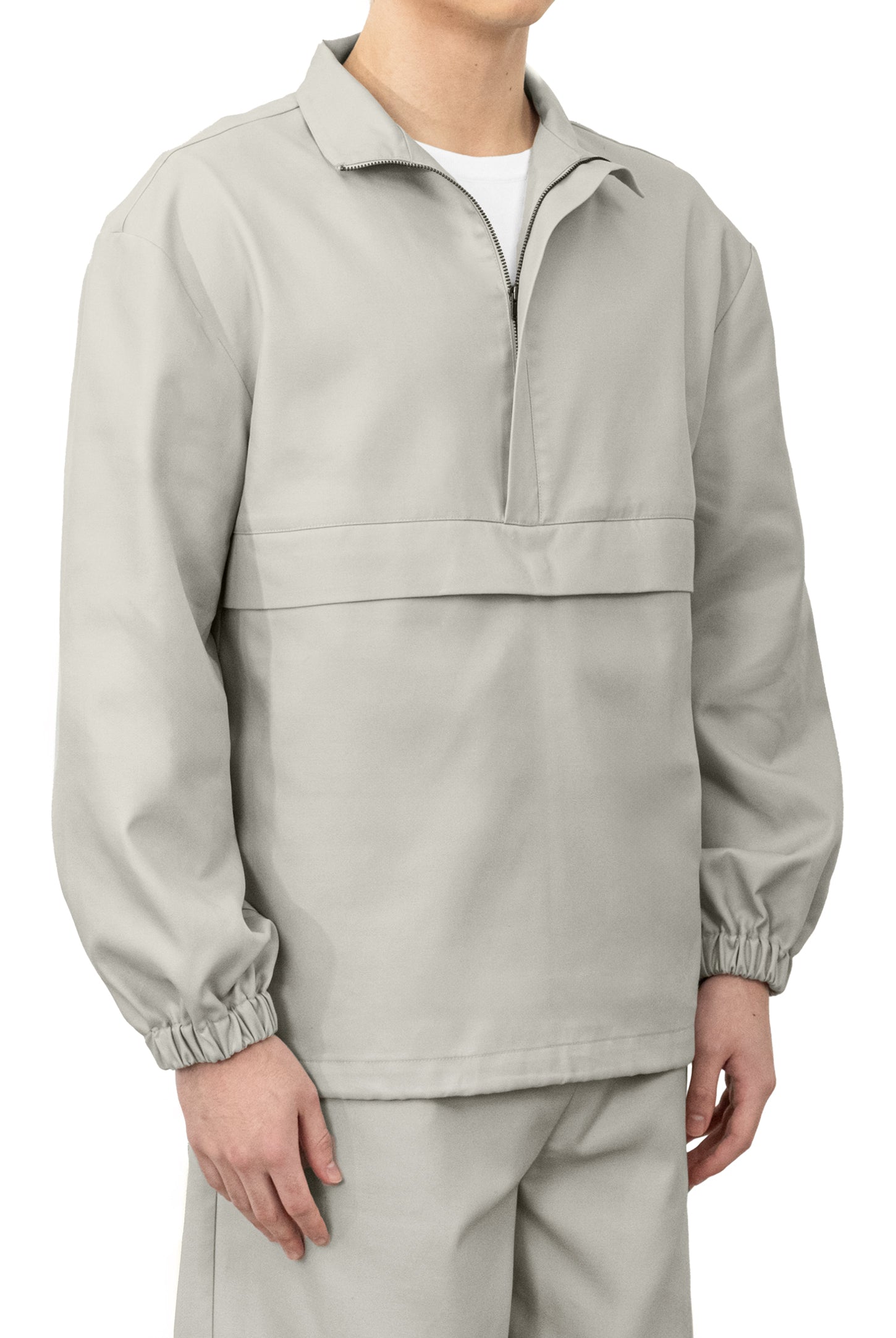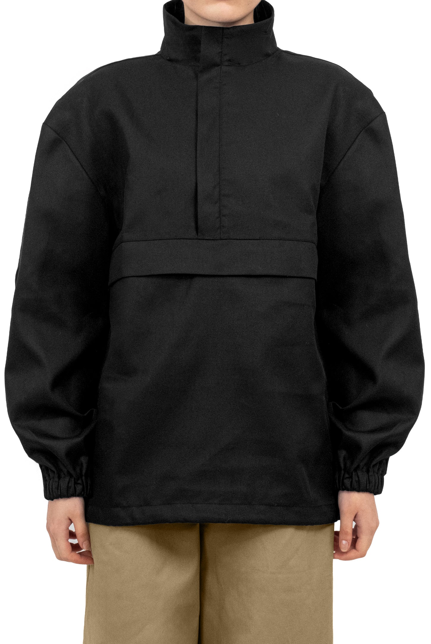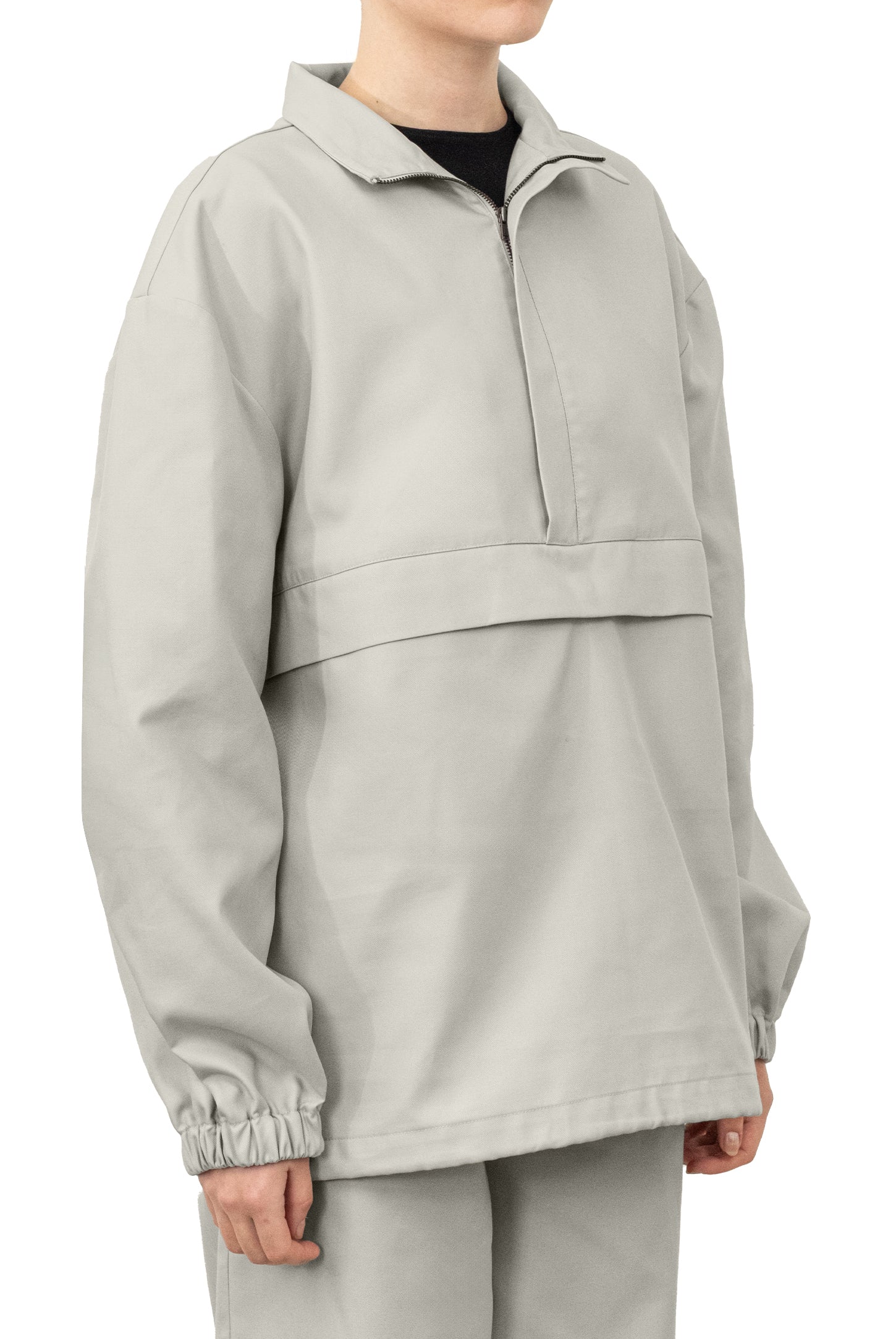 An oversized fit, unisex half-zip pullover with a mock neck, a flap front pocket, an adjustable drawstring hem and cuffs, and a metal logo button.