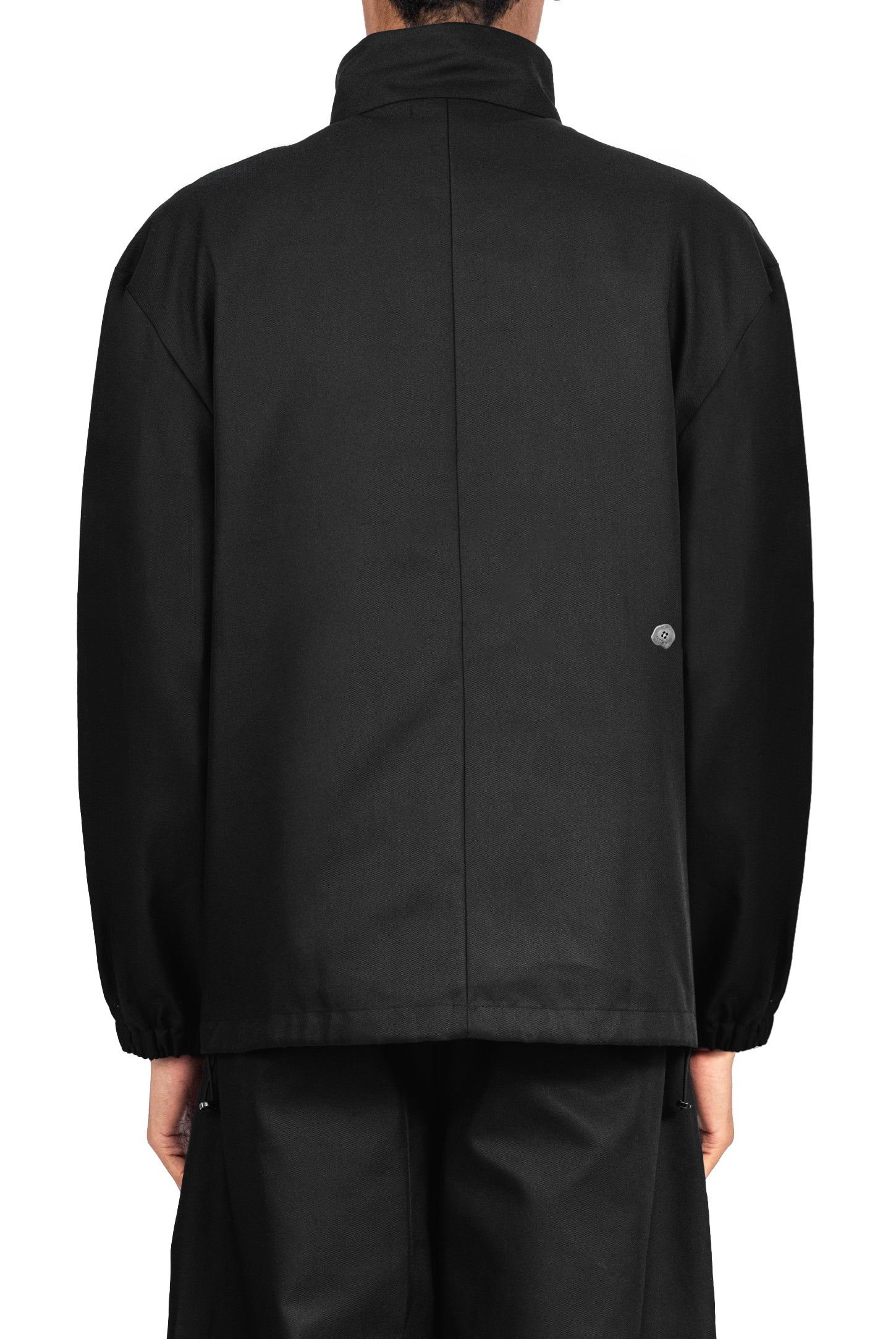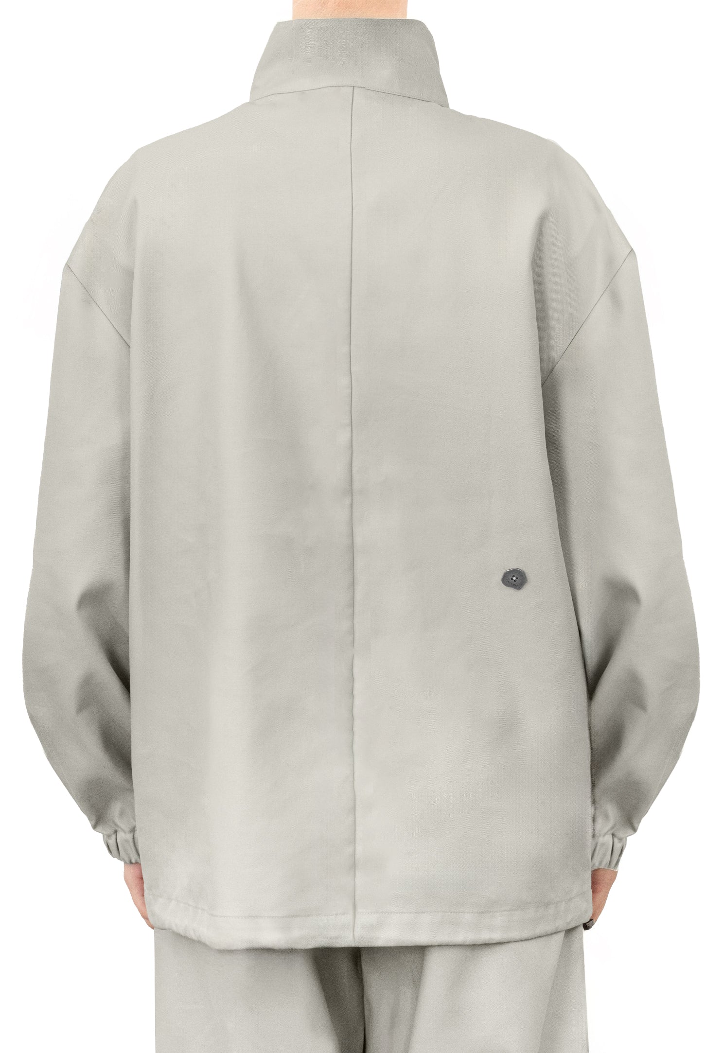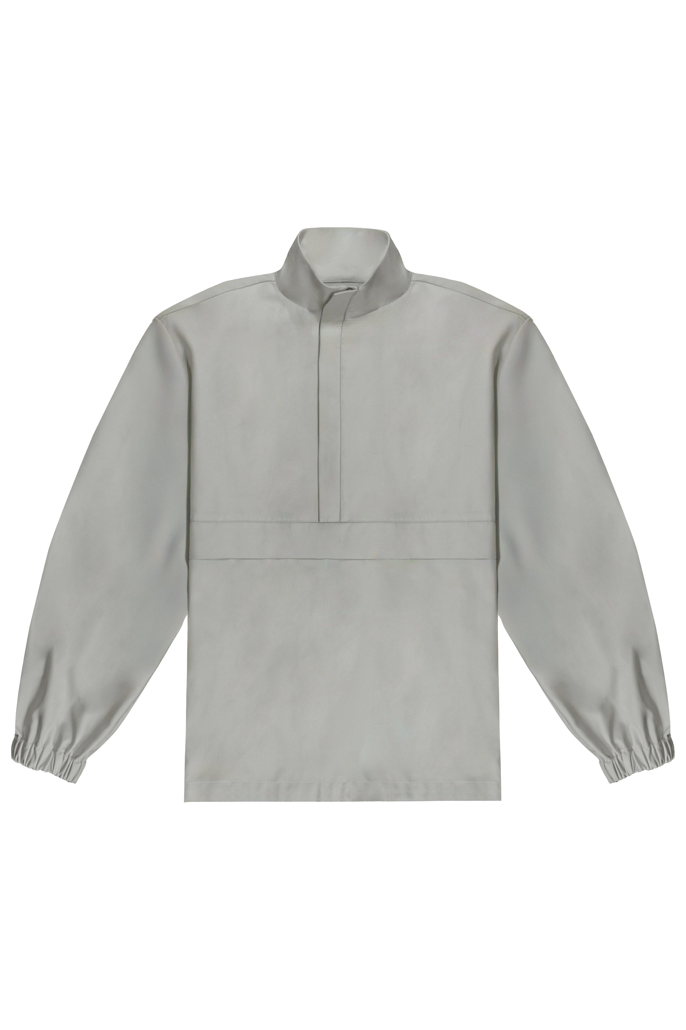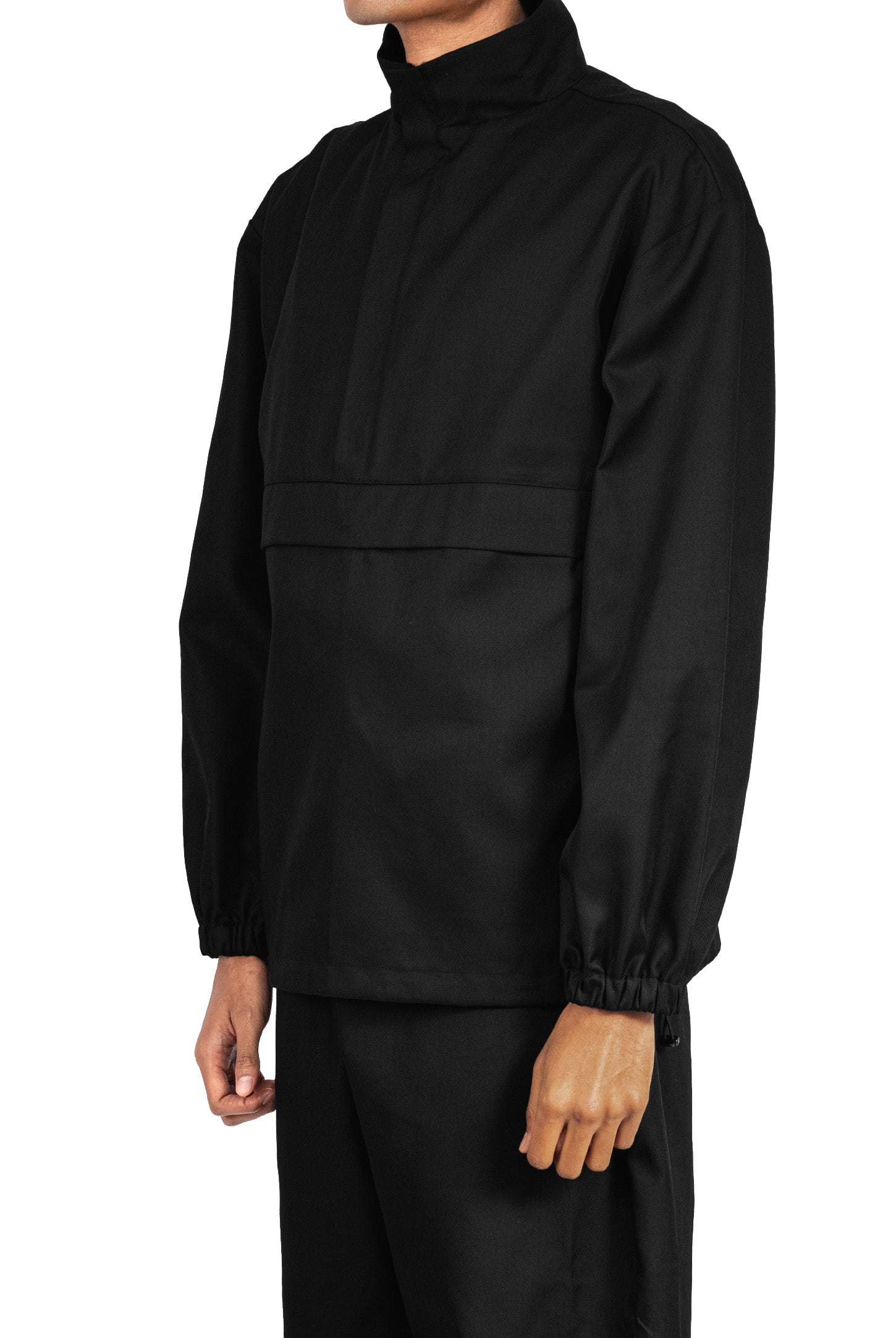 An oversized fit, unisex half-zip pullover with a mock neck, a flap front pocket, an adjustable drawstring hem and cuffs, and a metal logo button.