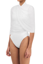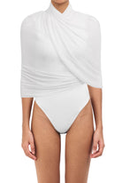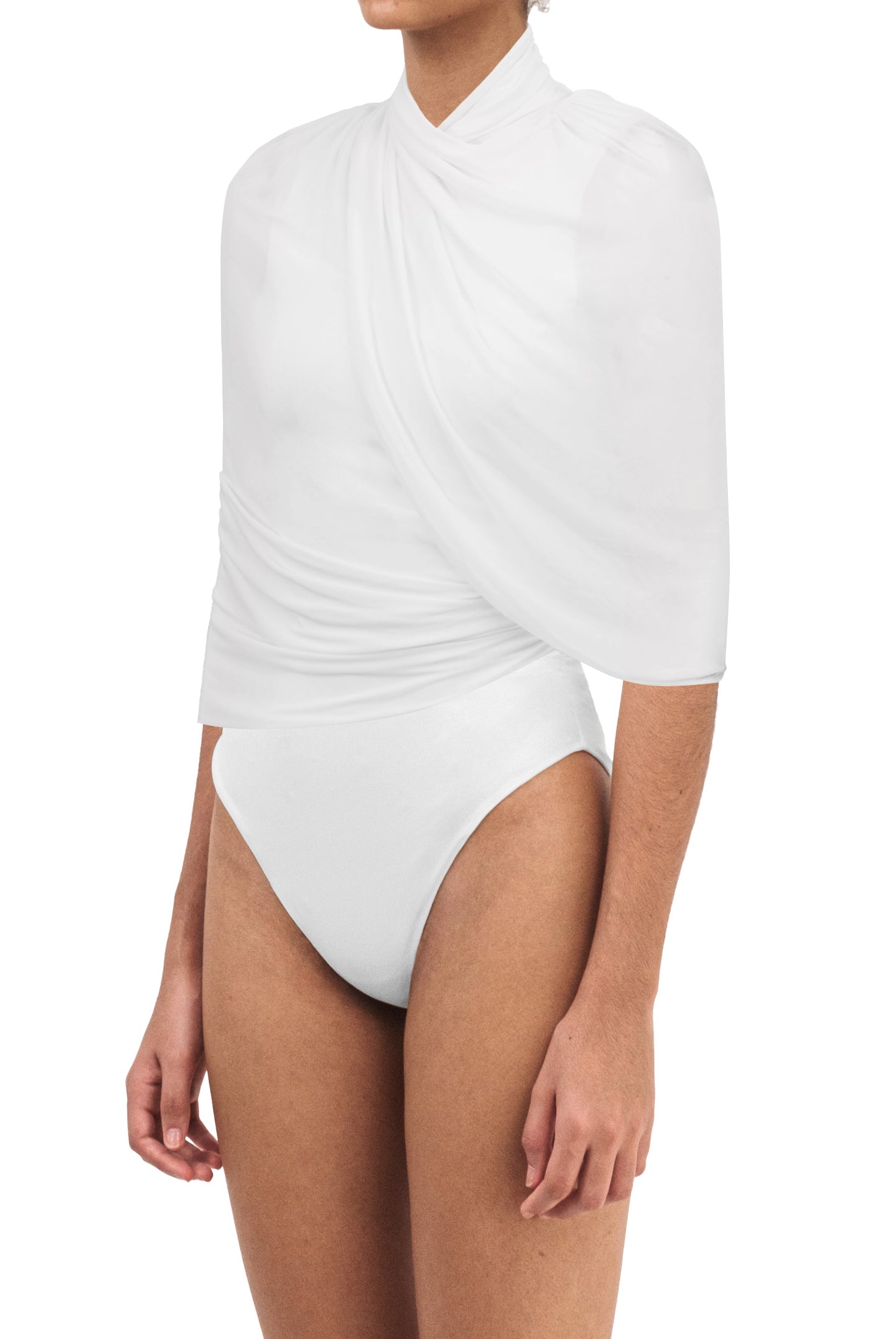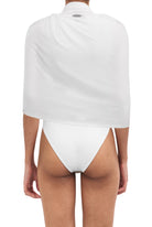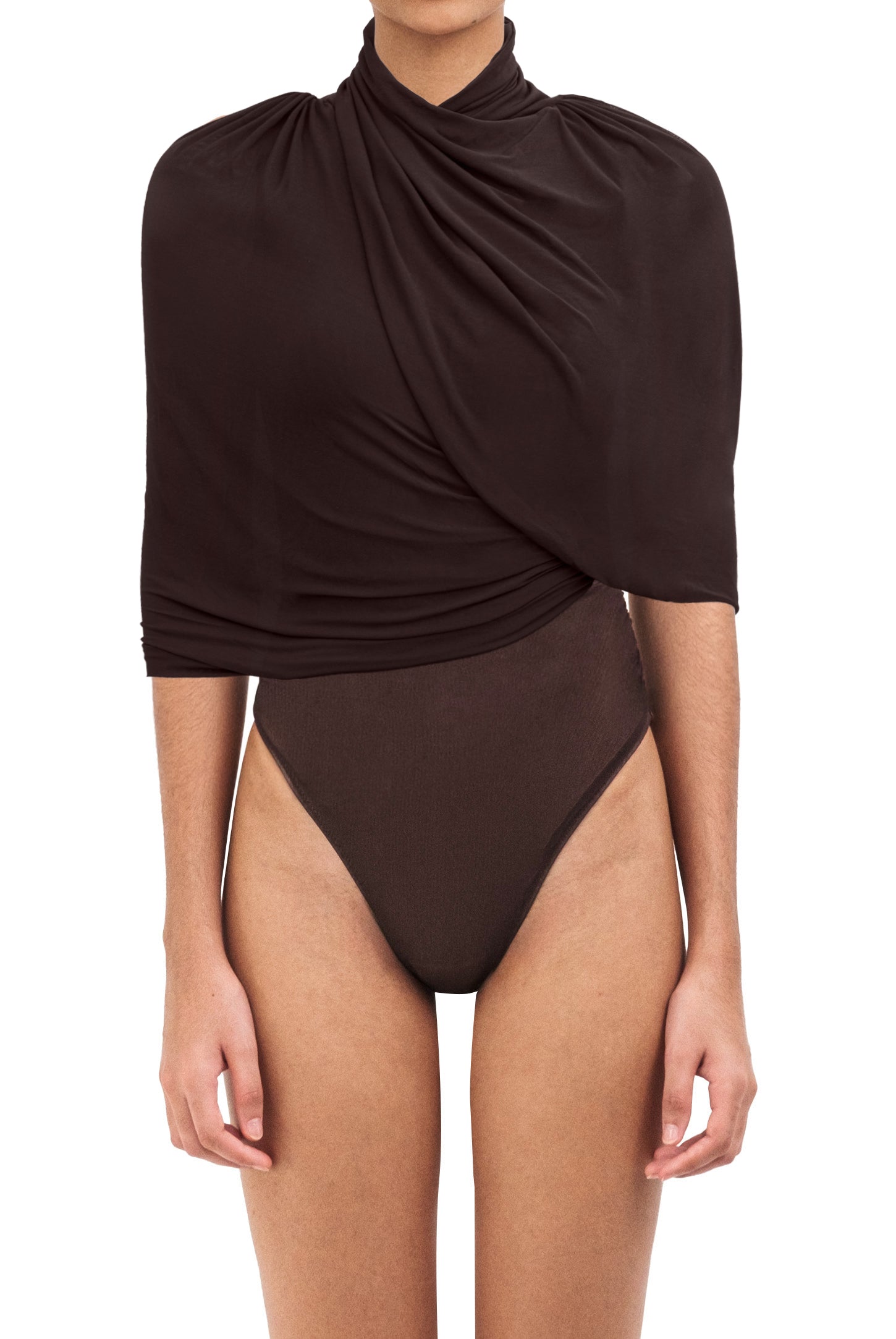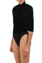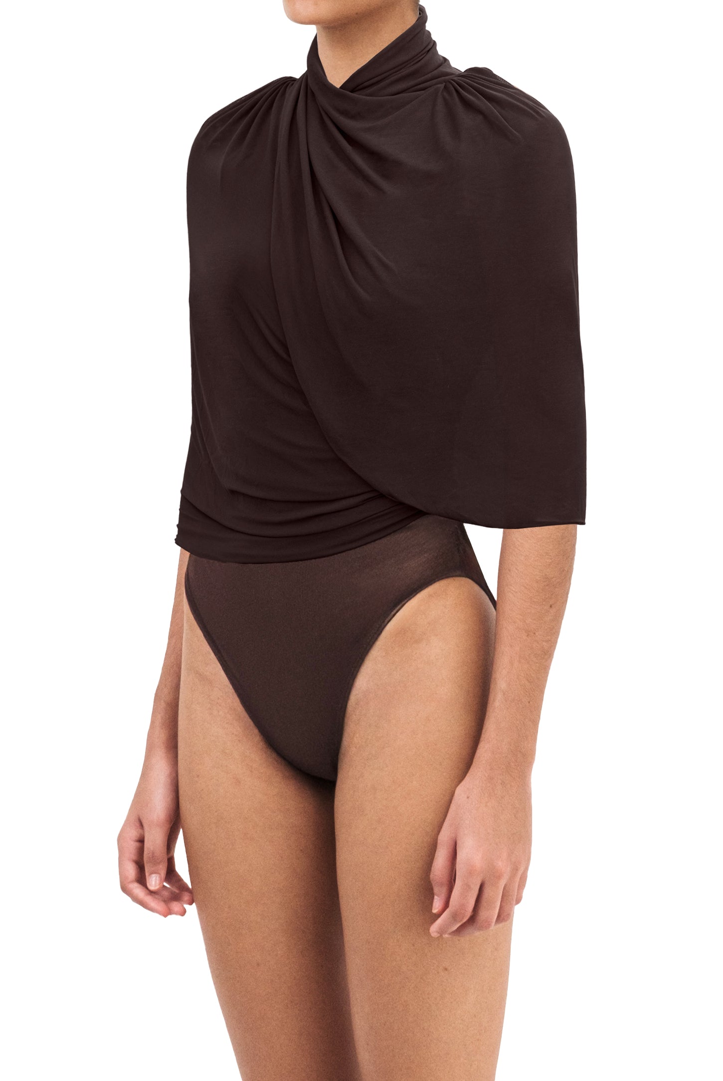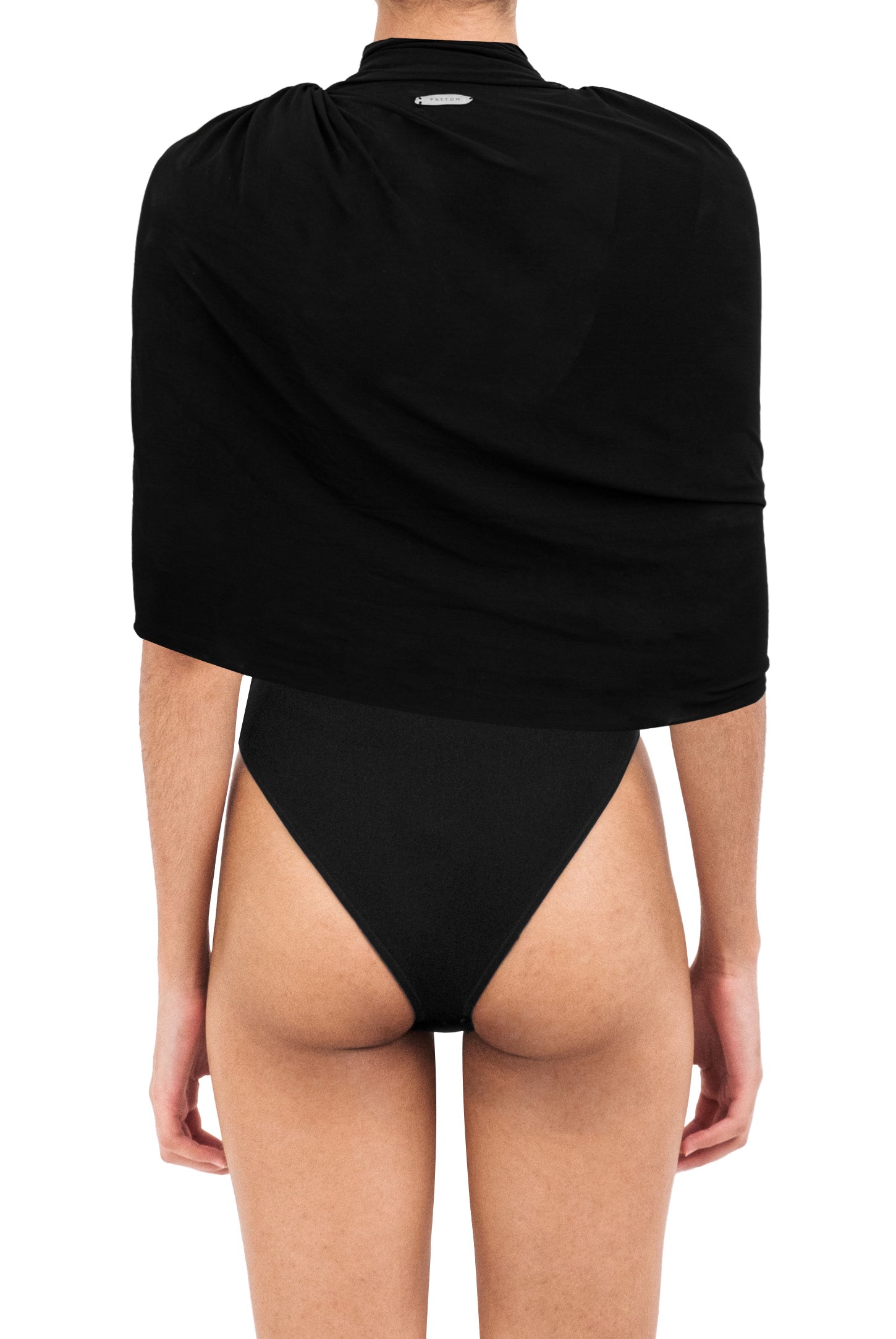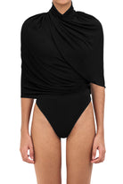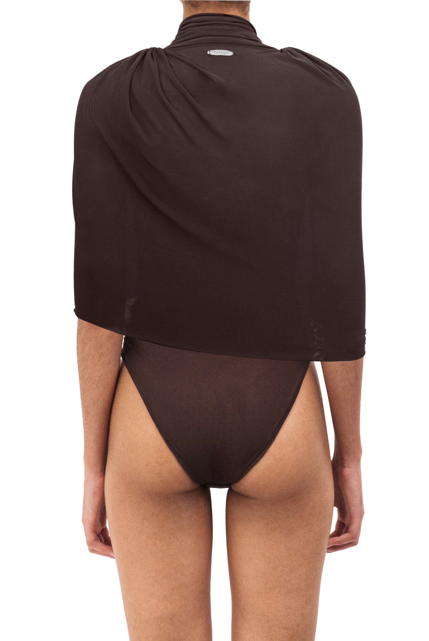 A fitted sleeveless round-neck bodysuit with a low back, snap button closures, a layered wrap-around mesh design, and a metal logo.
