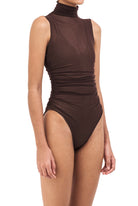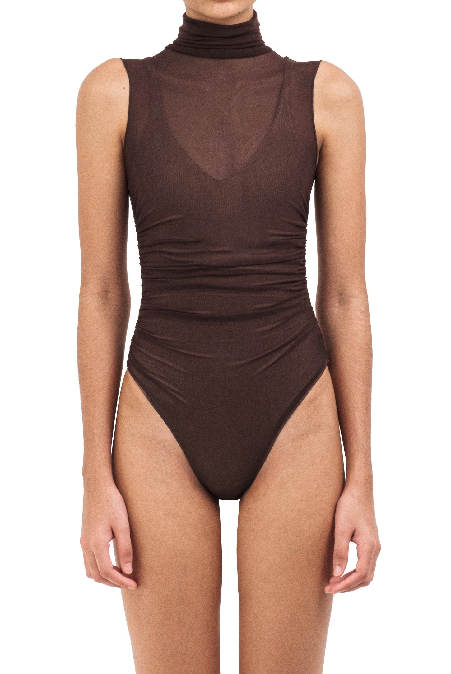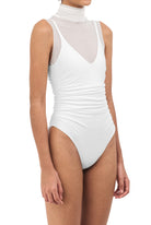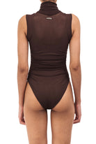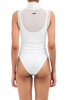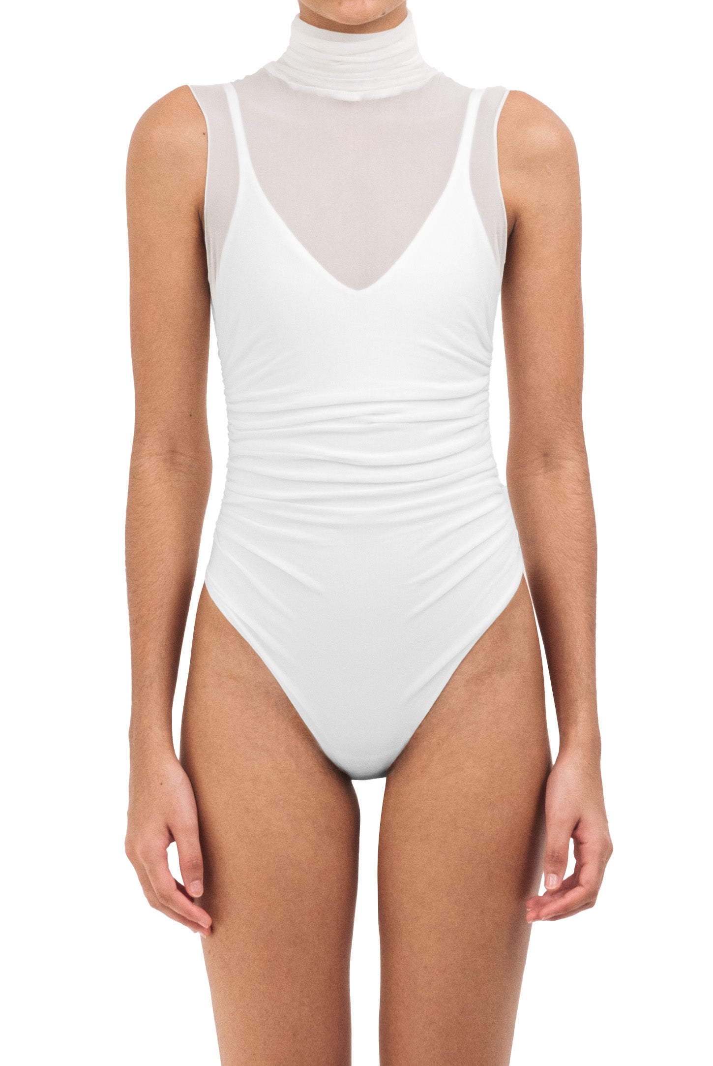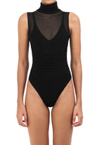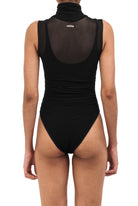 A fitted sleeveless bodysuit with a scoop v-neckline and snap button closures, layered with a sleeveless sheer mesh featuring a turtleneck, shirred detailing on the body, and a metal logo.