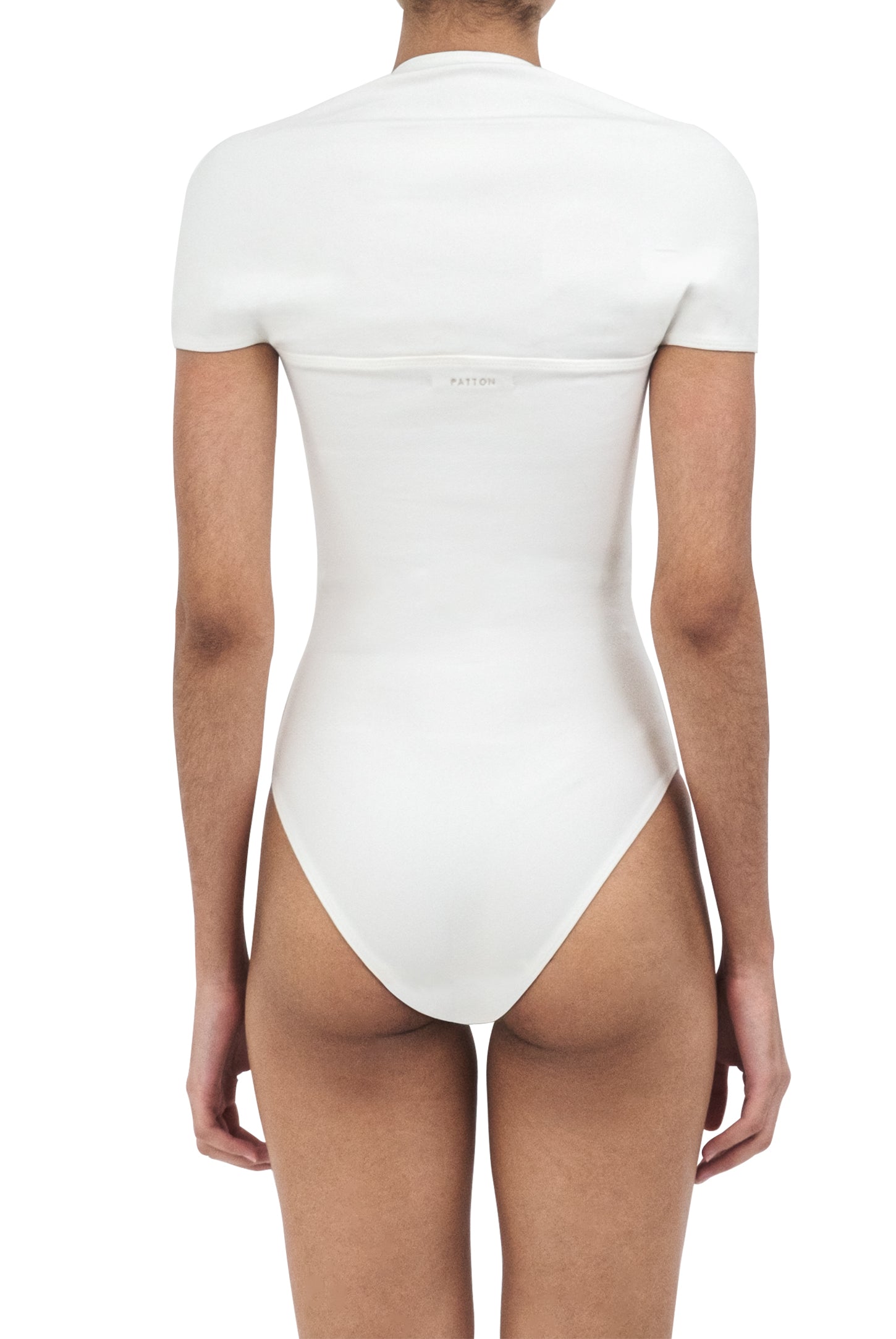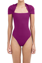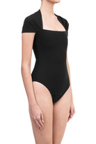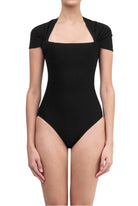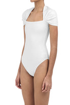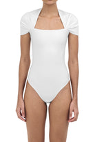 A ruched short-sleeve bodysuit with a square neckline, snap buttons, and an embroidered logo.