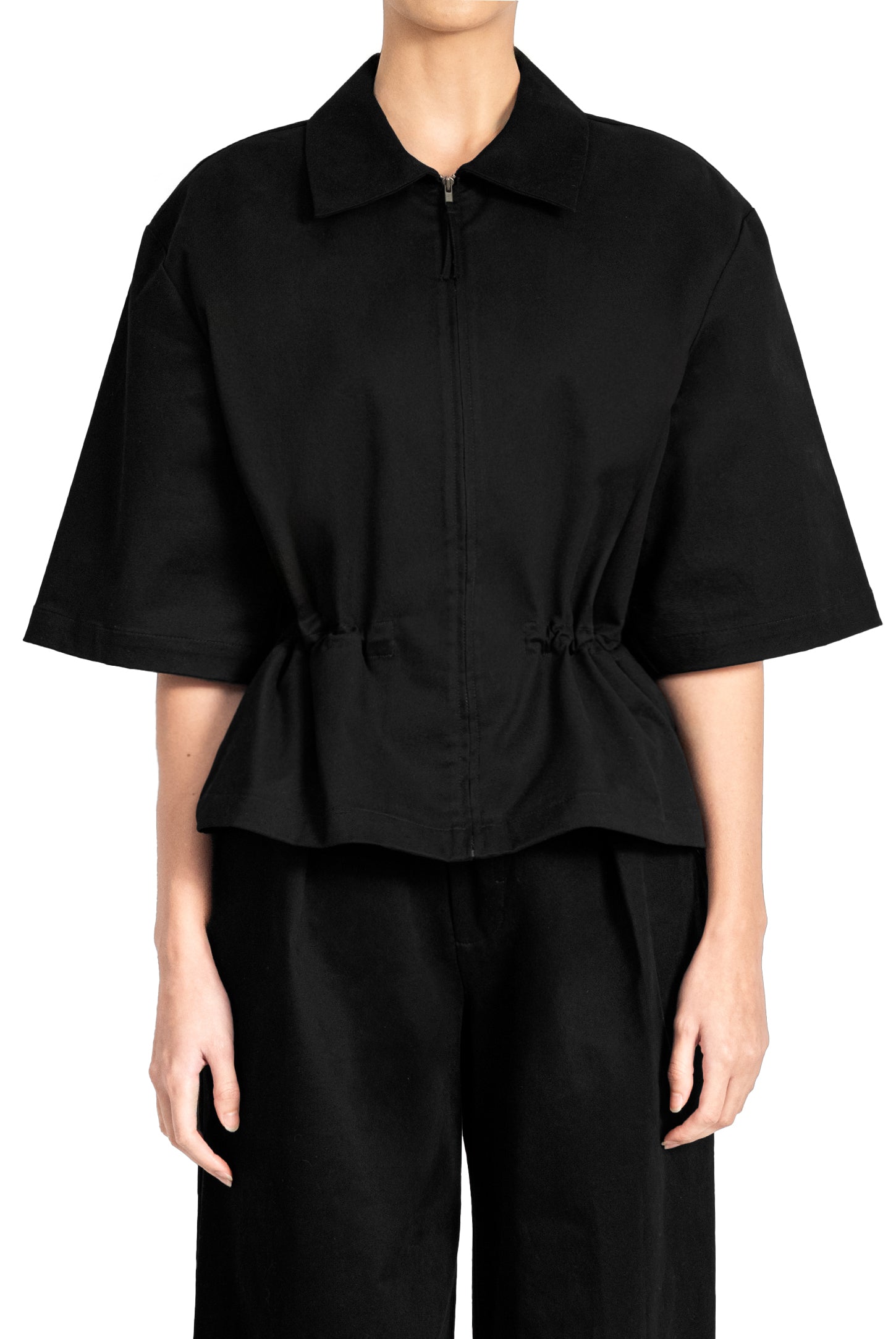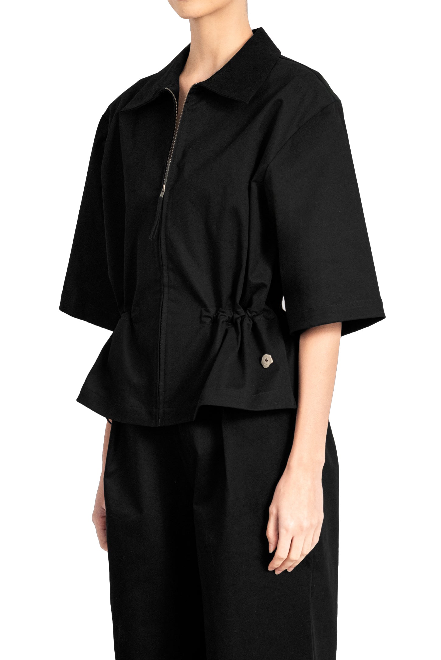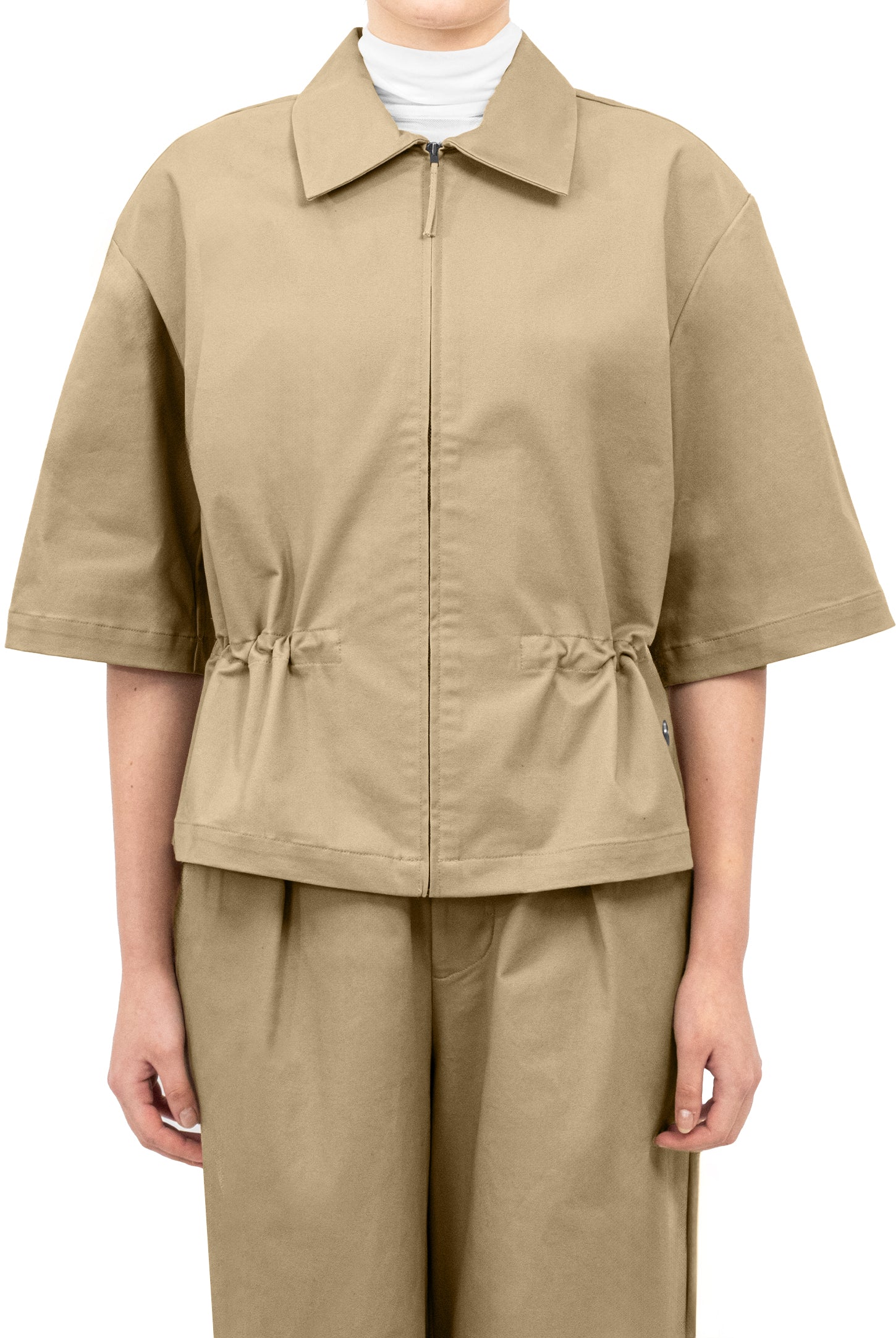A oversized fit, short-sleeve jacket with a classic collar and zip closure with fabric slider, an adjustable drawstring waist, and a metal button logo.