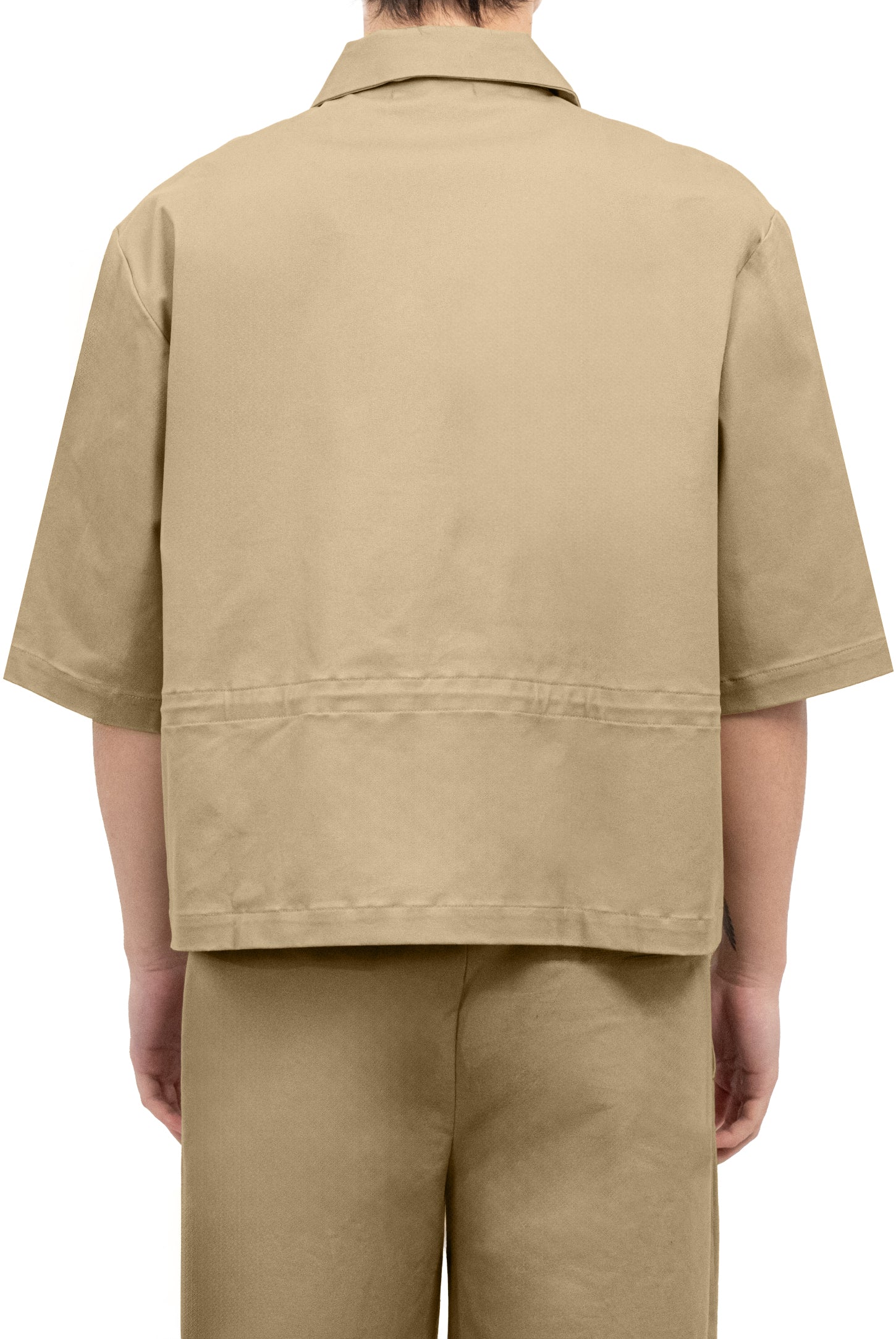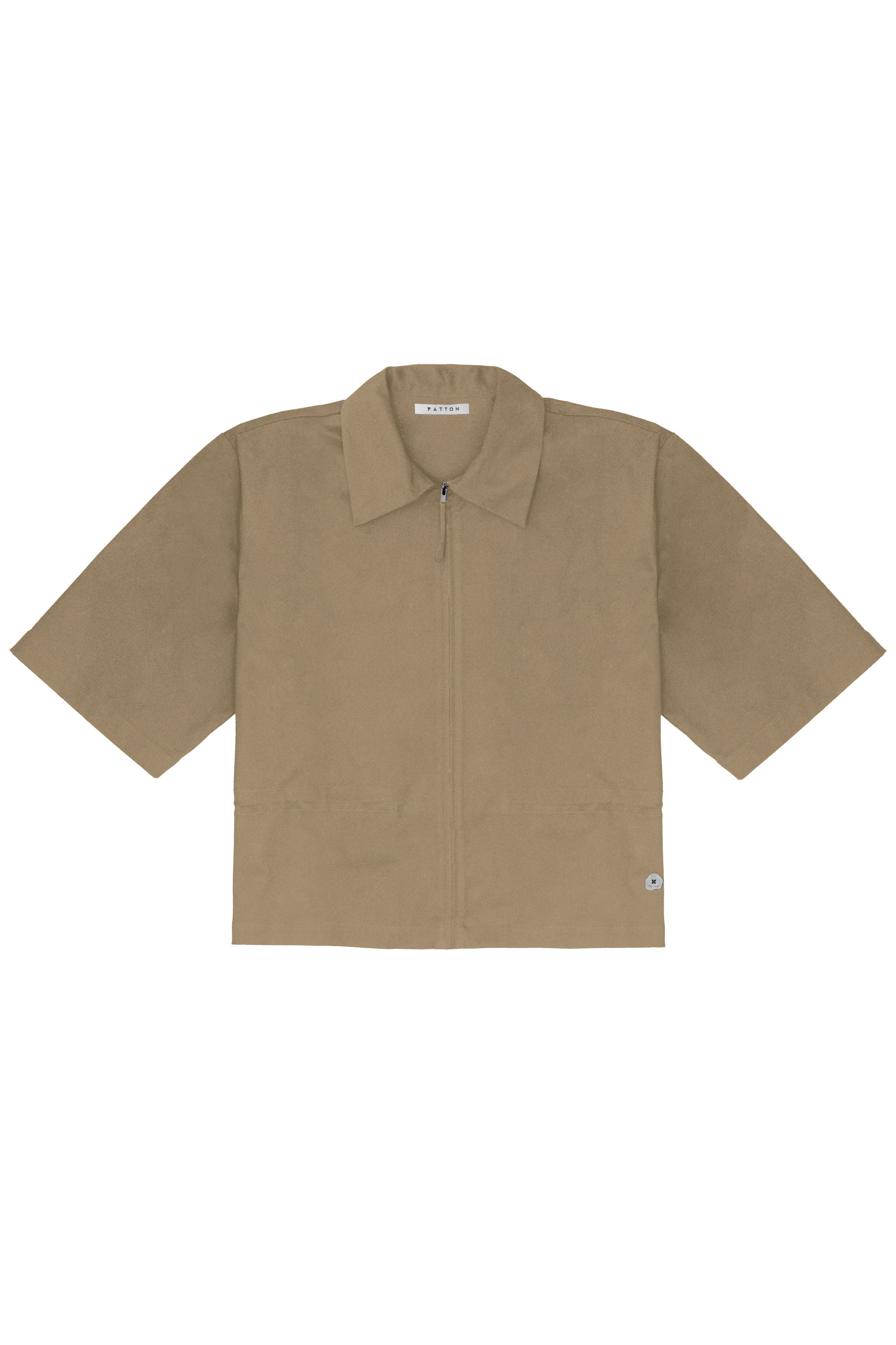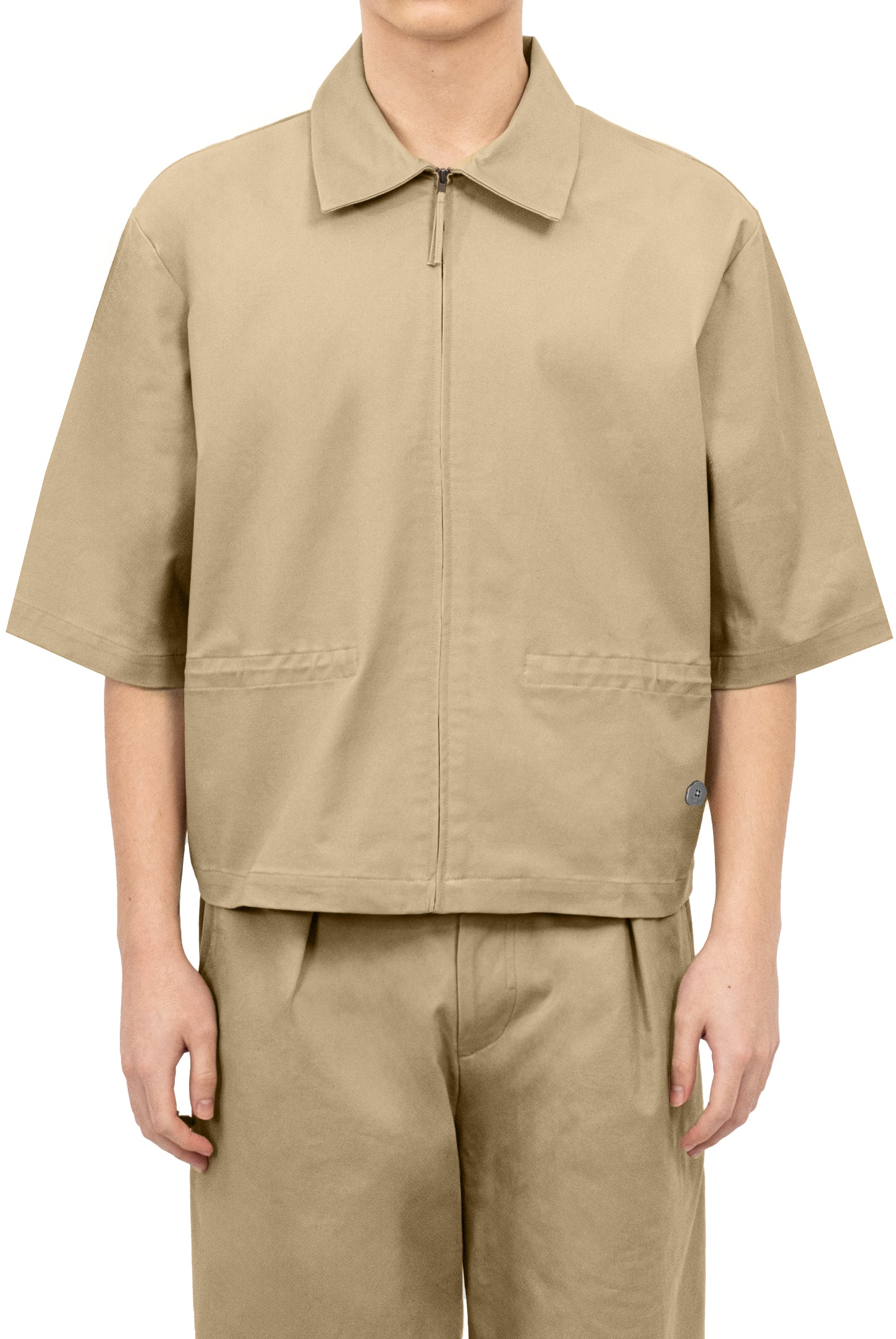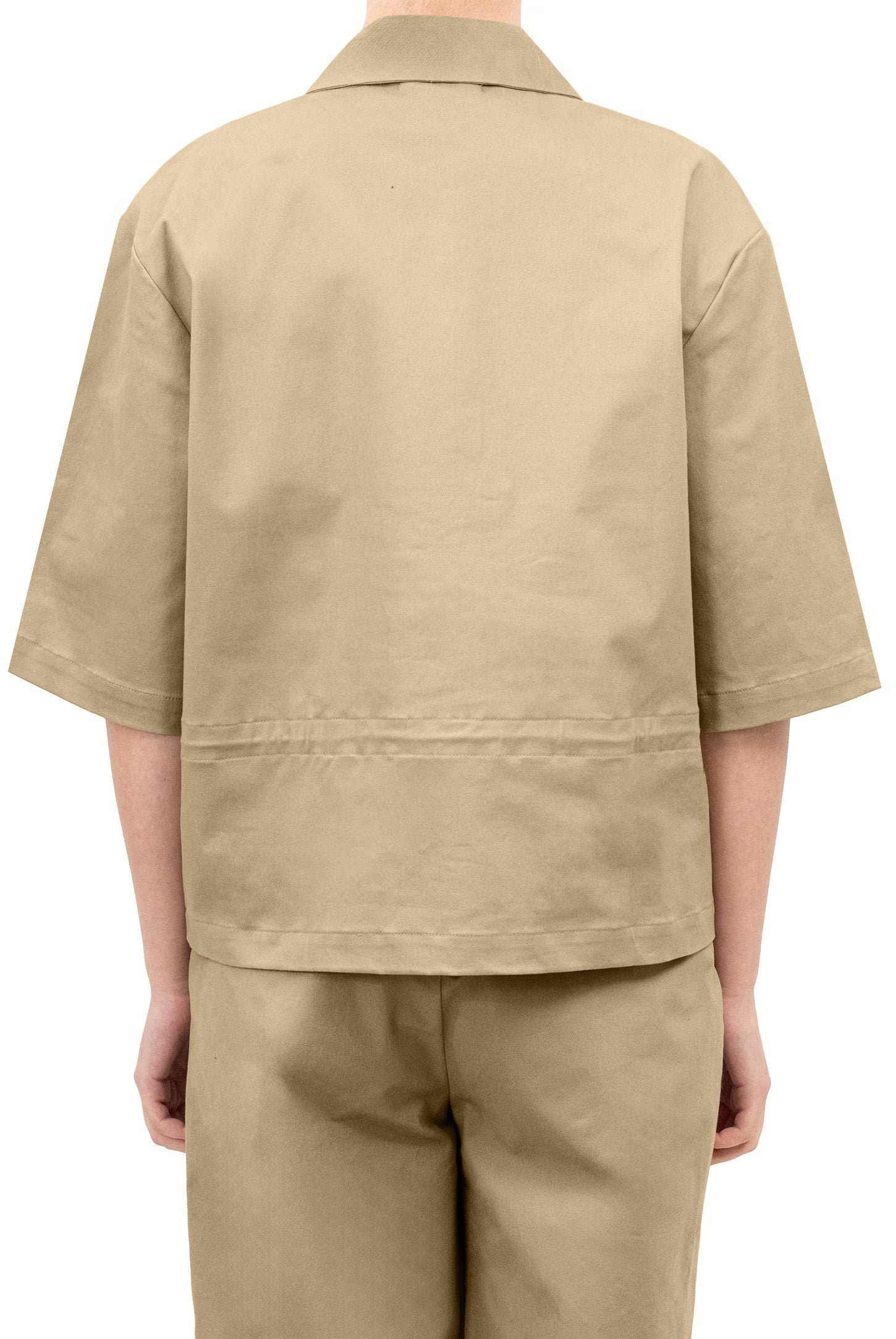 A oversized fit, short-sleeve jacket with a classic collar and zip closure with fabric slider, an adjustable drawstring waist, and a metal button logo.
