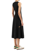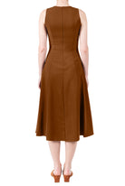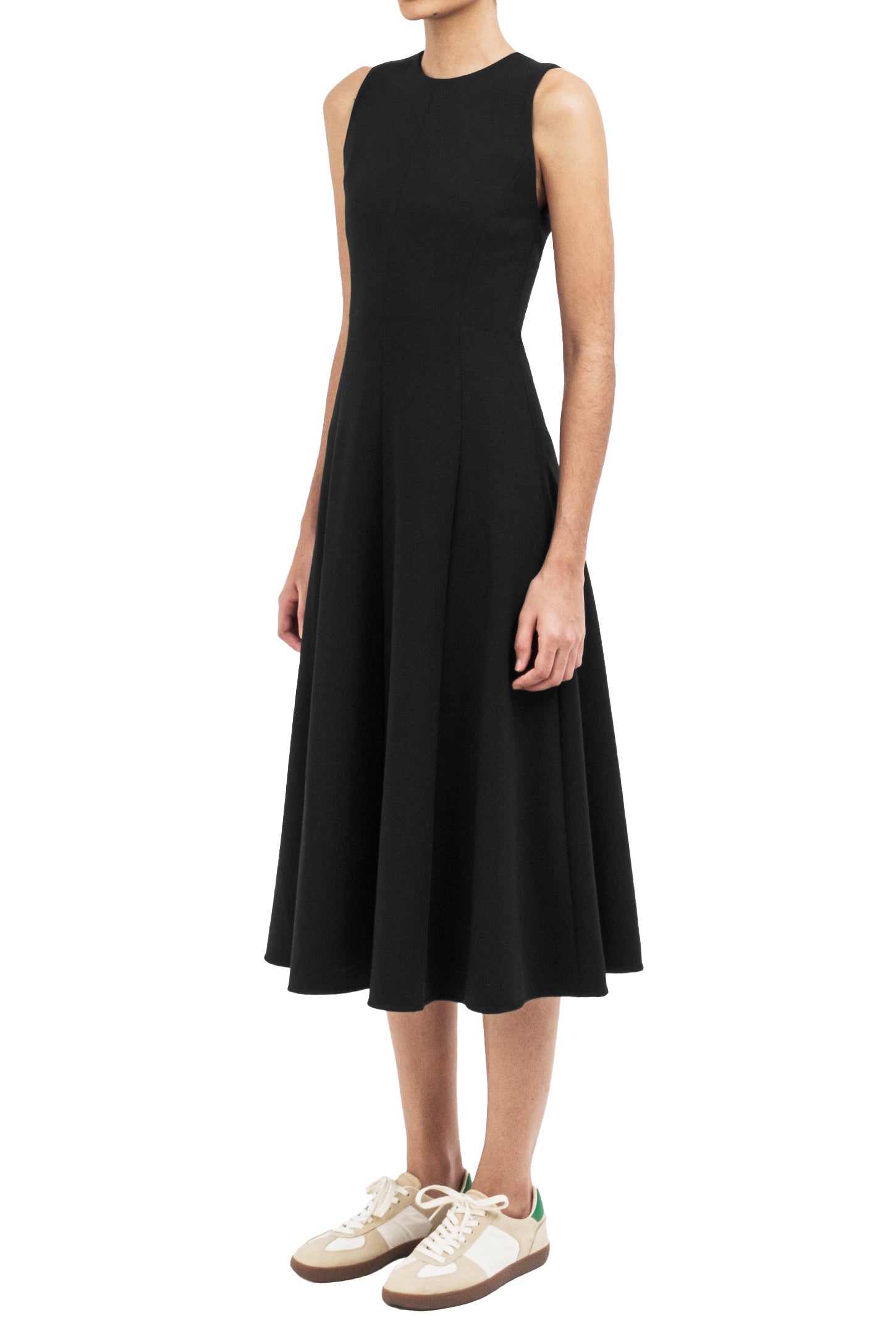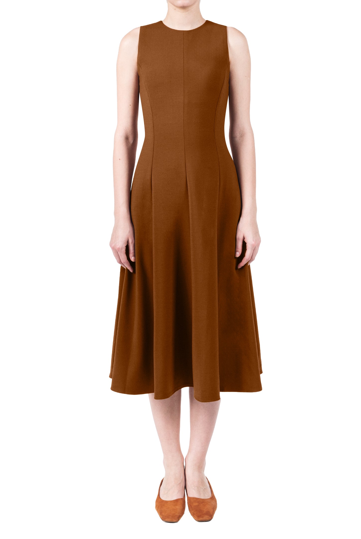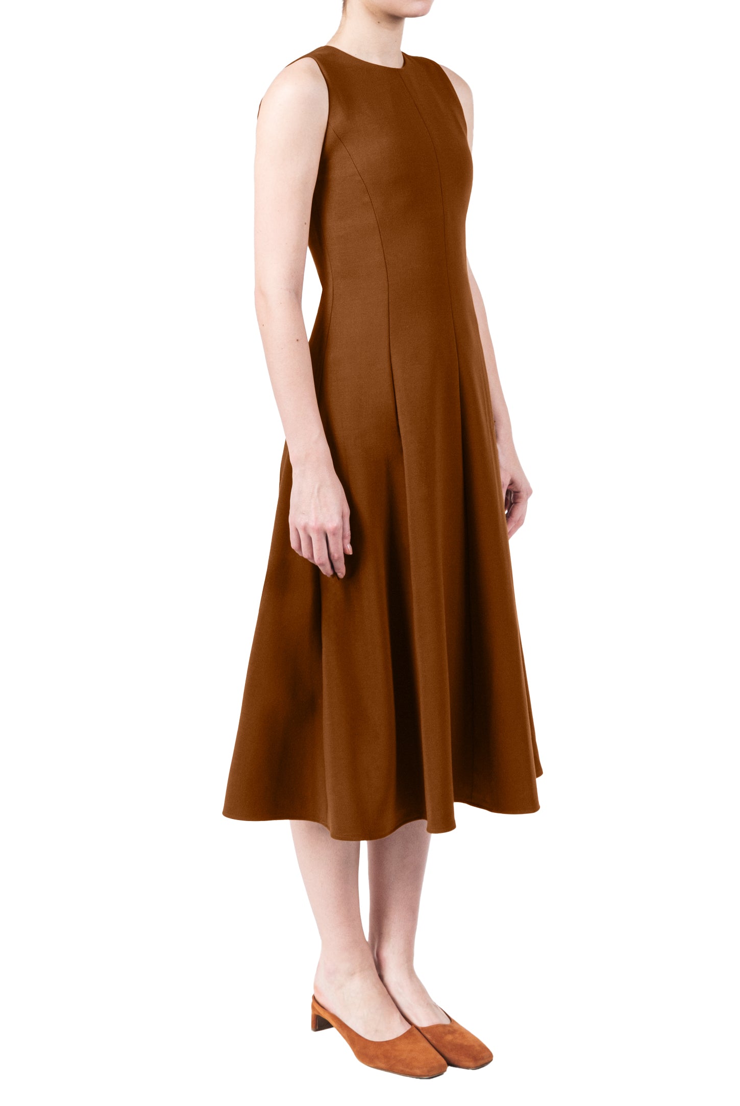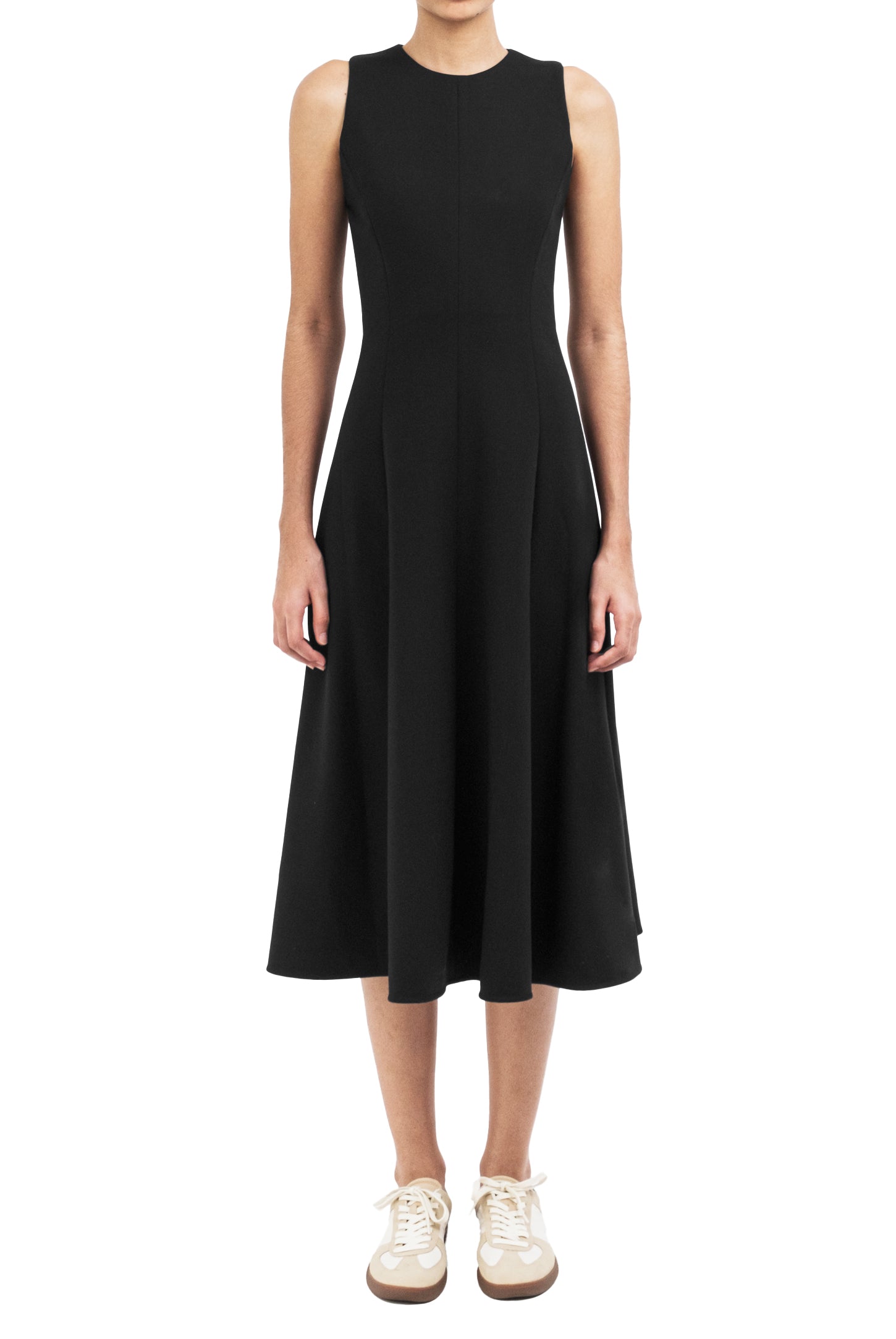 A sleeveless dress with a relaxed fit, crew neckline, invisible zipper closure at the back, curved side slit, full lining, and a jacron label.