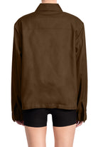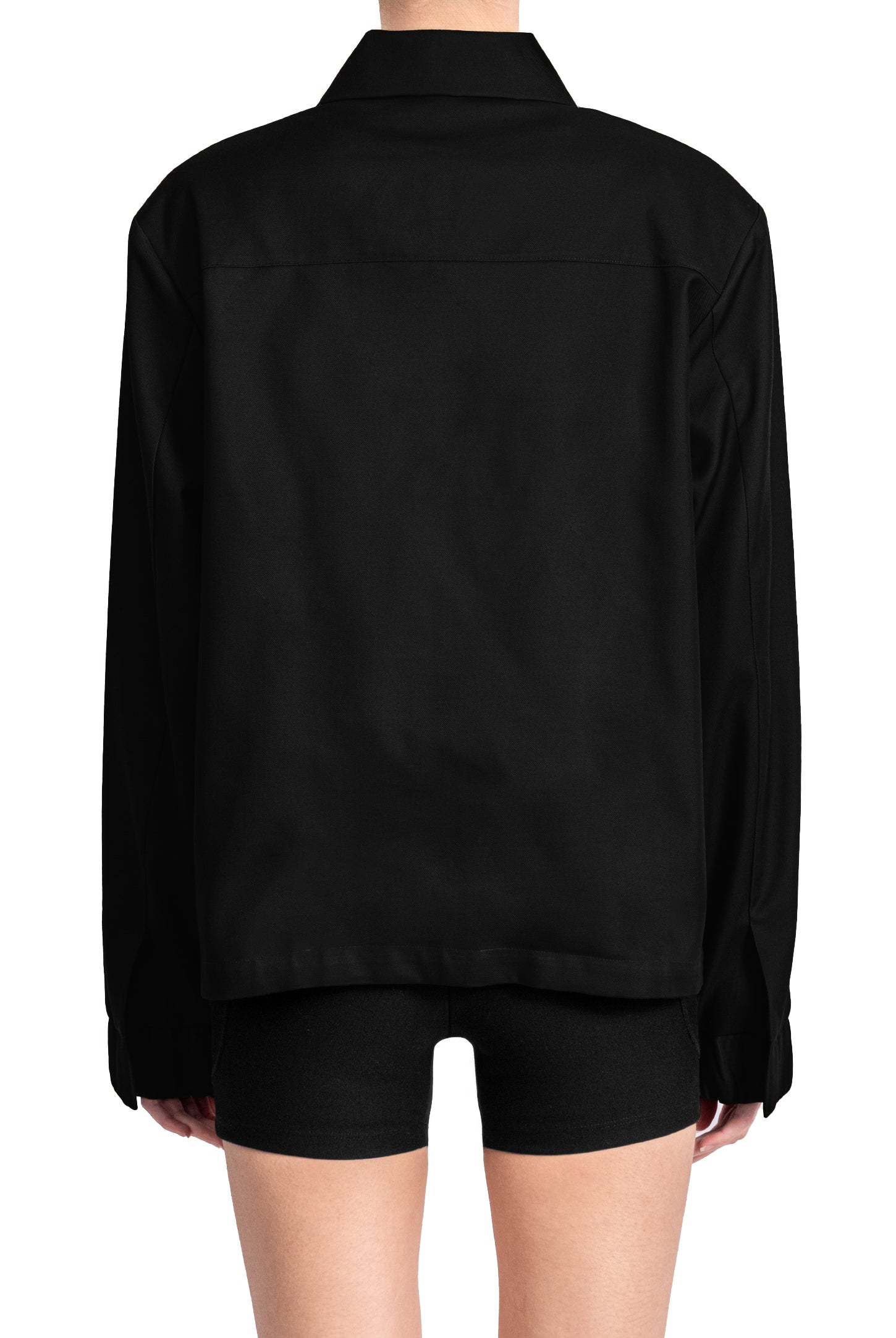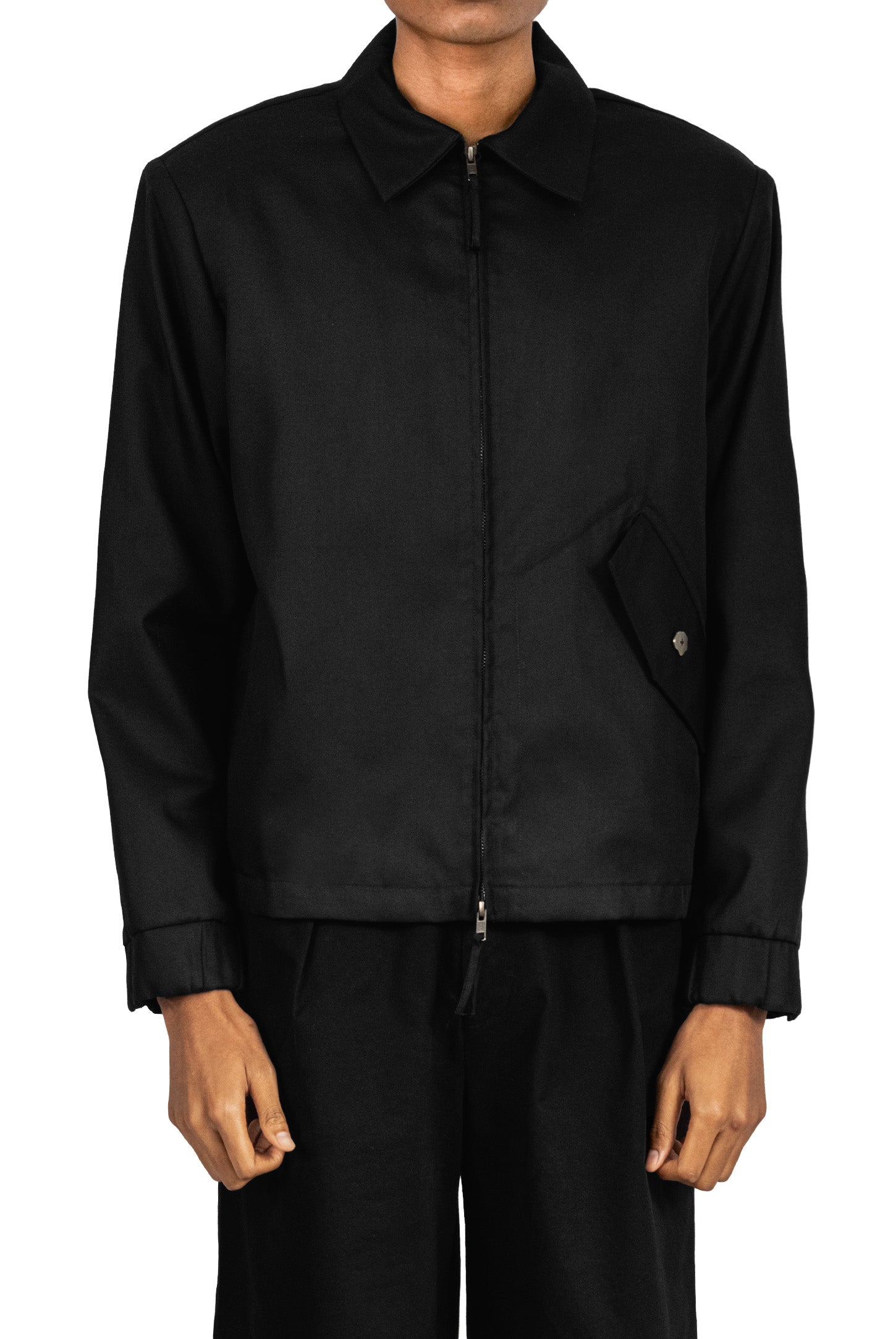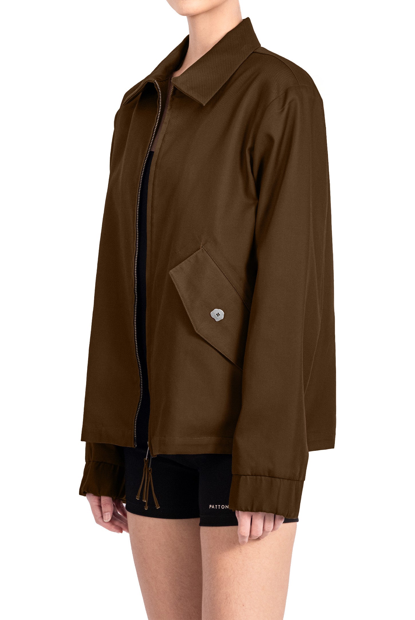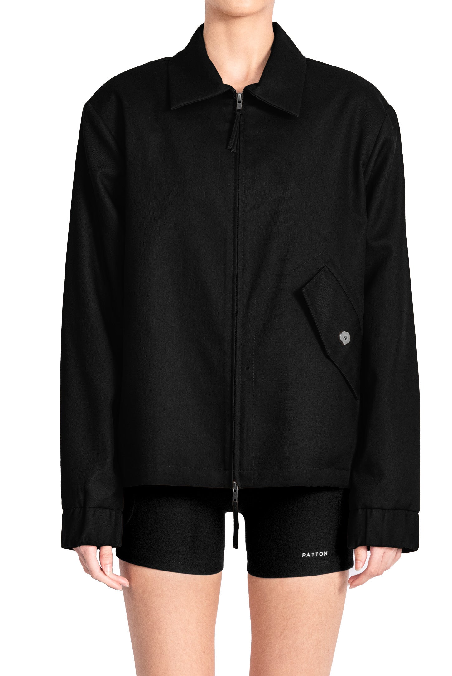 A relaxed fit, unisex jacket with a classic collar and two-way zip closure with fabric slider, gartered cuffs, an oversized flap side pocket with metal button logo, and an inner pocket.
