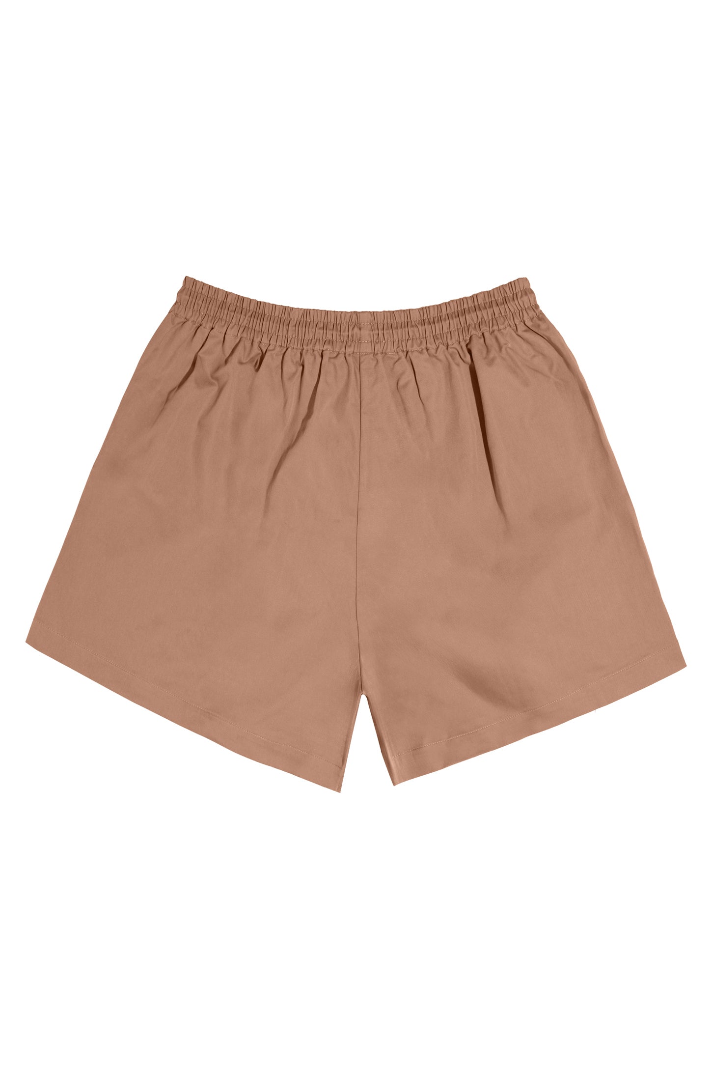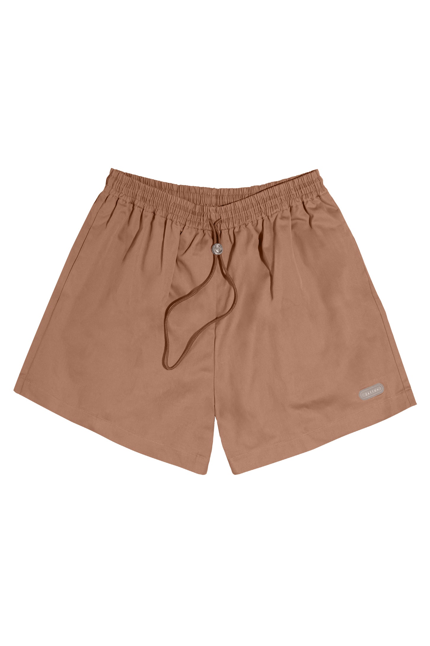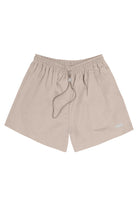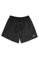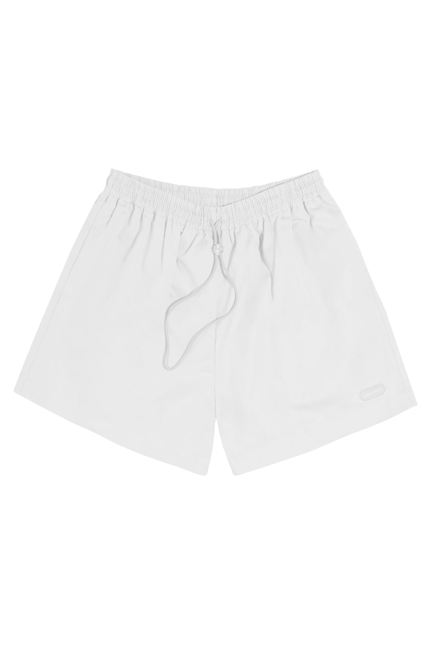 Mid-rise unisex shorts with a gartered drawstring waistband, side pockets, and a rubber patch logo.
