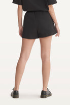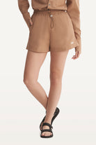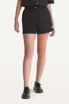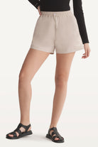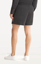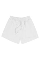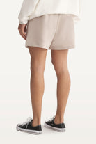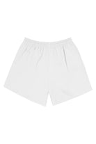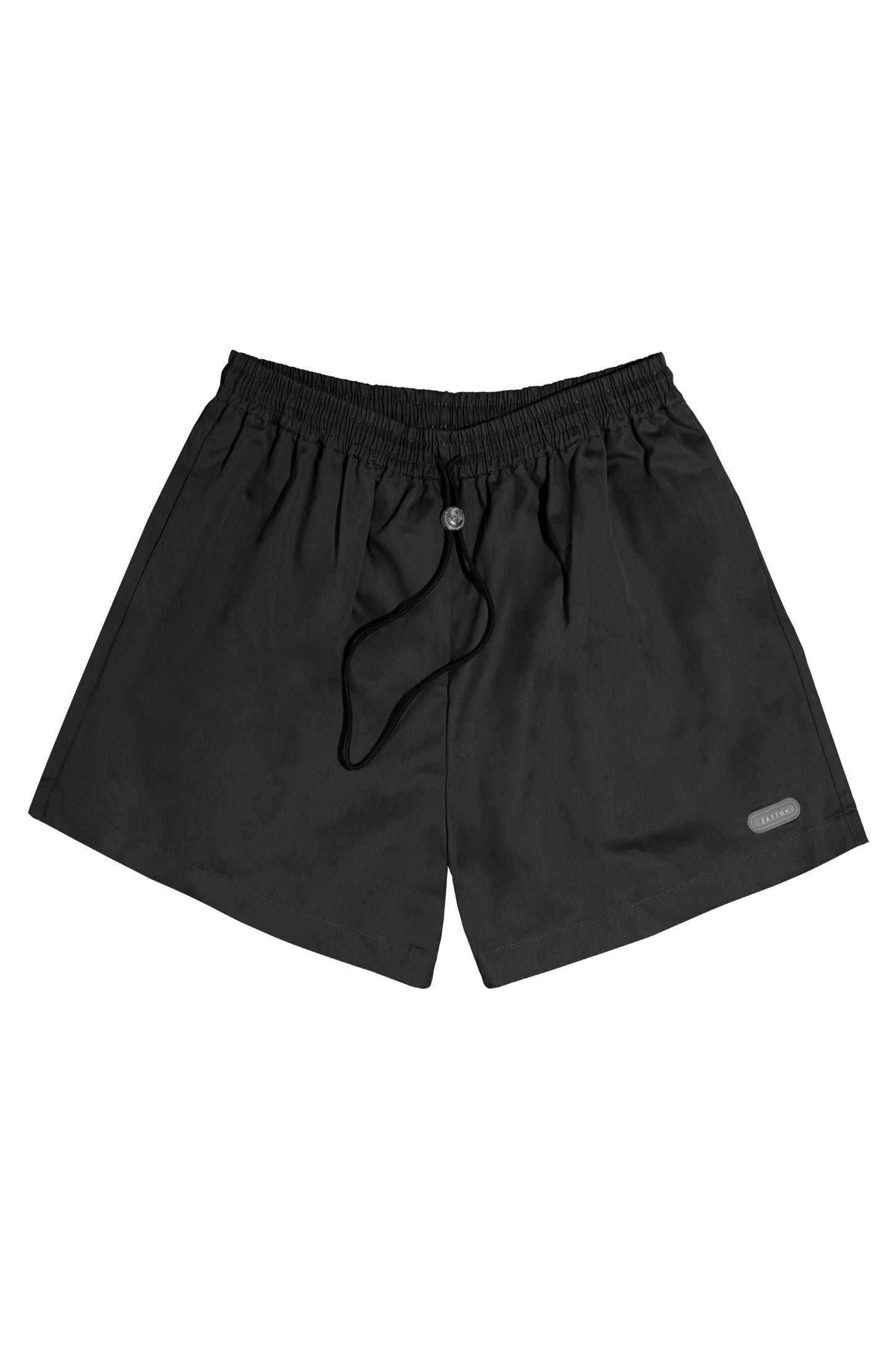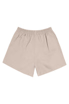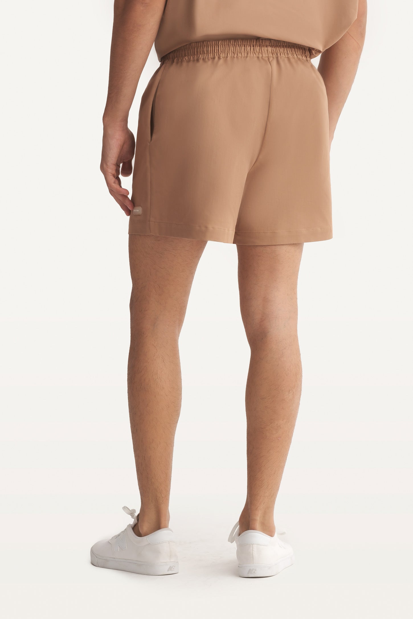 Mid-rise unisex shorts with a gartered drawstring waistband, side pockets, and a rubber patch logo.