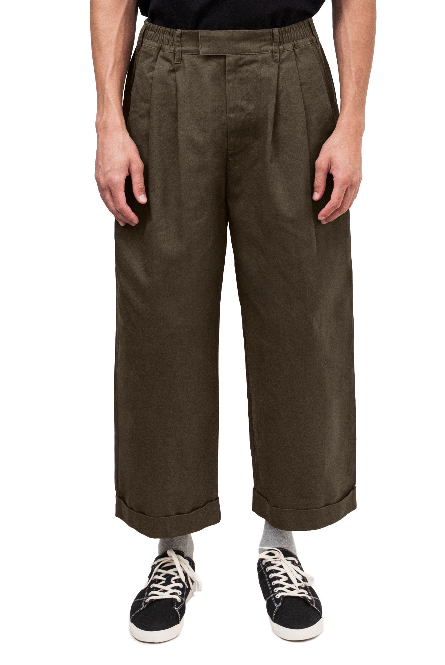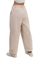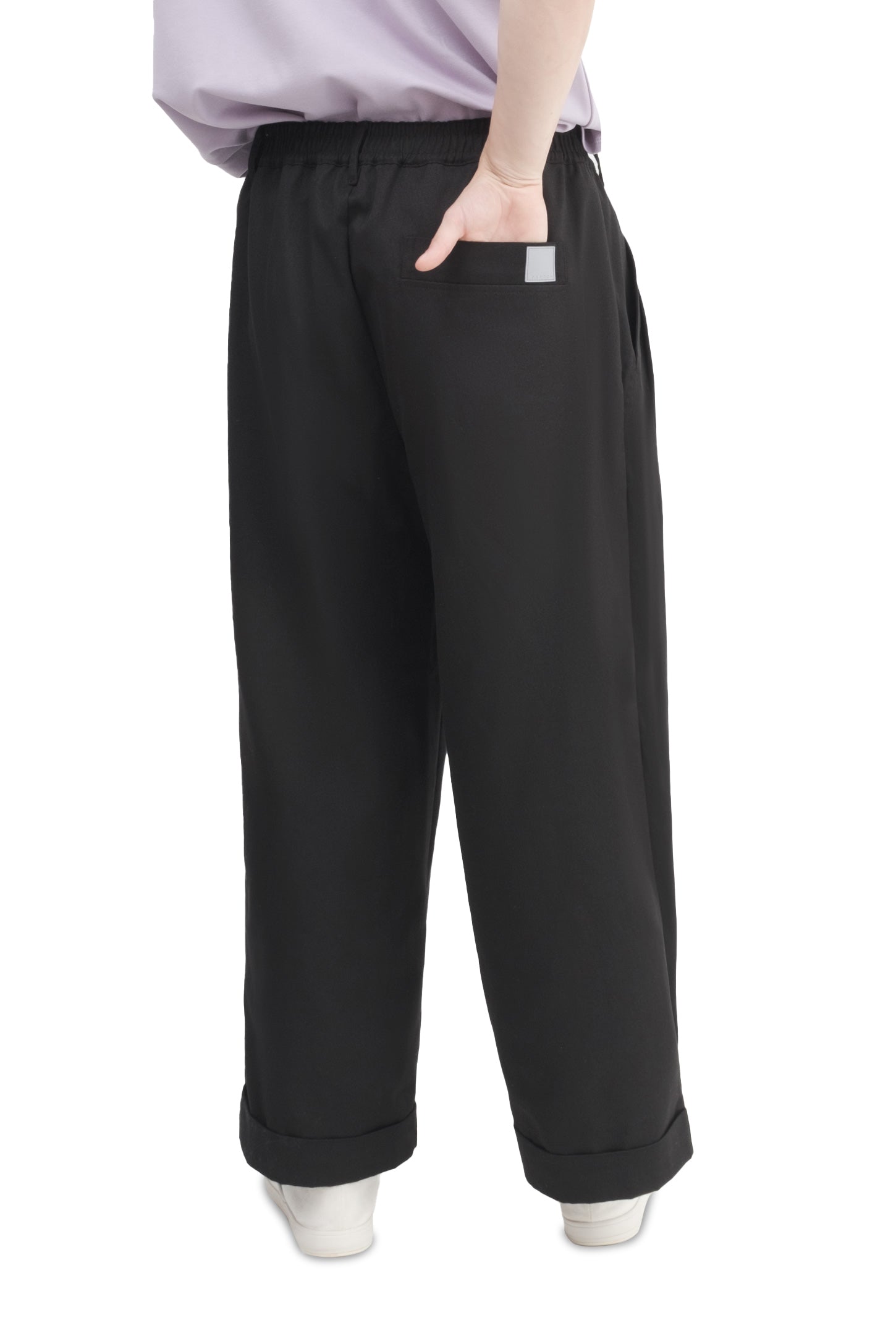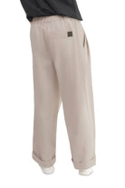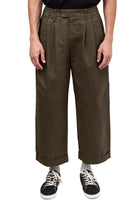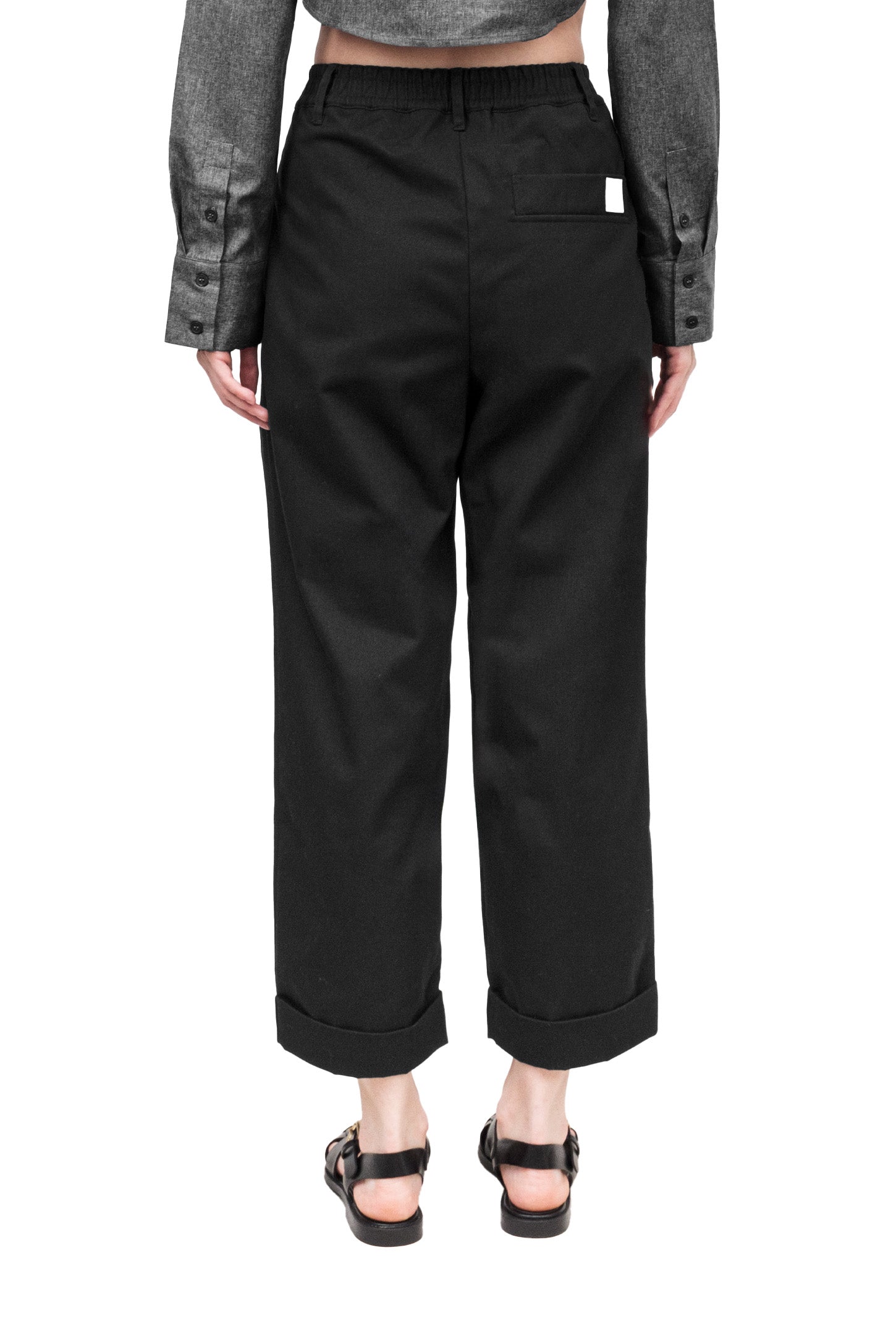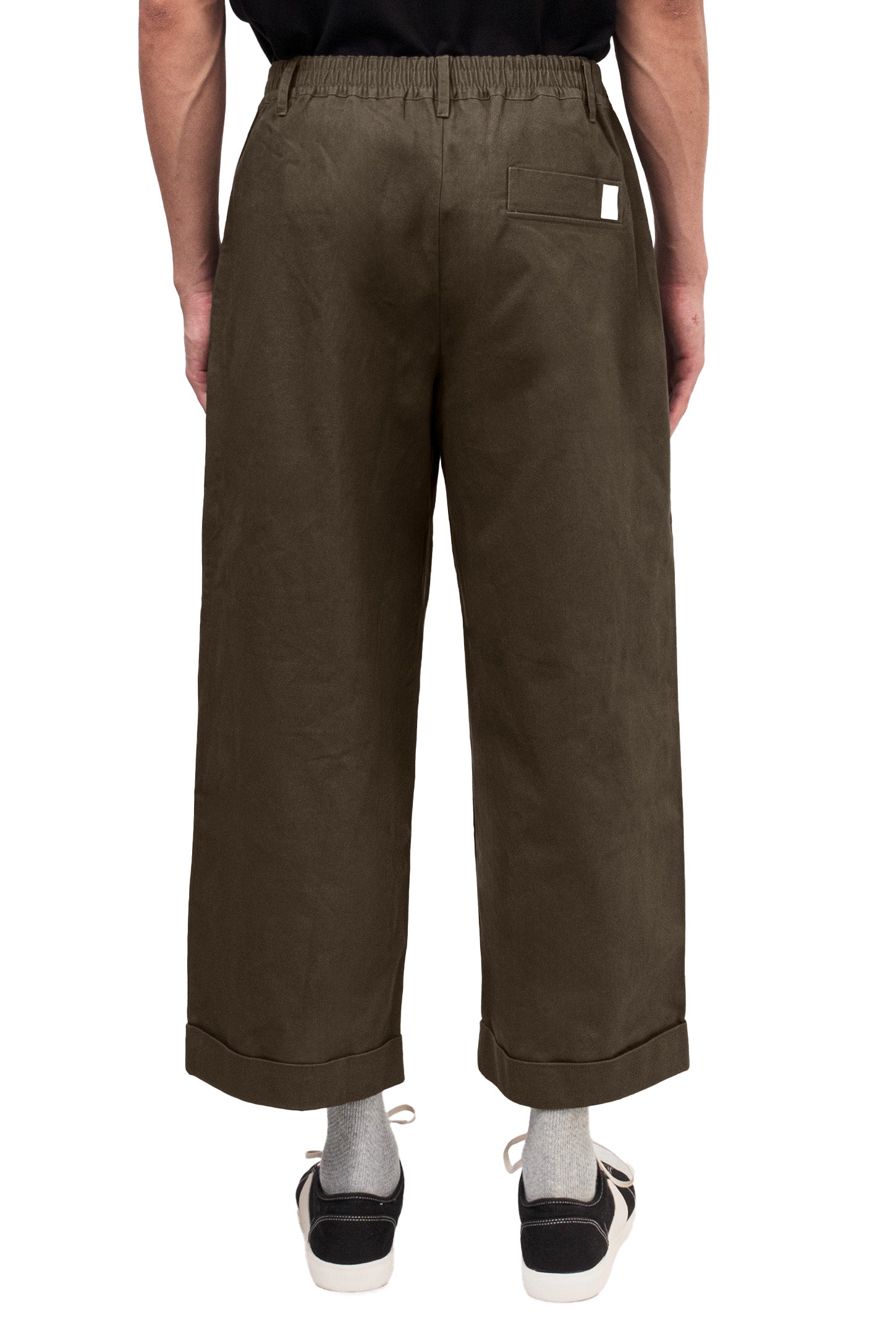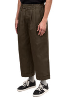 Relaxed-fit, unisex trousers that feature a gartered waistband with belt loops, a snap button and zipper closure, ankle-length design with turn-up hems, side and back welt pockets, and a rubber patch logo.