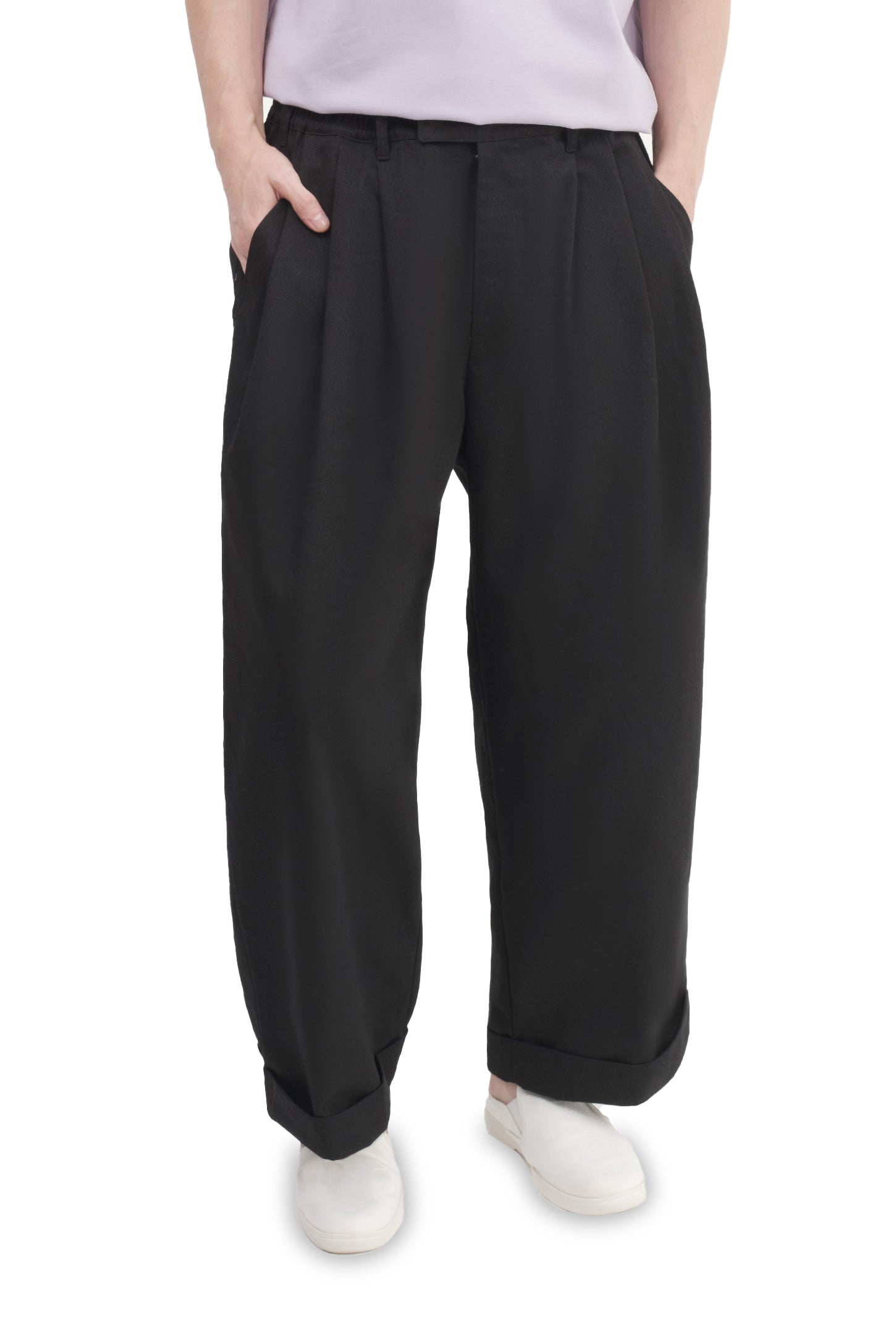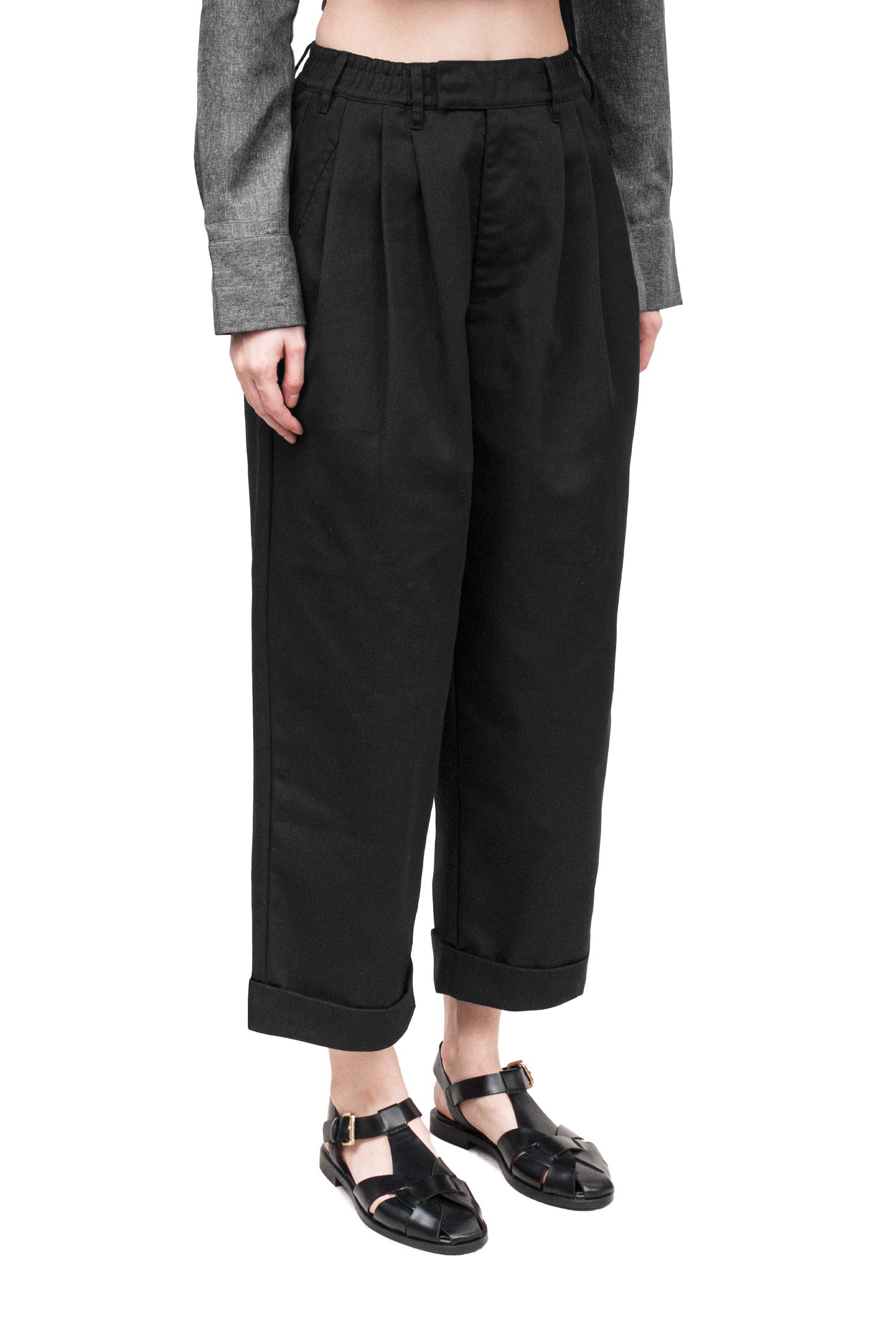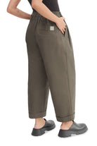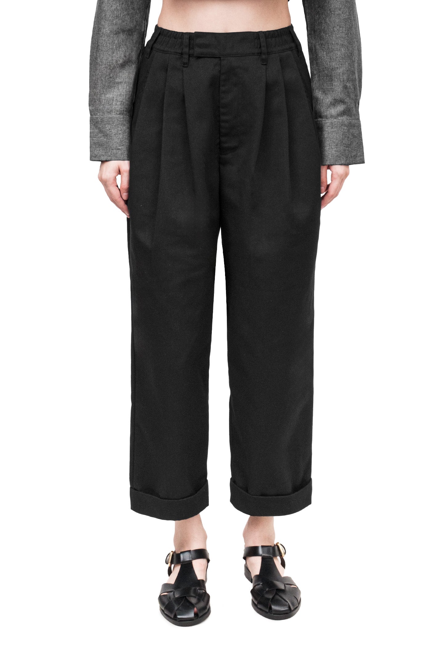 Relaxed-fit, unisex trousers that feature a gartered waistband with belt loops, a snap button and zipper closure, ankle-length design with turn-up hems, side and back welt pockets, and a rubber patch logo.