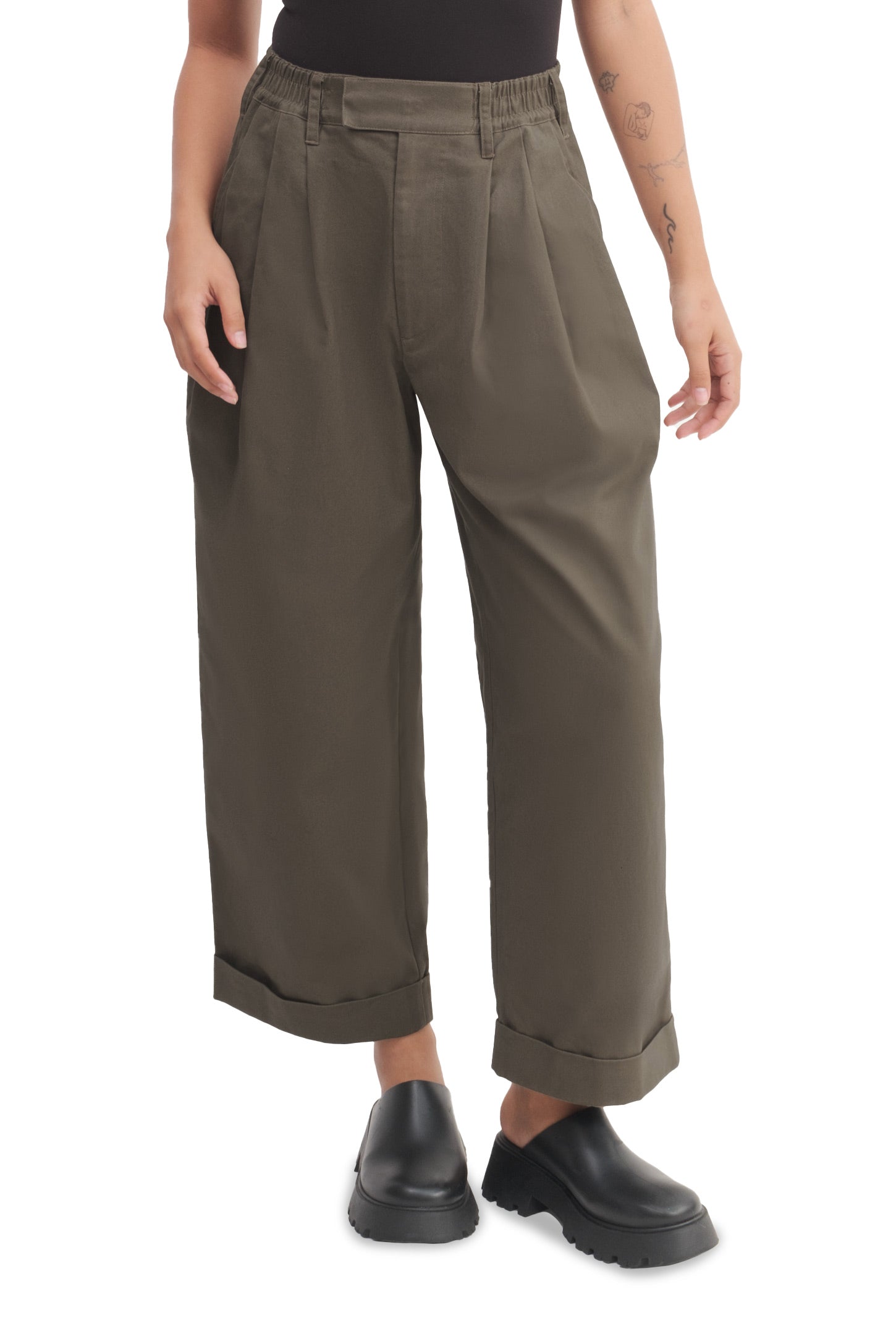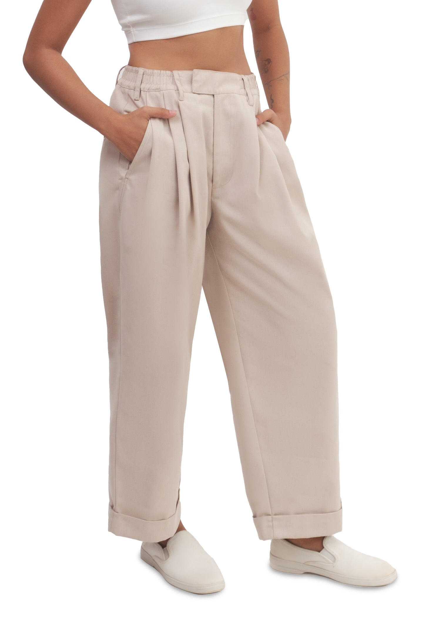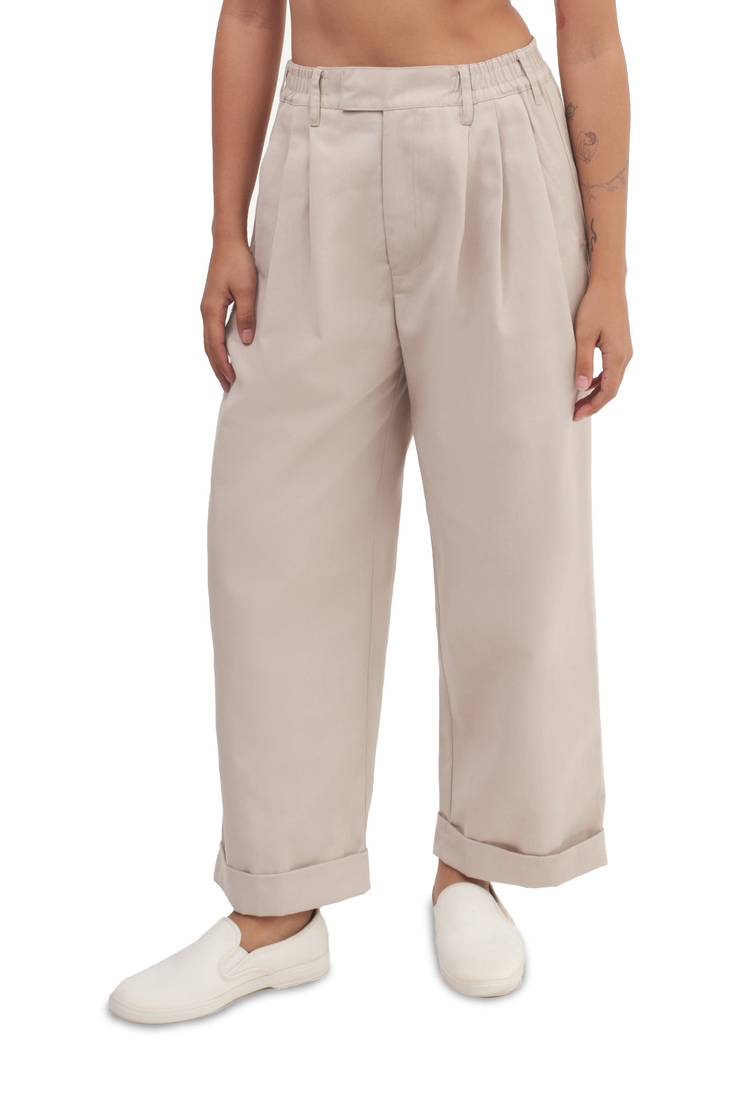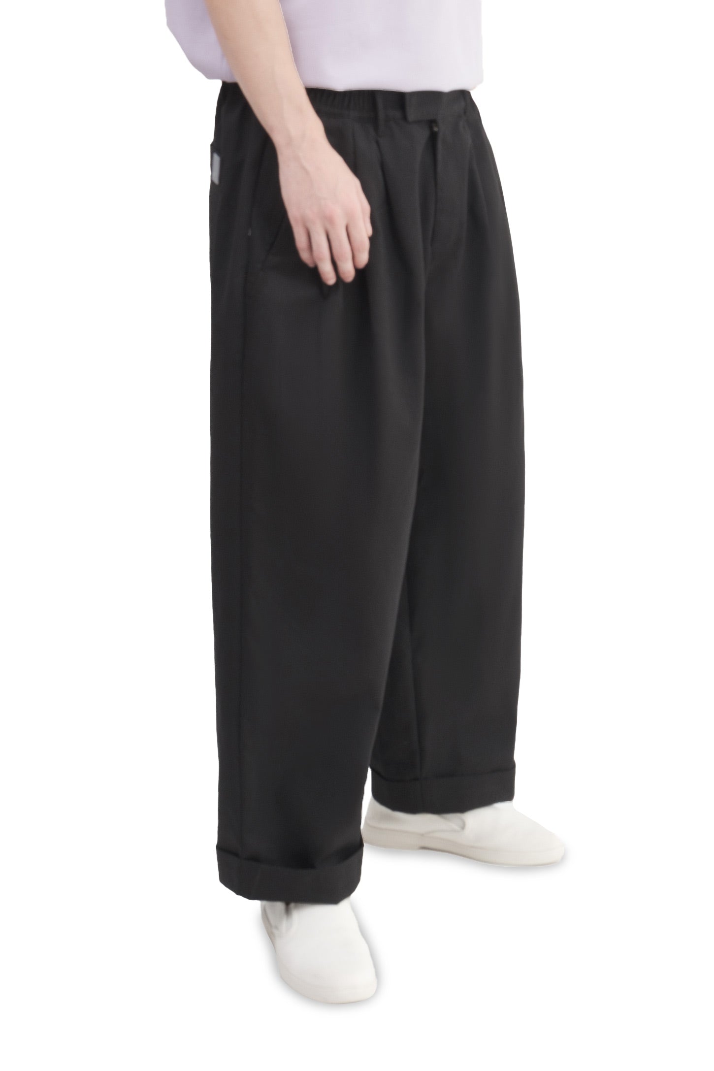Relaxed-fit, unisex trousers that feature a gartered waistband with belt loops, a snap button and zipper closure, ankle-length design with turn-up hems, side and back welt pockets, and a rubber patch logo.