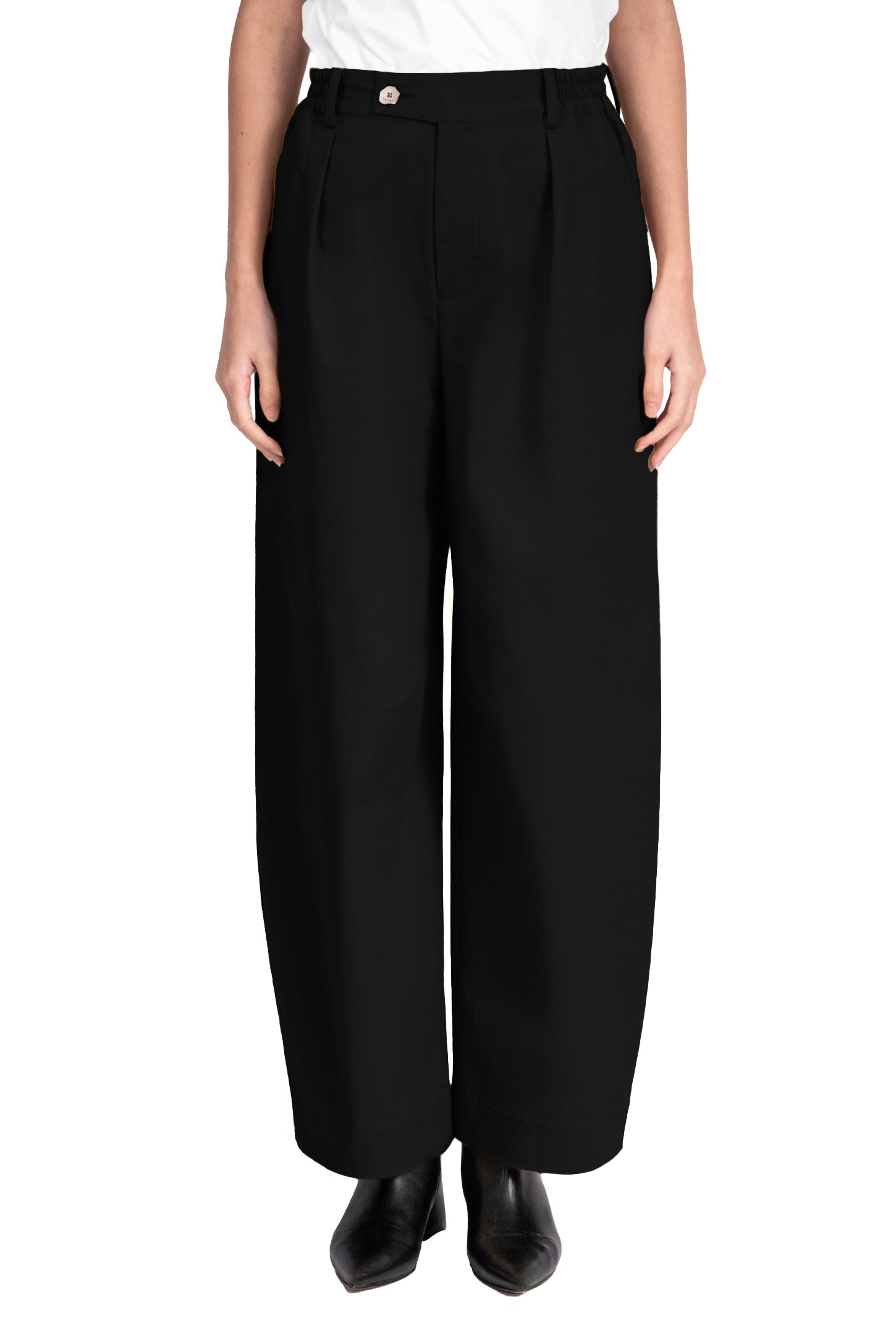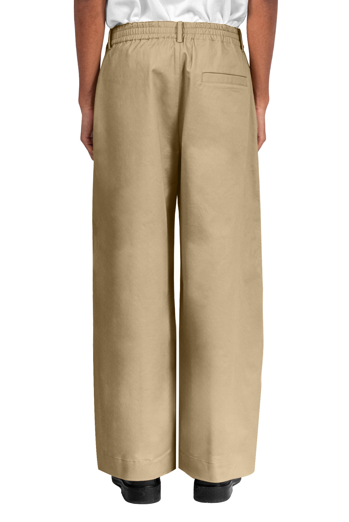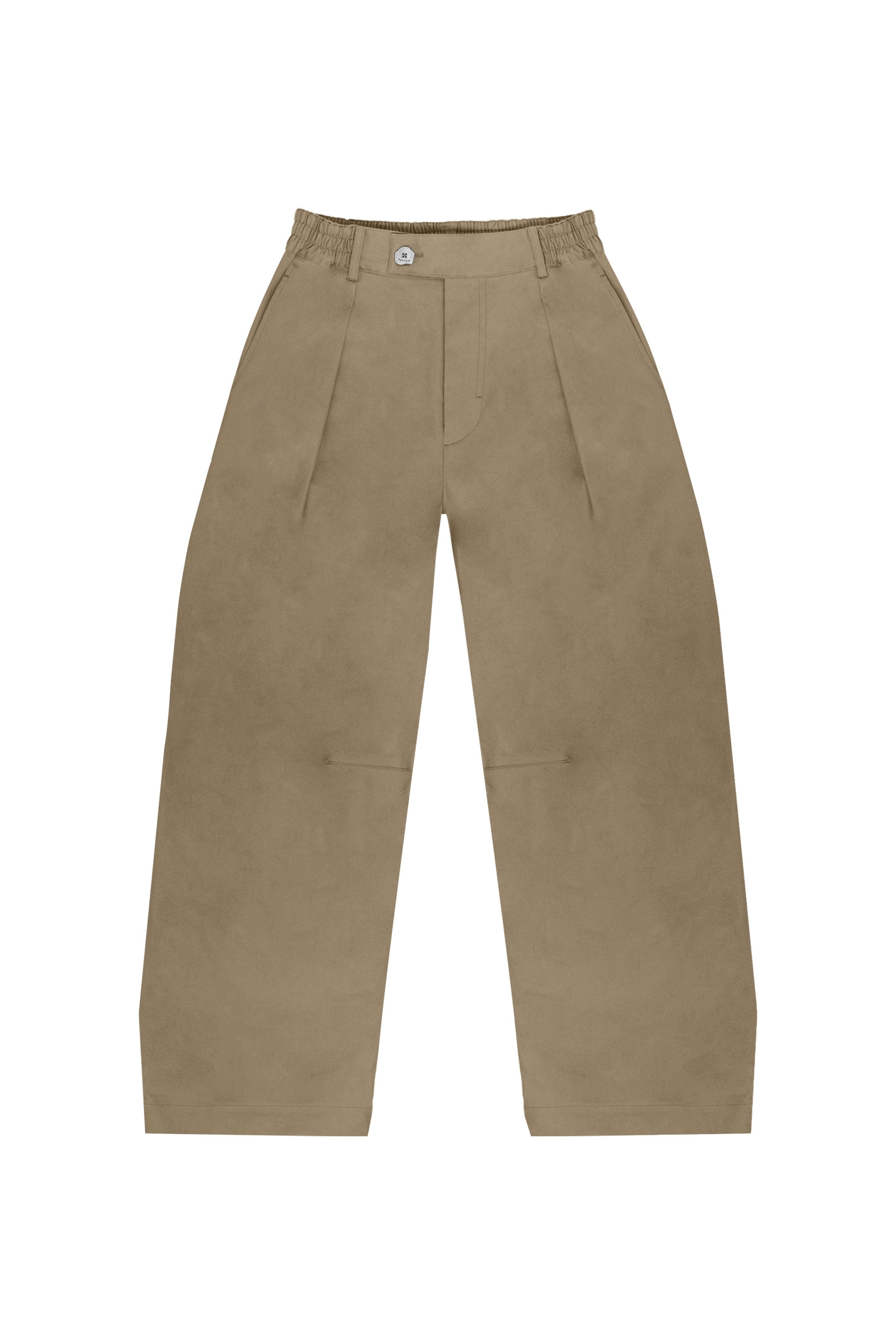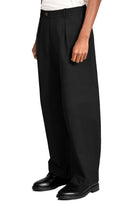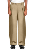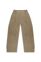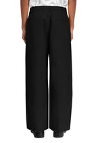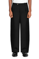 Mid-rise, unisex trousers featuring a gartered waistband, a metal logo button and zipper closure, hidden side pockets, and a back welt pocket.