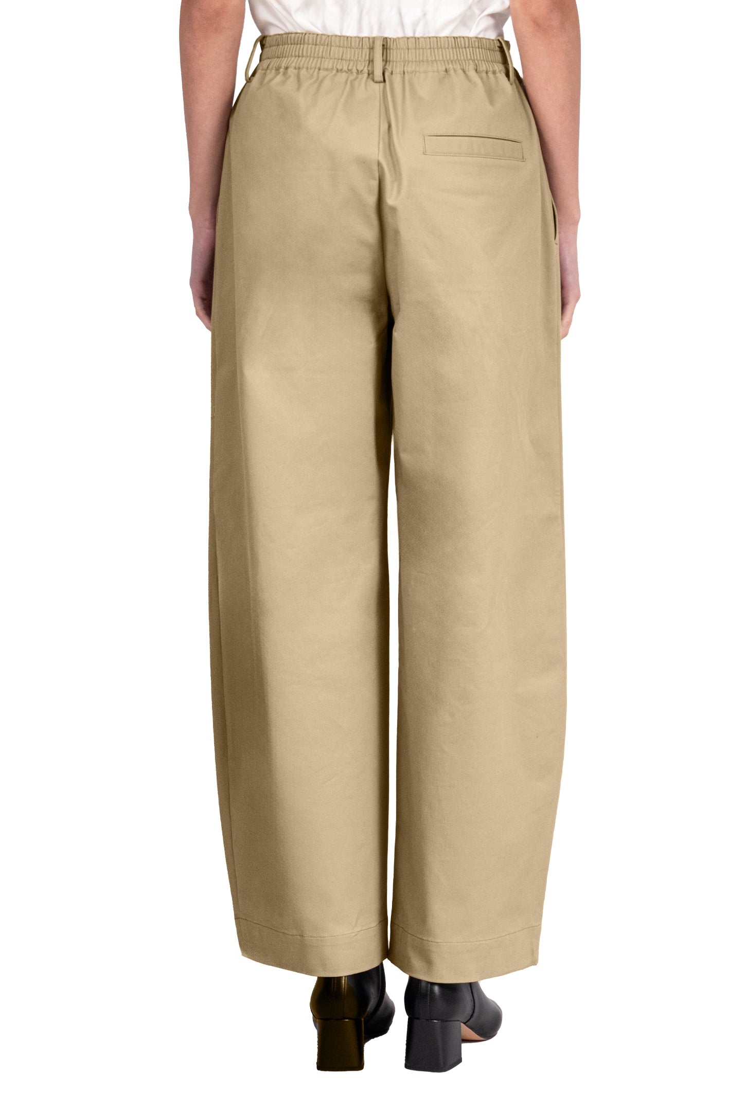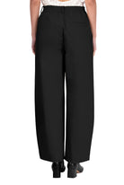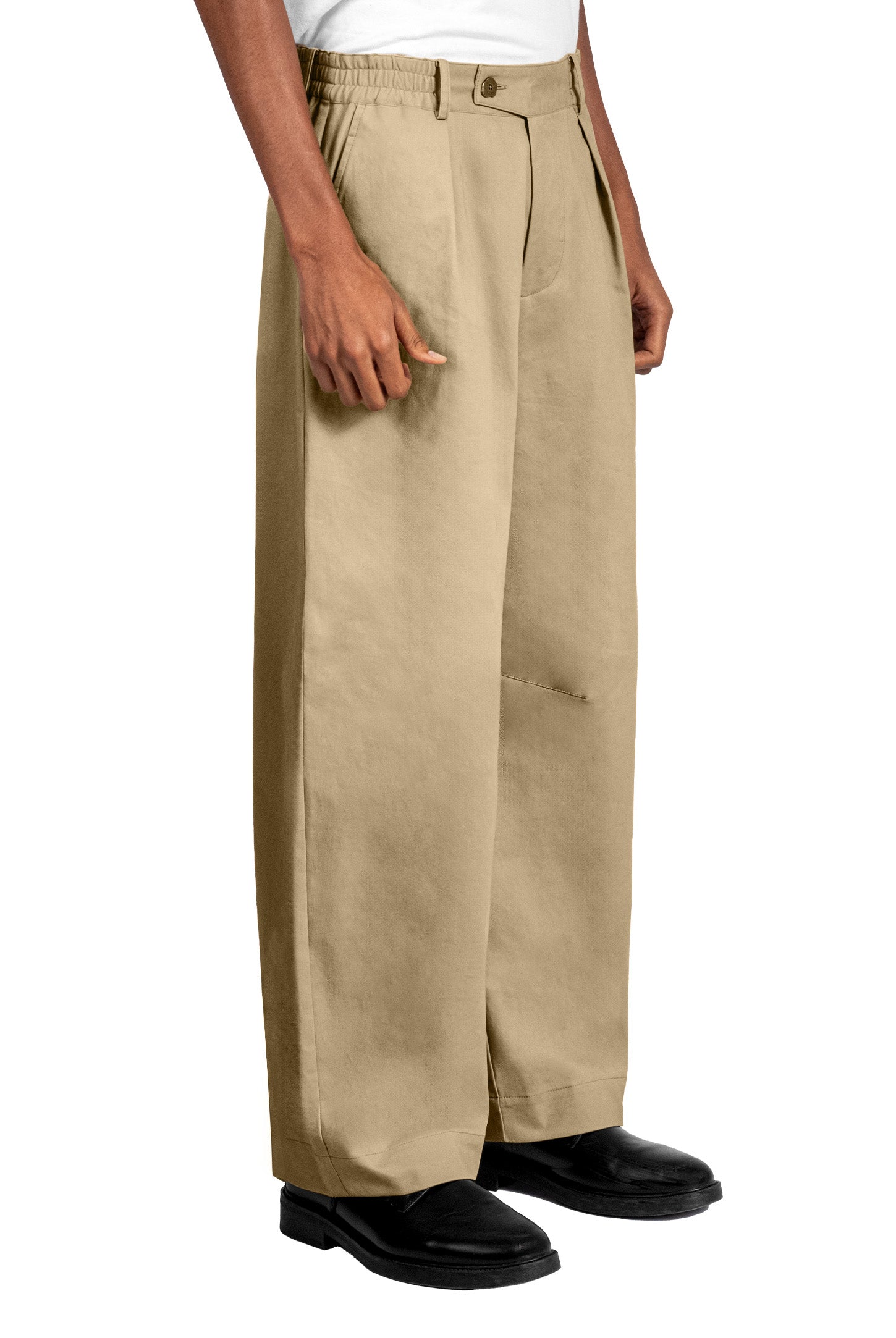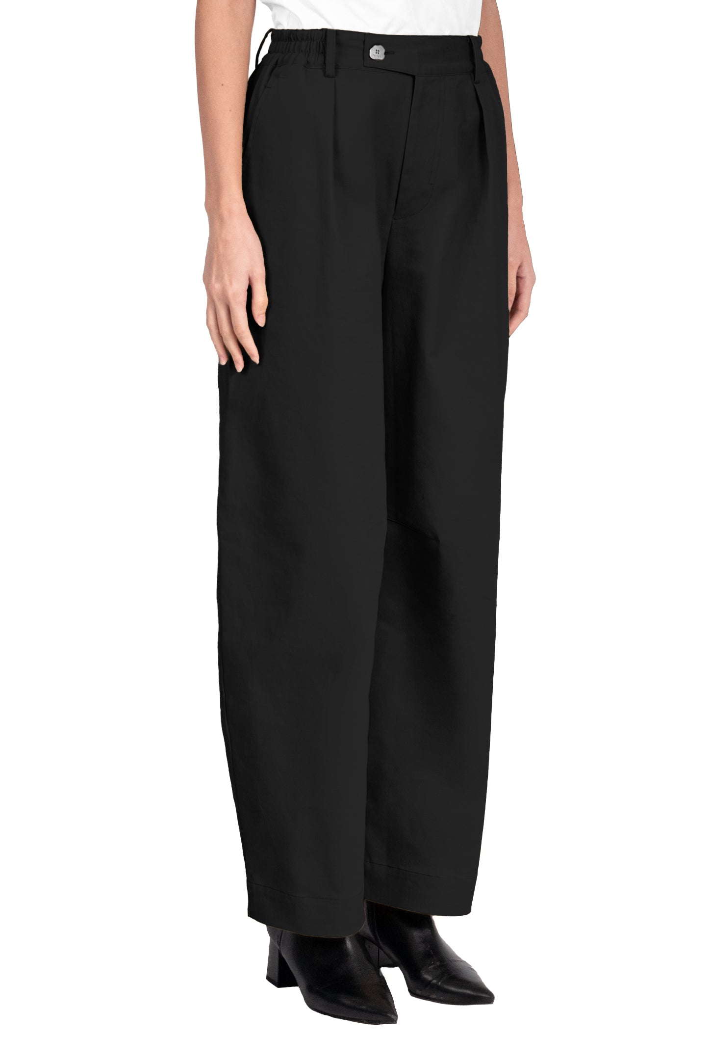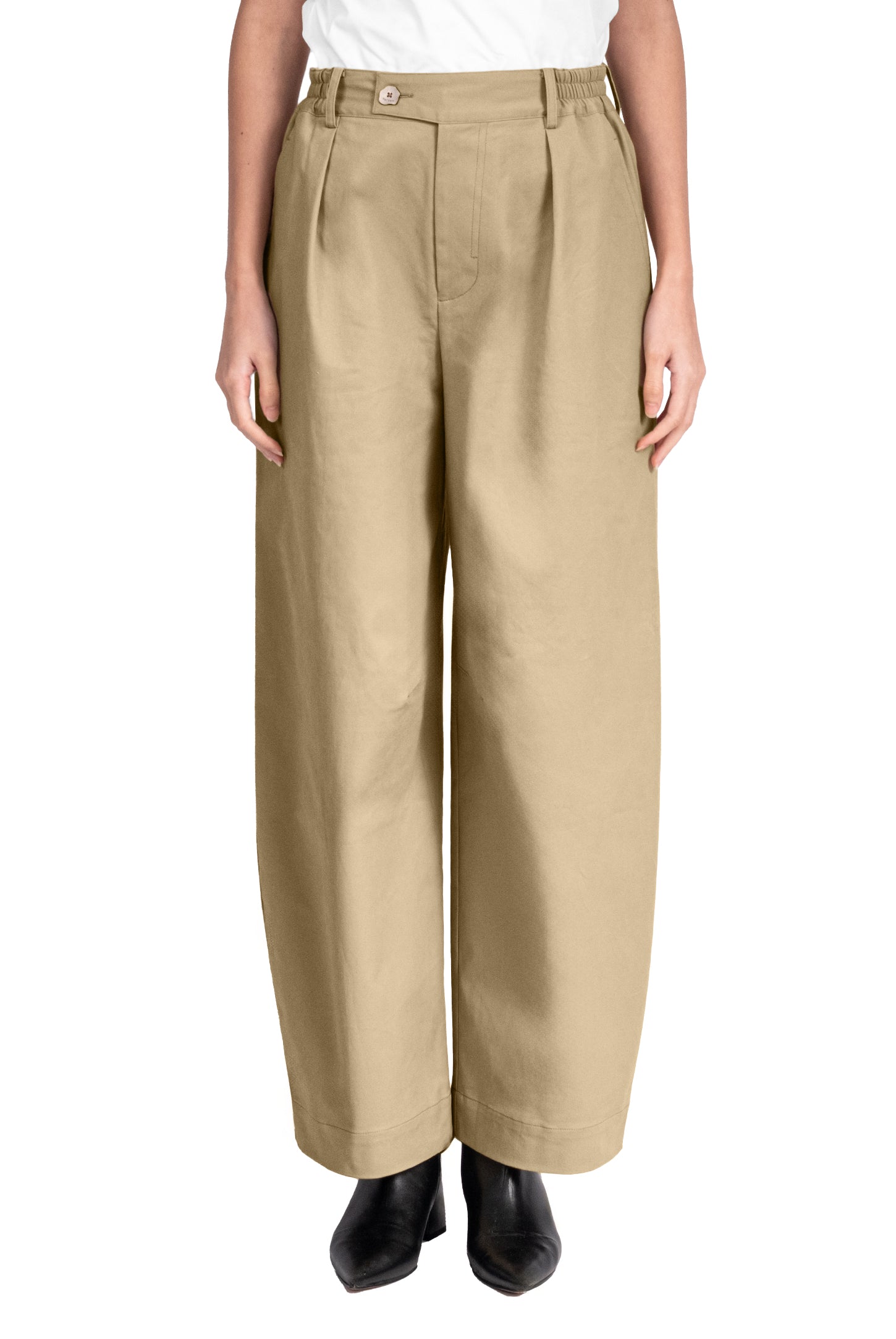 Mid-rise, unisex trousers featuring a gartered waistband, a metal logo button and zipper closure, hidden side pockets, and a back welt pocket.