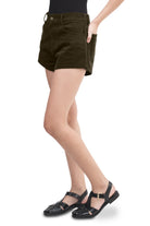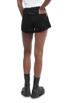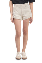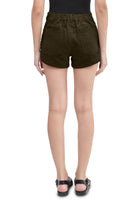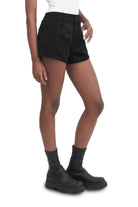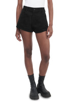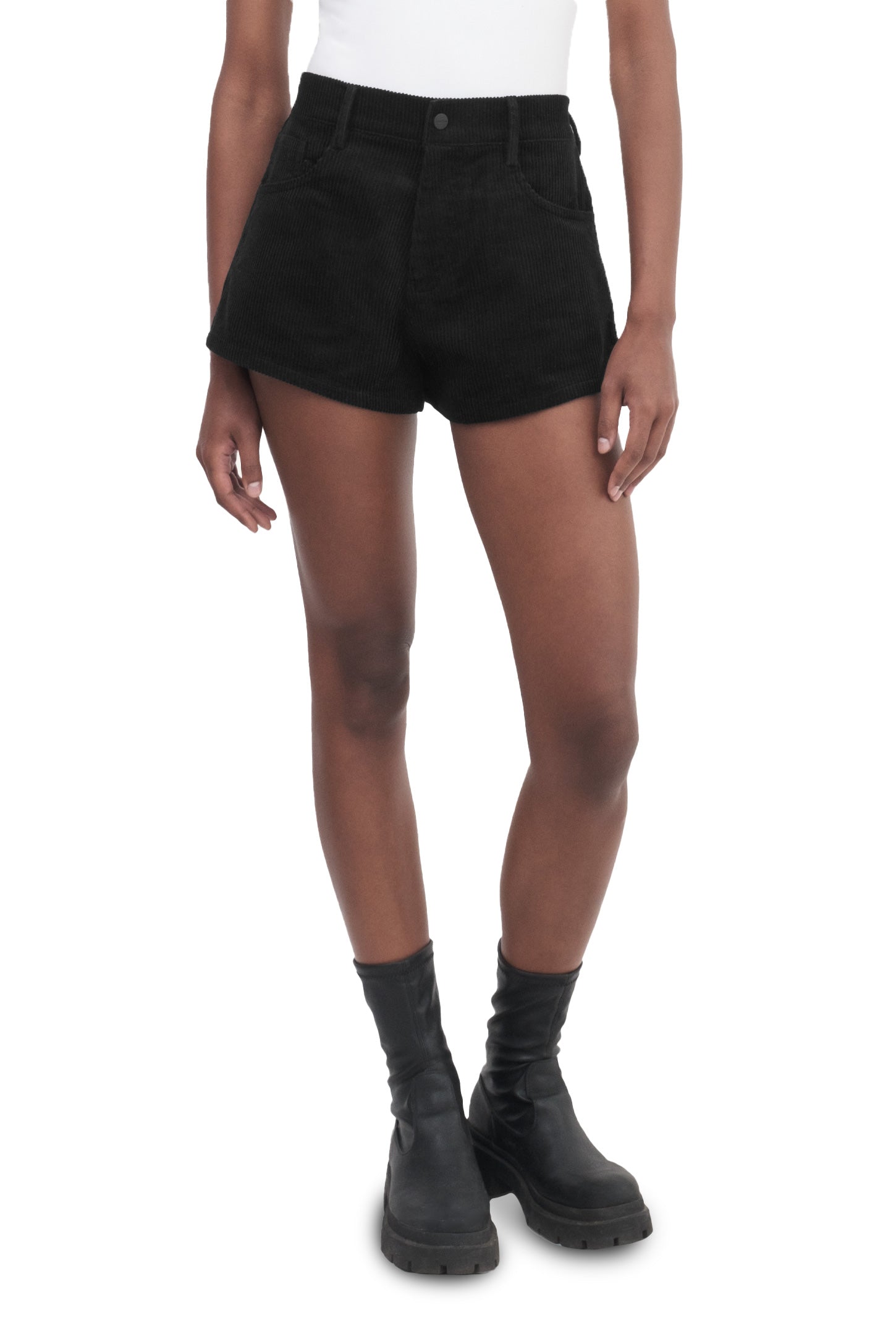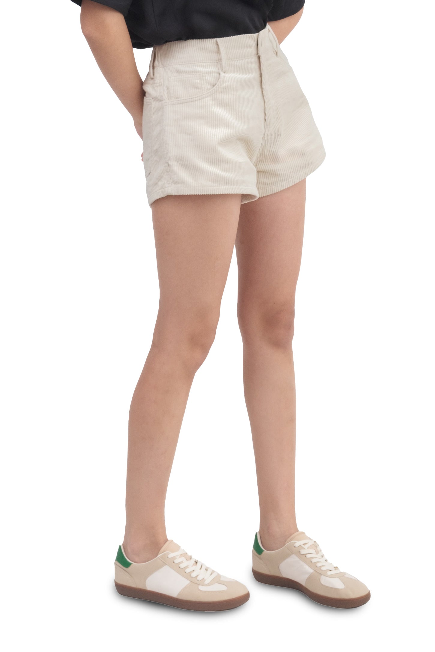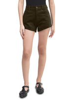 High-waisted shorts featuring a diagonal hem, gartered waistband at the back, snap button and zipper closure, hidden side pockets and back patch pockets.