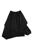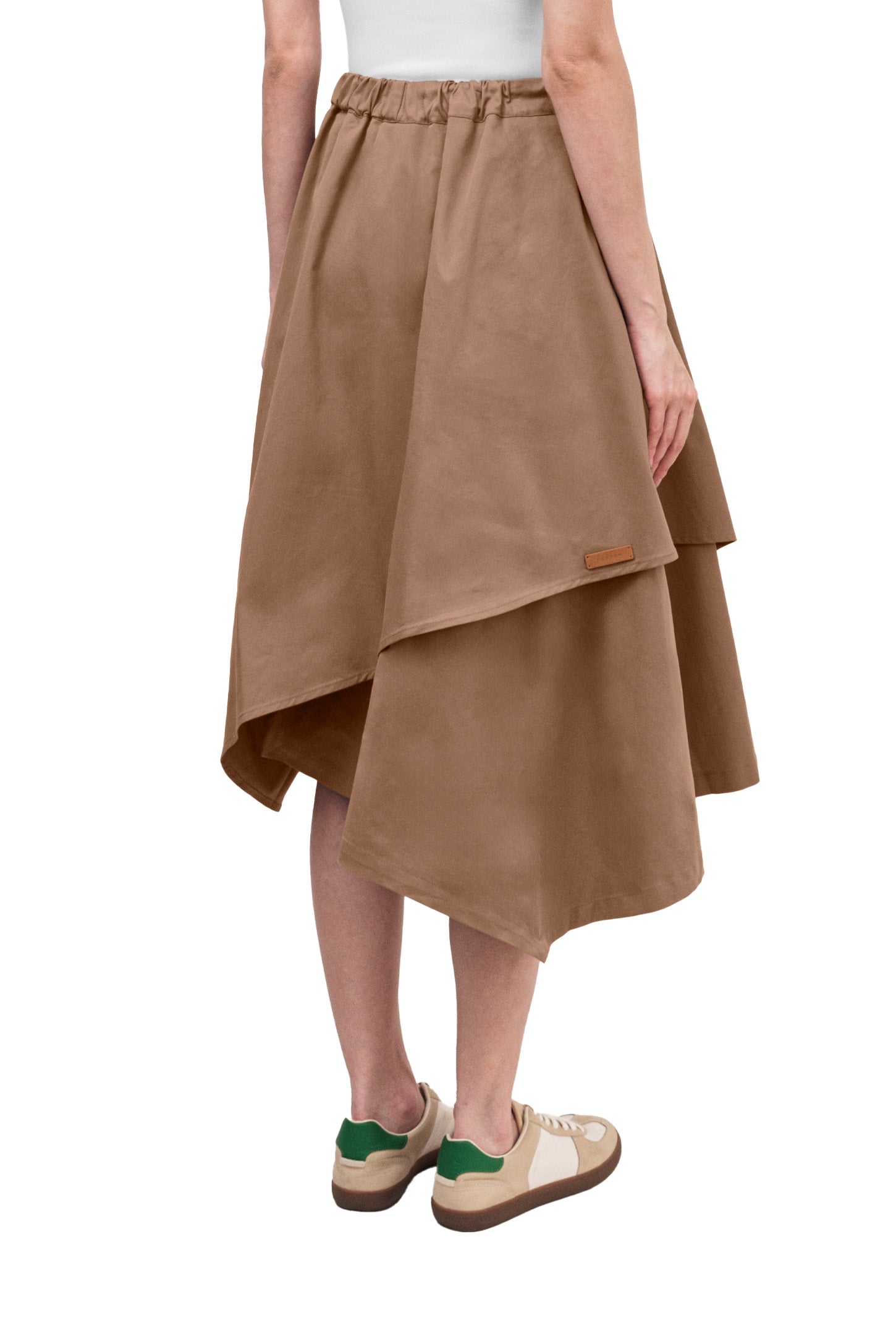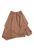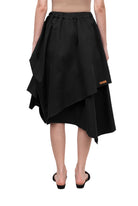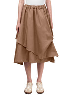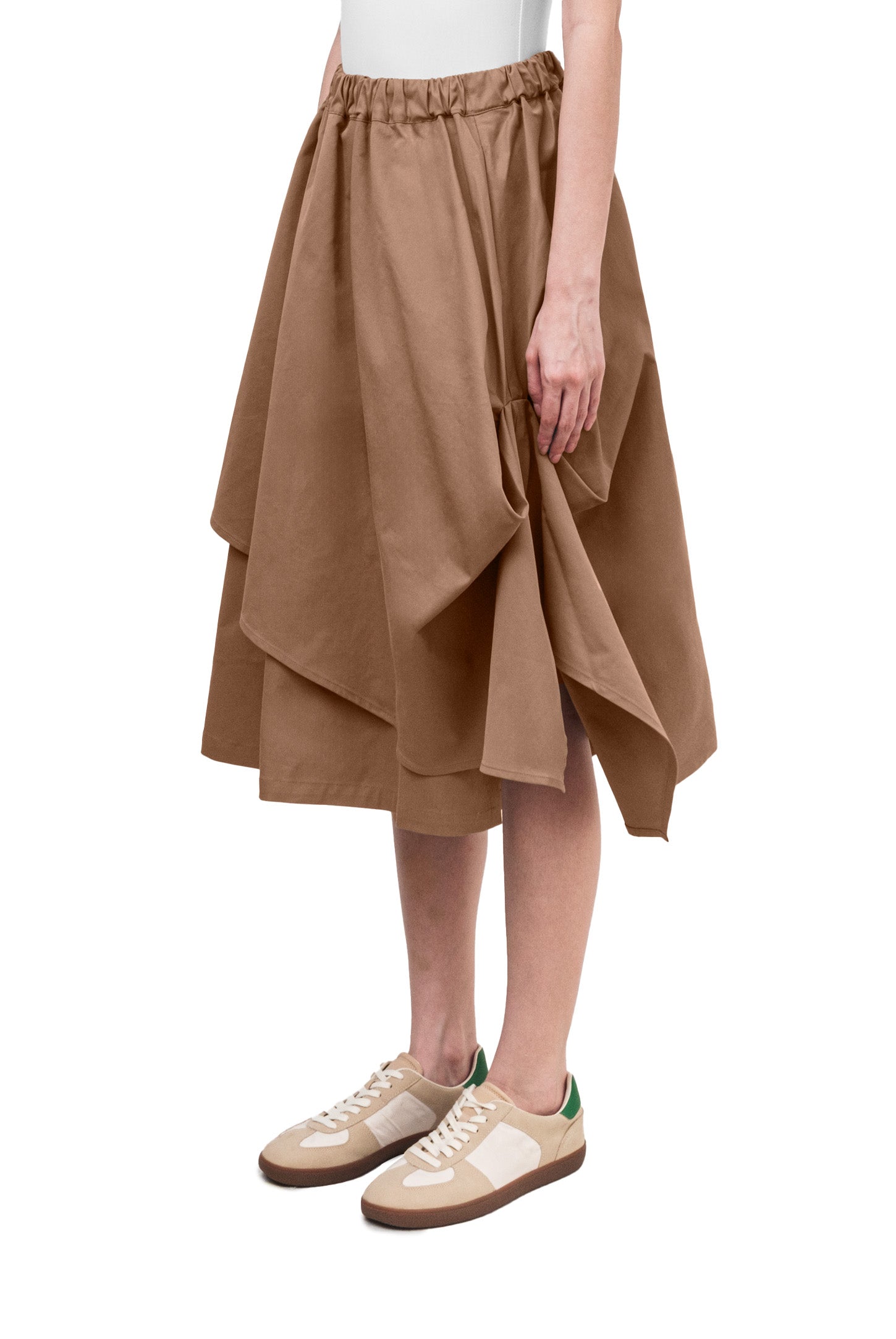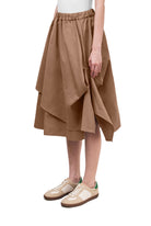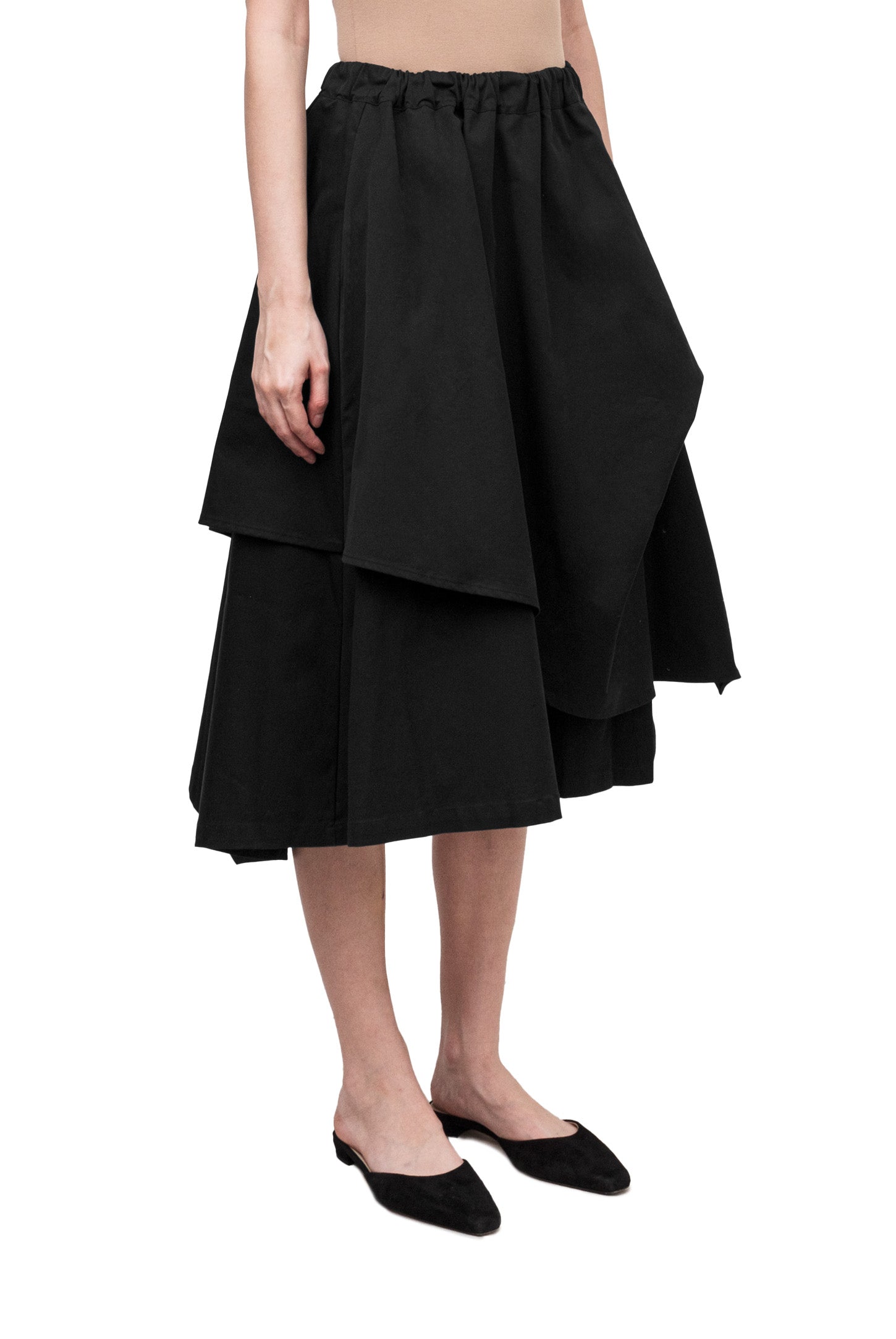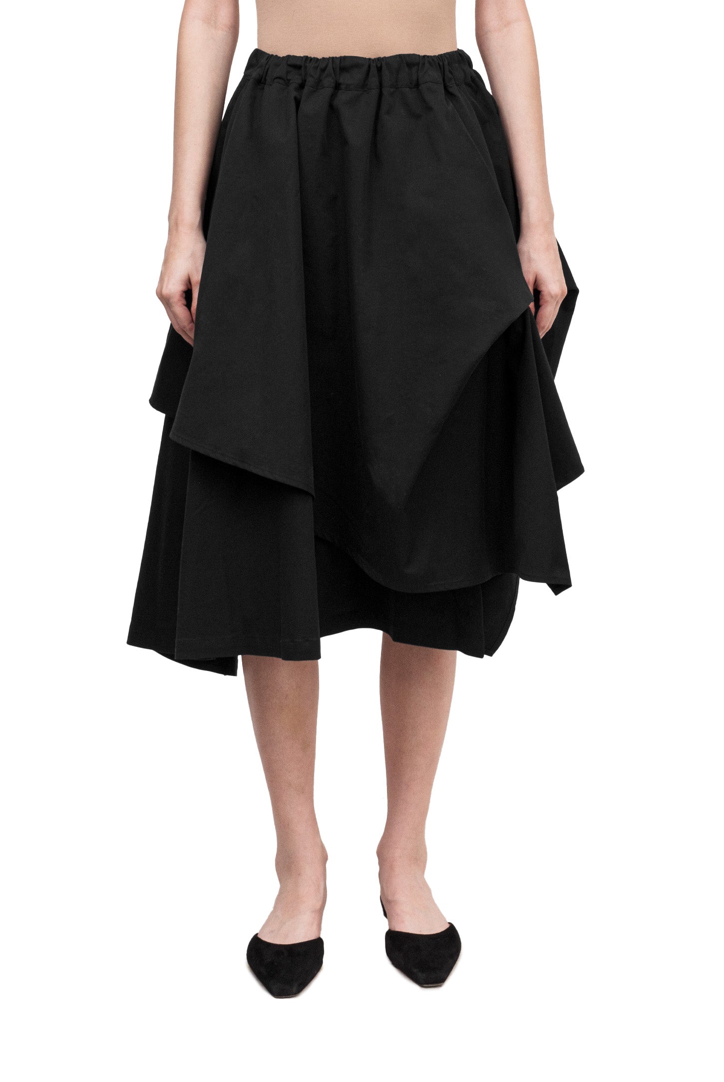A midi-length skirt with a gartered waistband, an asymmetric layered design, side pockets, and a jacron label.