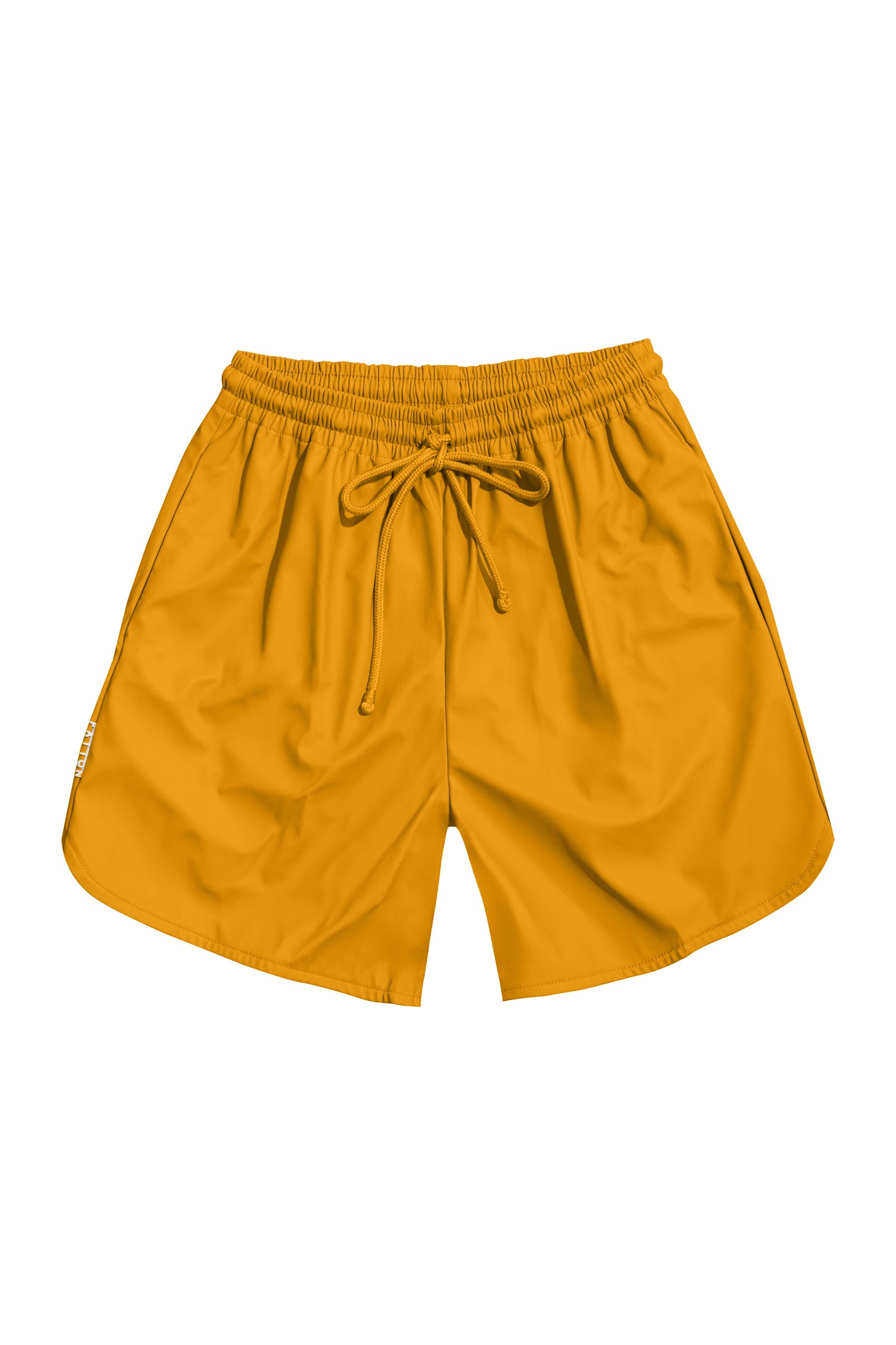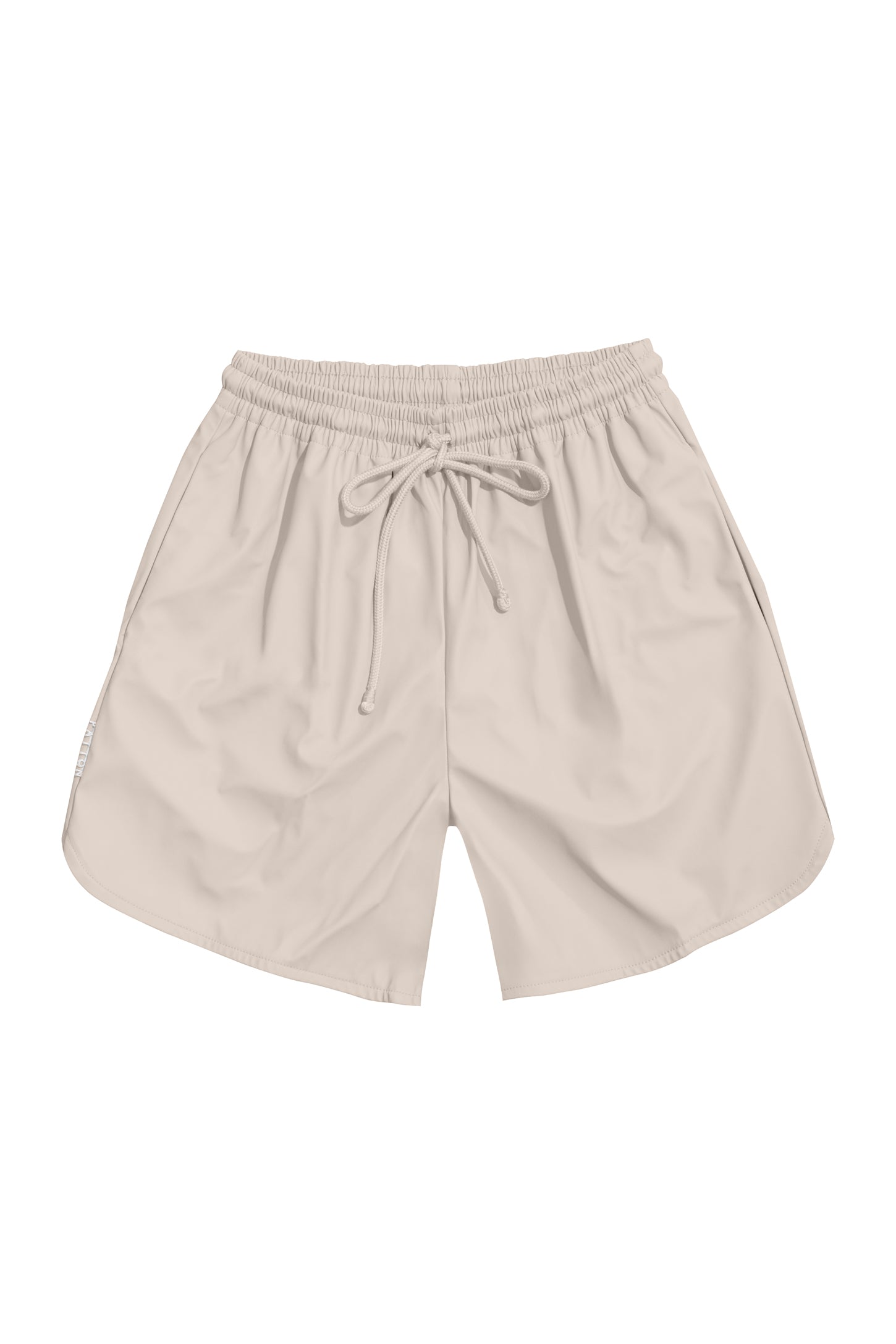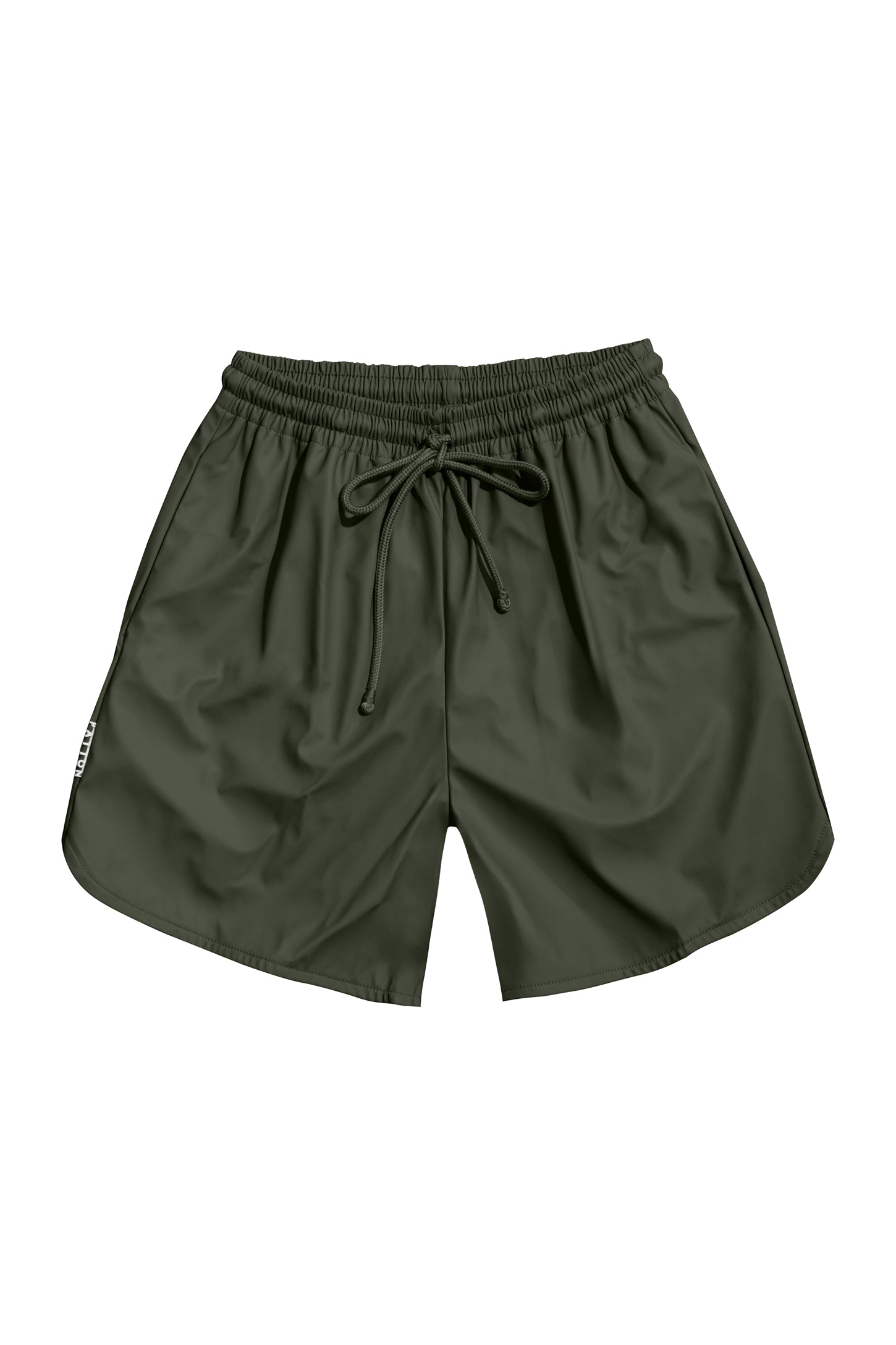 A water-resistant, unisex mid-thigh length shorts with a relaxed fit, adjustable drawstring waistband, side pockets and a rubber logo.