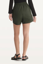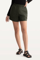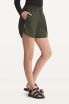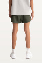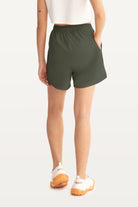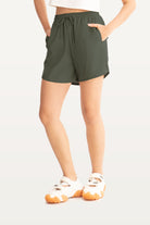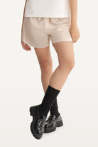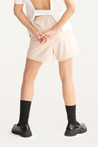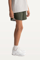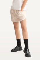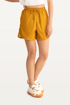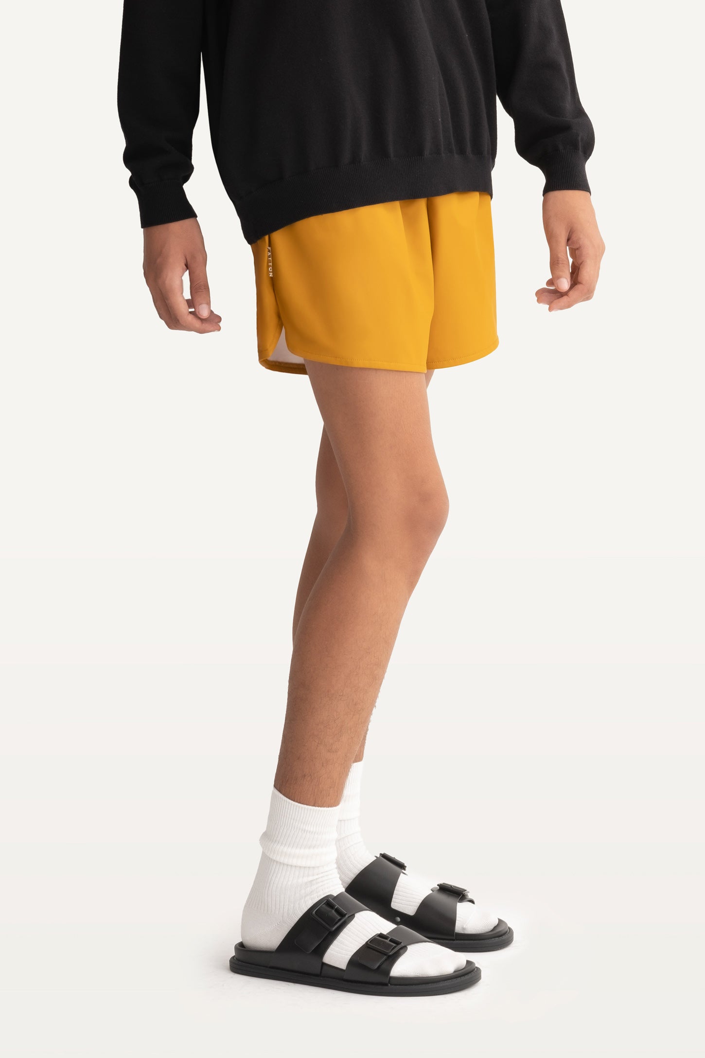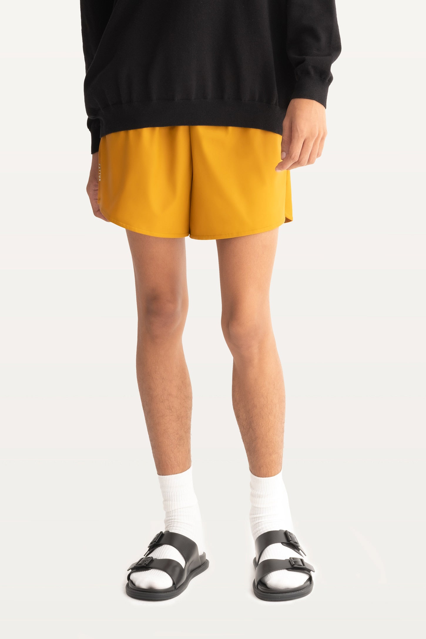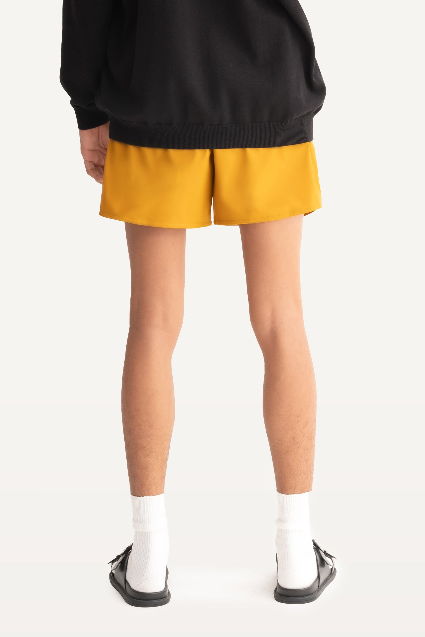 A water-resistant, unisex mid-thigh length shorts with a relaxed fit, adjustable drawstring waistband, side pockets and a rubber logo.