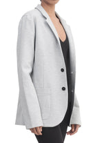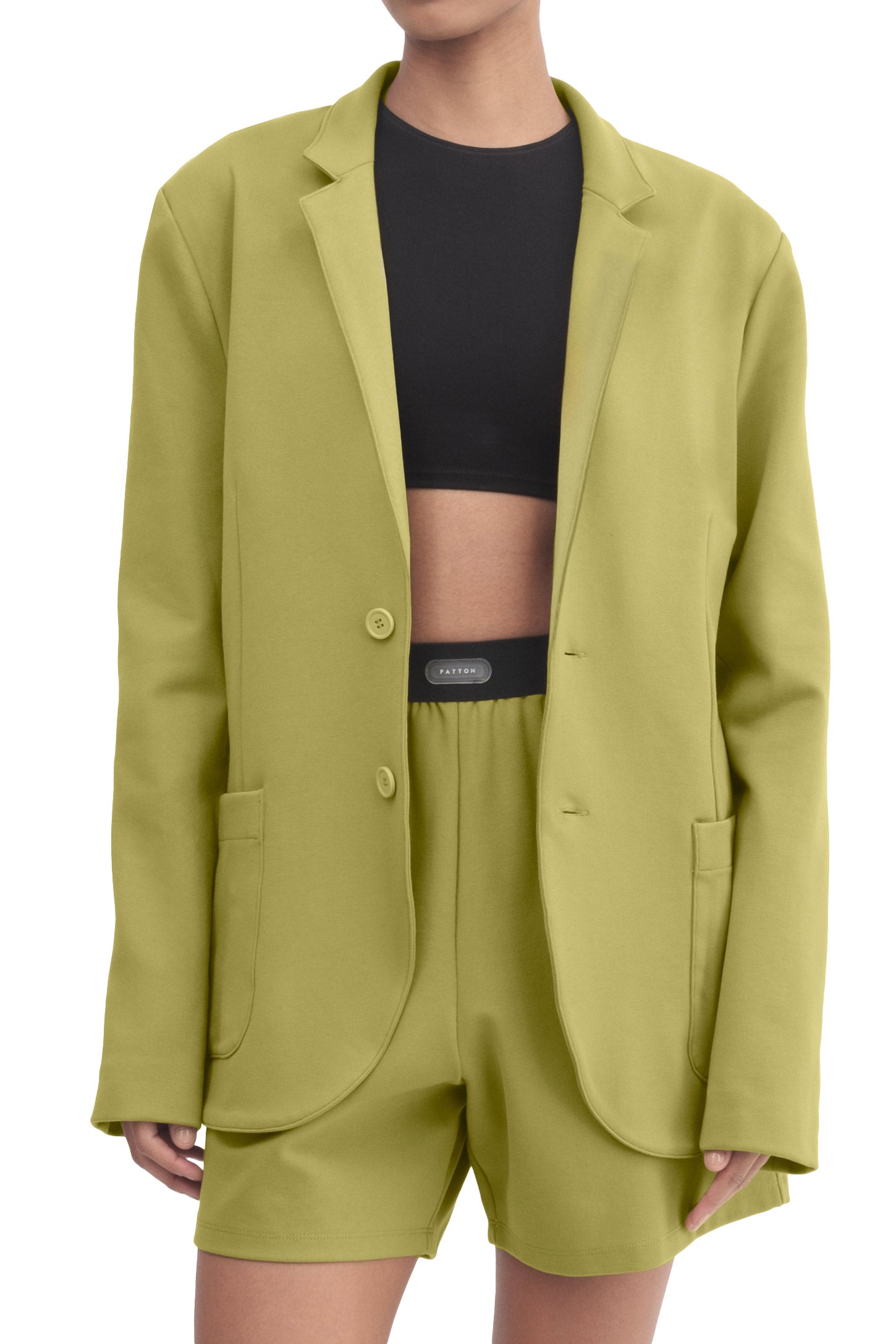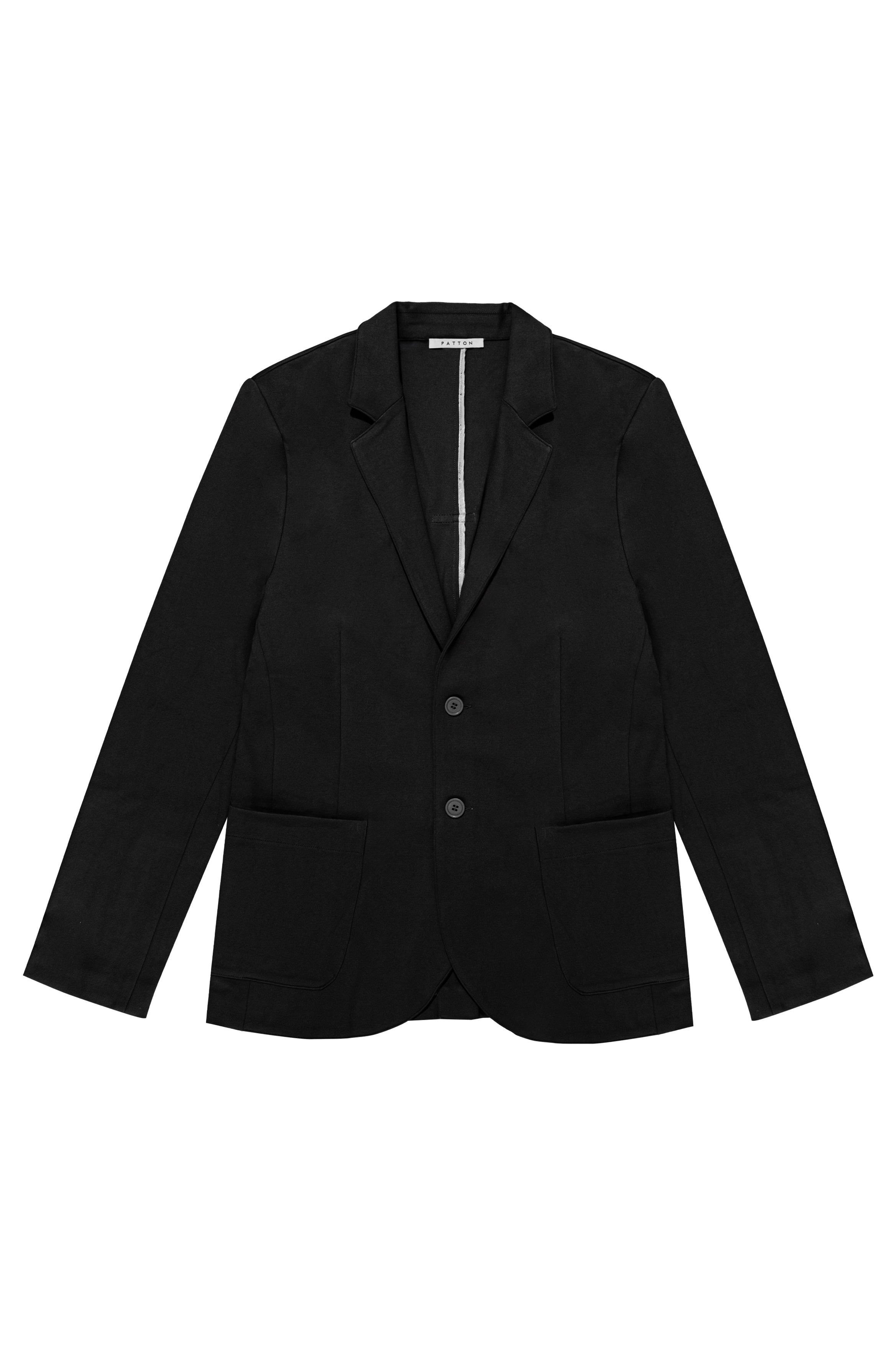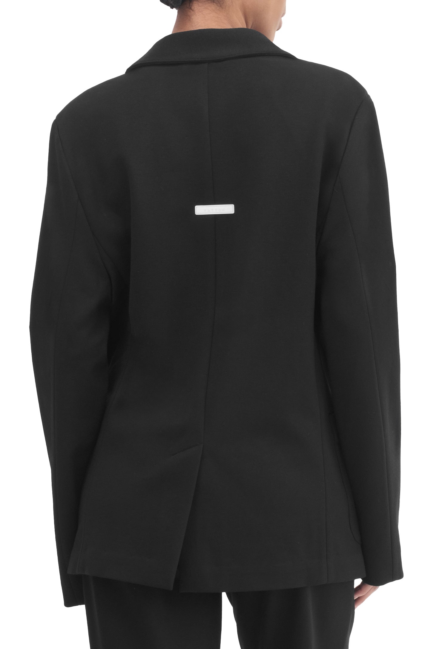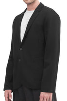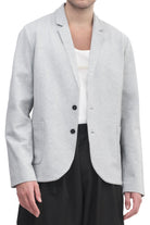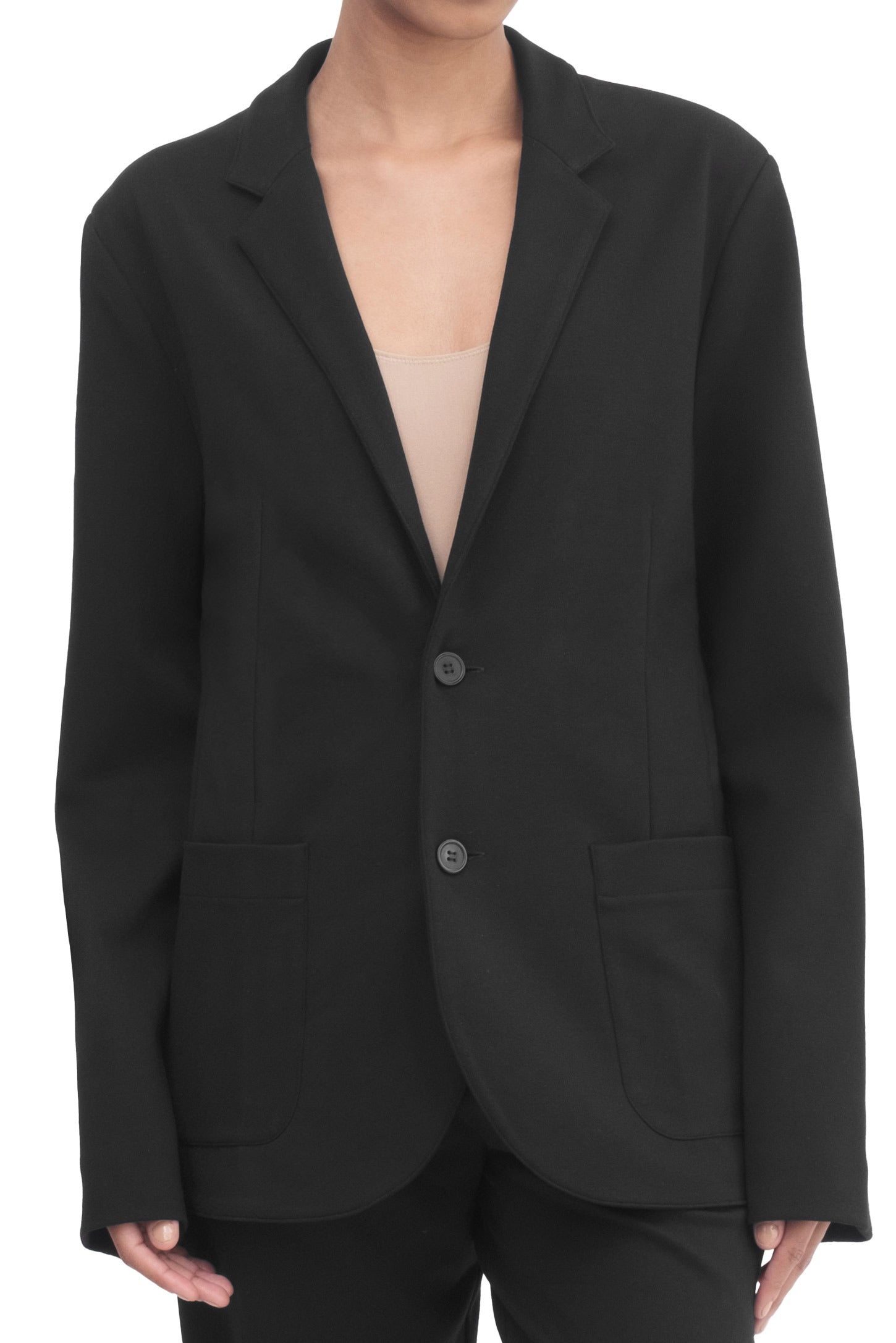 A relaxed-fit, unisex blazer with unpadded shoulders, two-button closure, side patch pockets, partial lining, and a rubber patch logo.