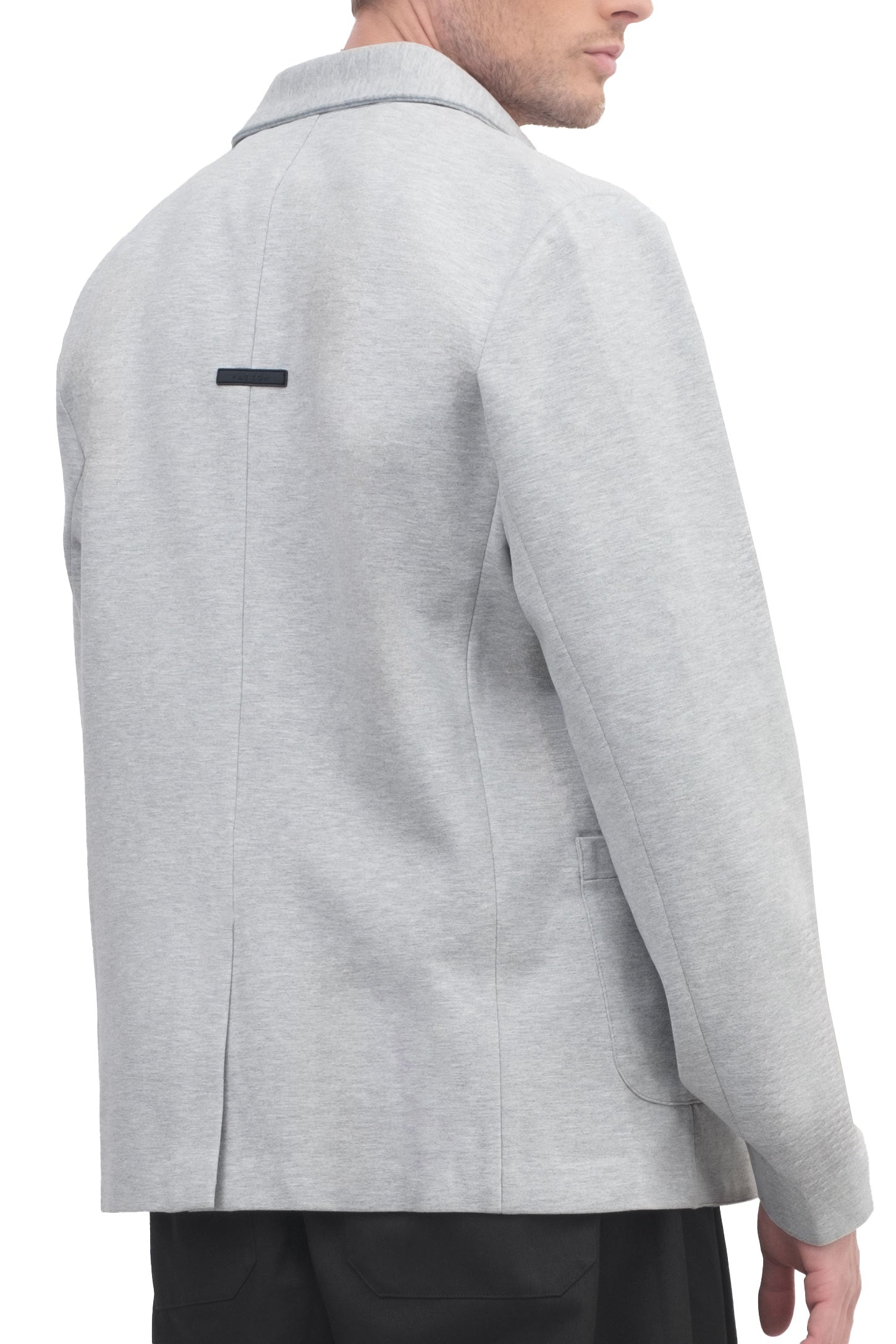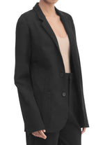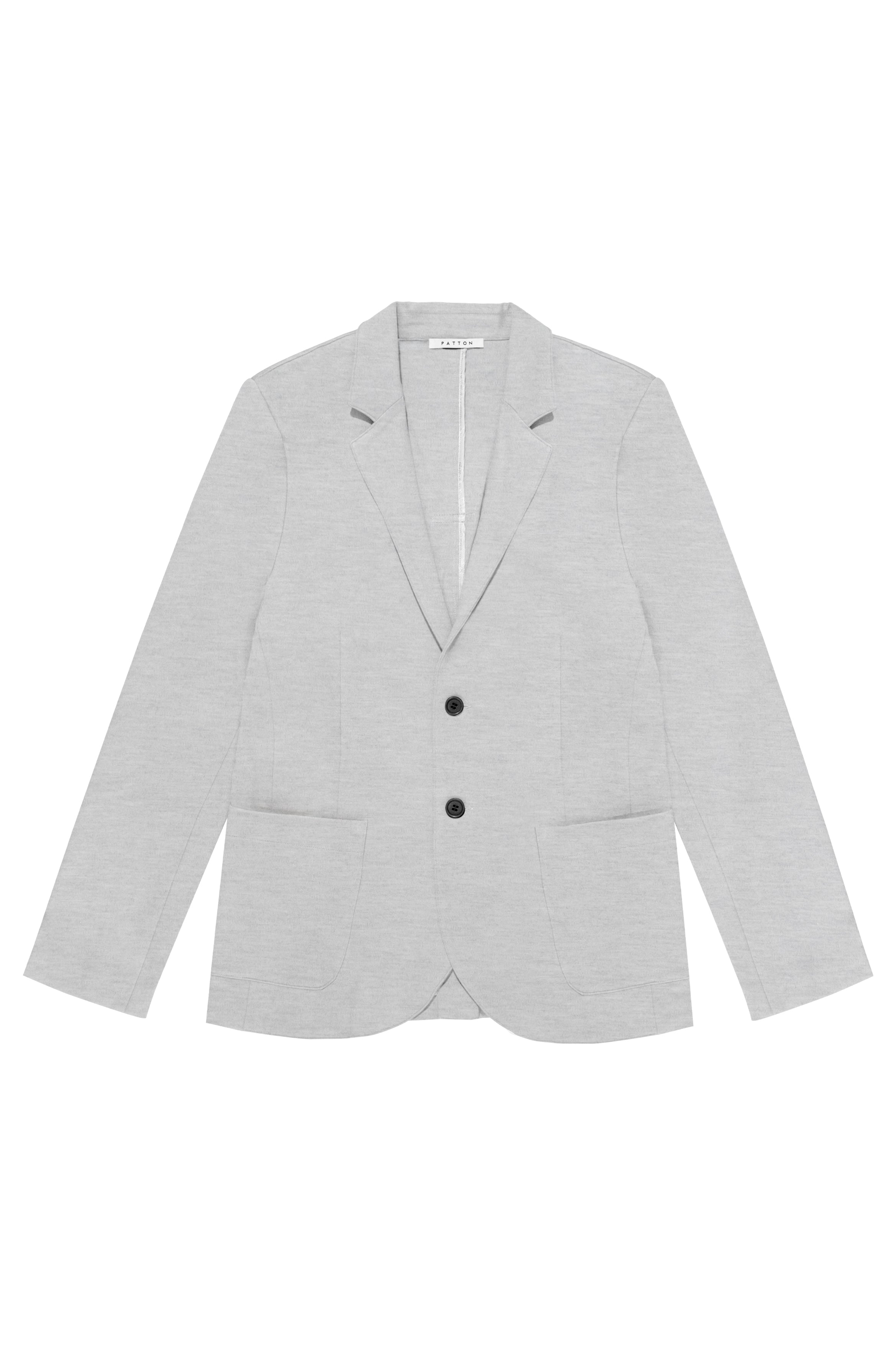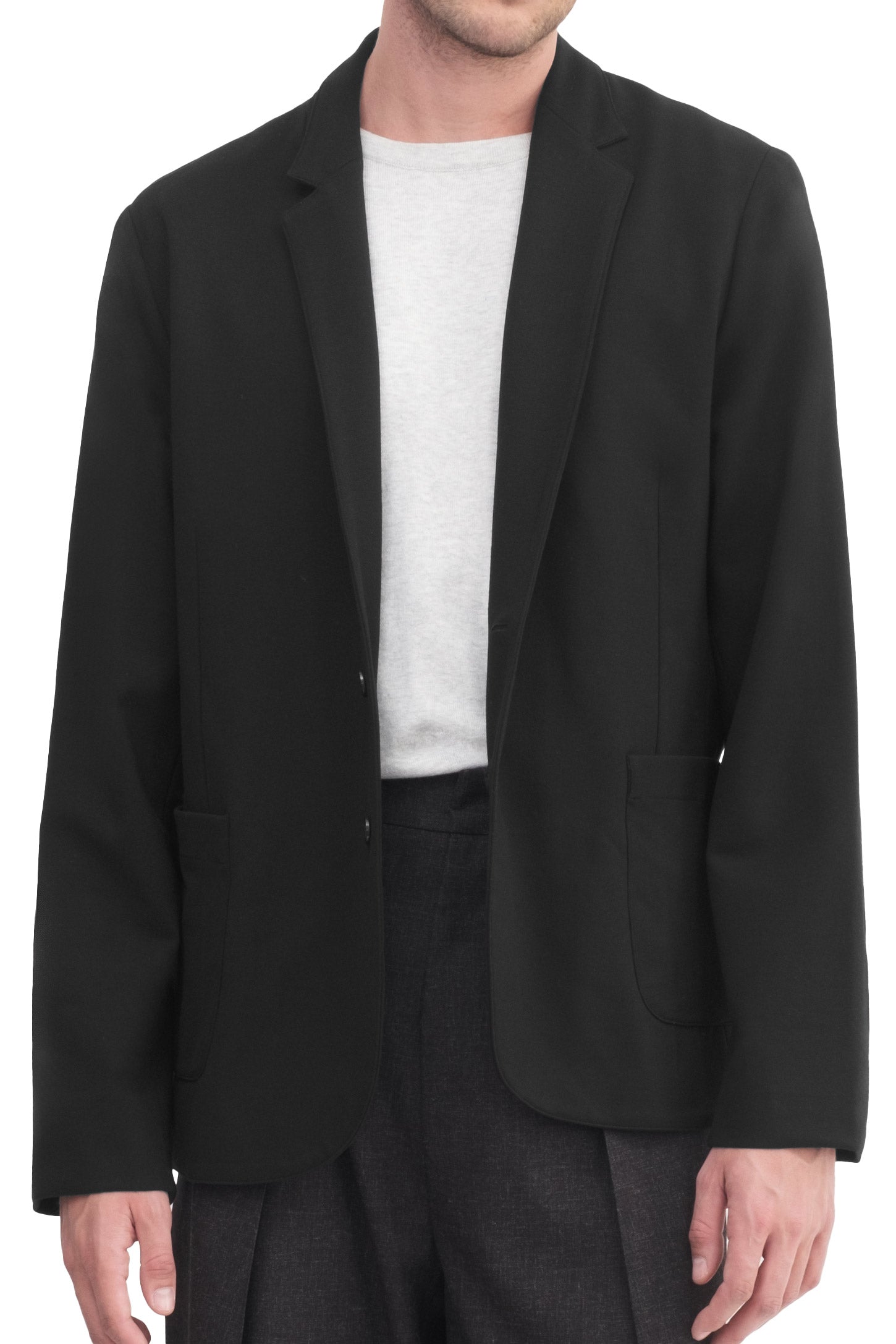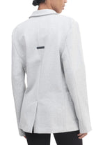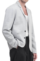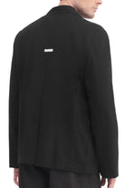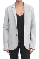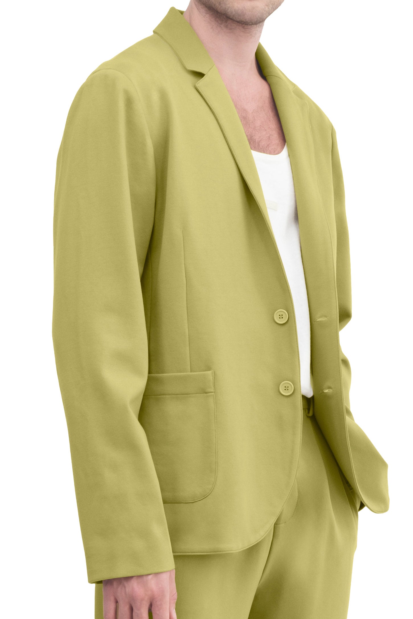 A relaxed-fit, unisex blazer with unpadded shoulders, two-button closure, side patch pockets, partial lining, and a rubber patch logo.