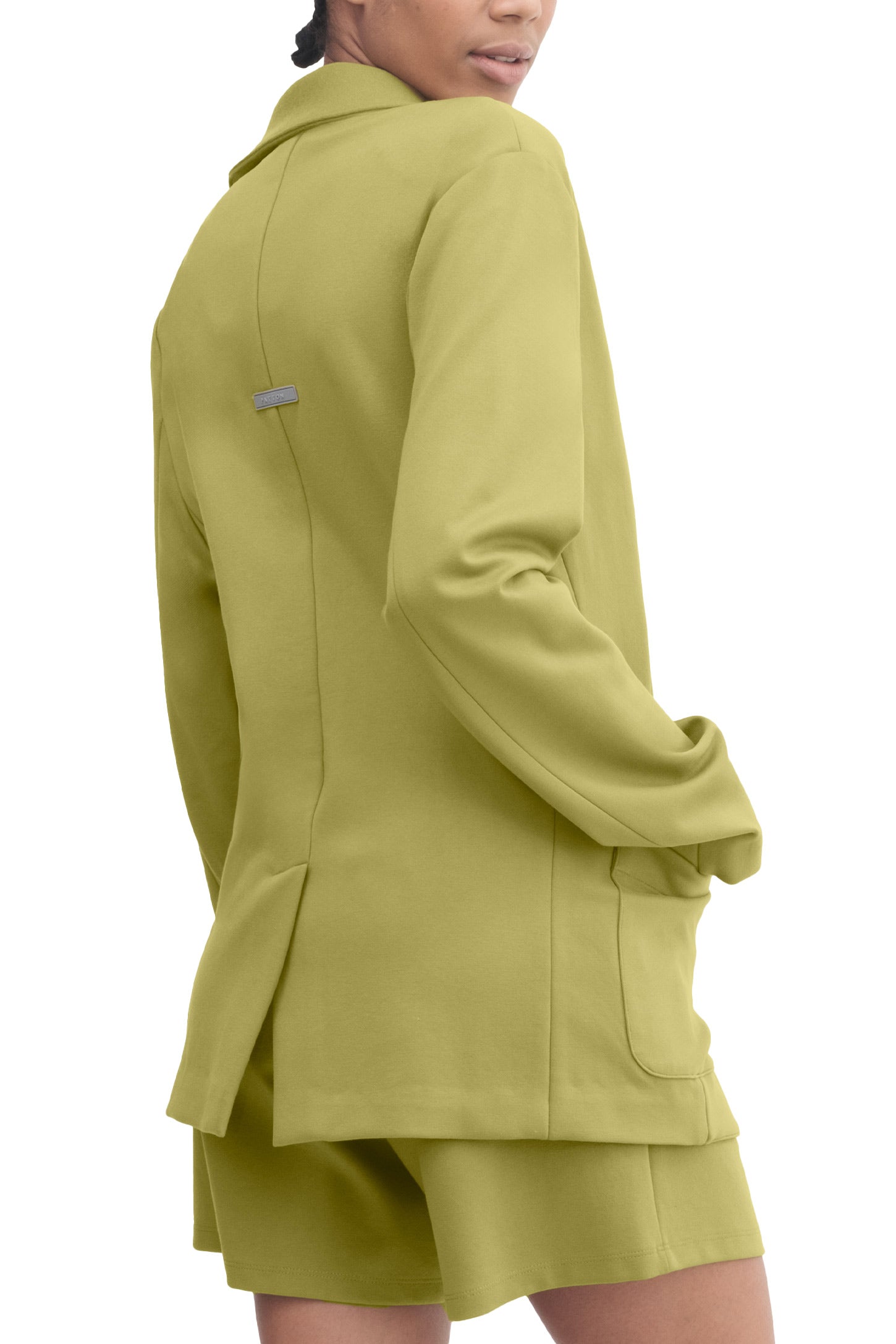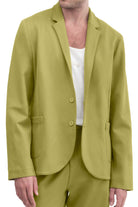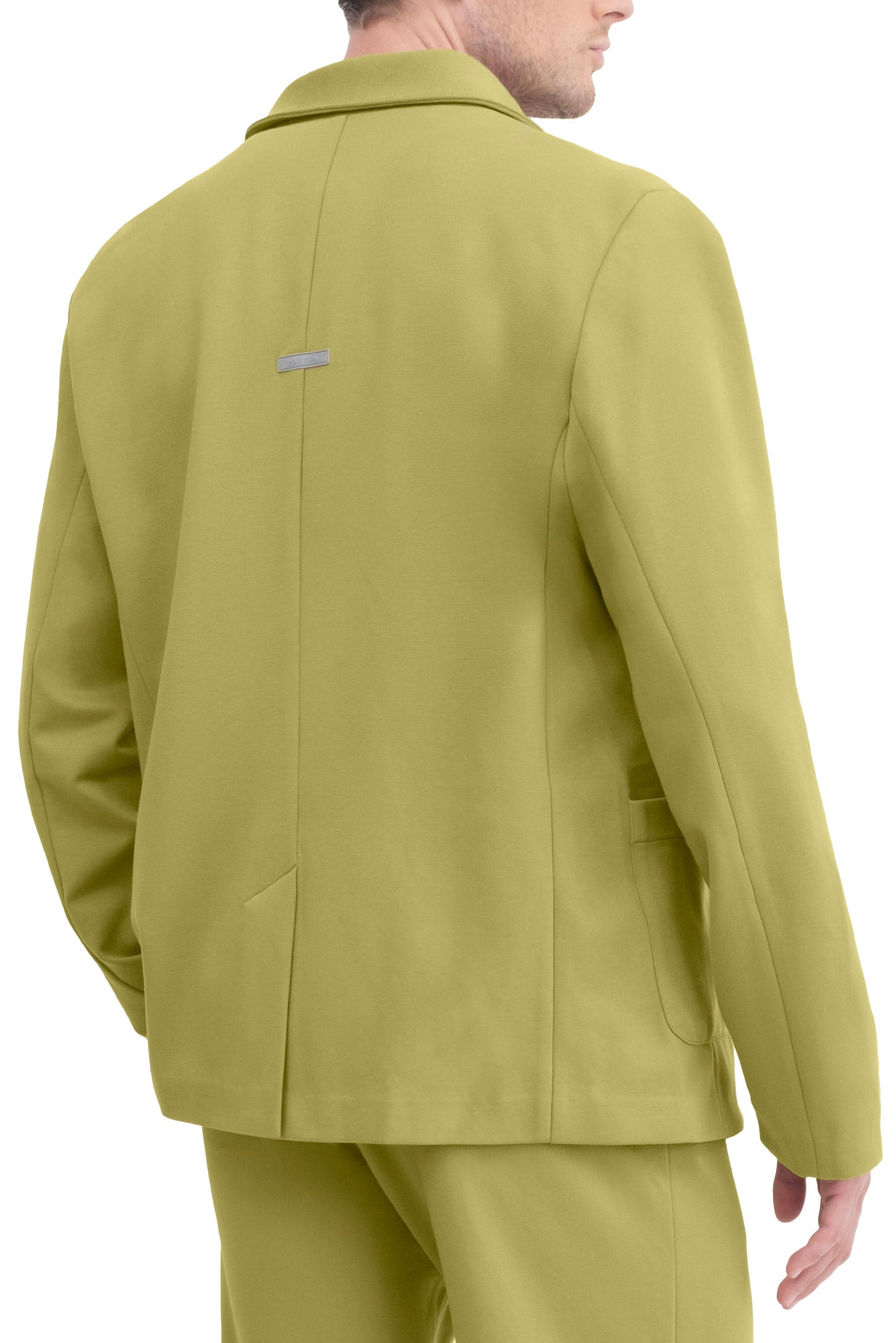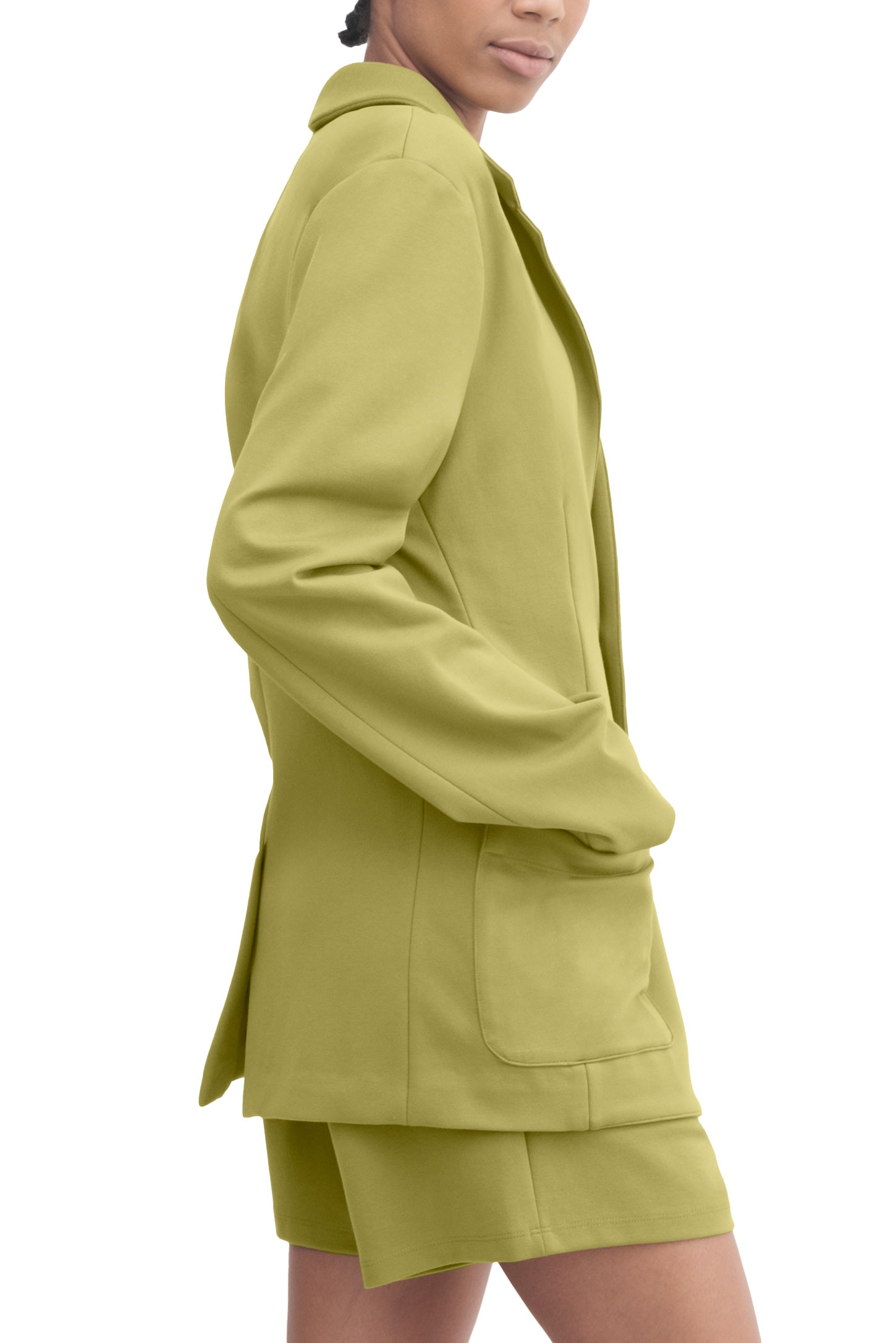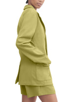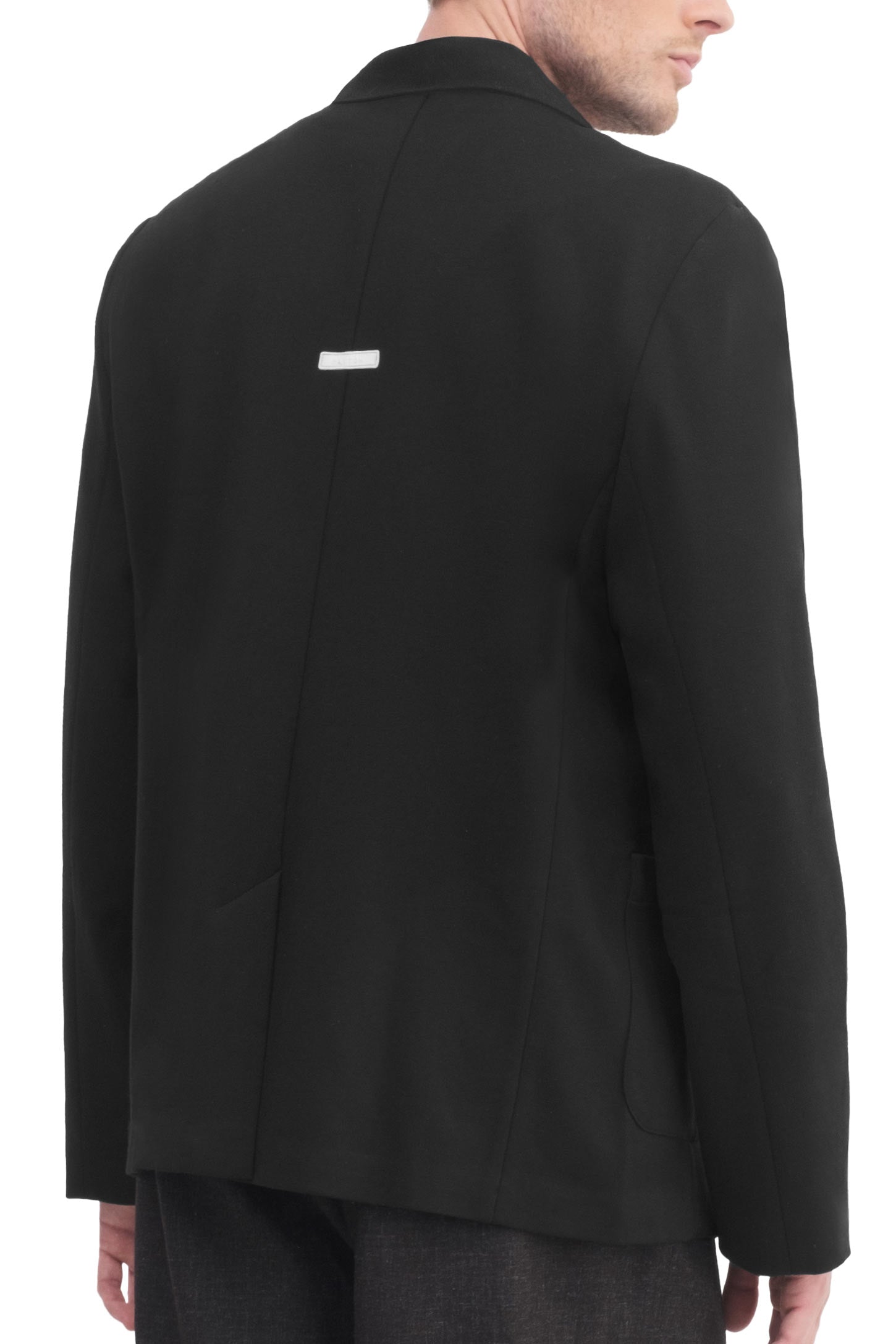 A relaxed-fit, unisex blazer with unpadded shoulders, two-button closure, side patch pockets, partial lining, and a rubber patch logo.