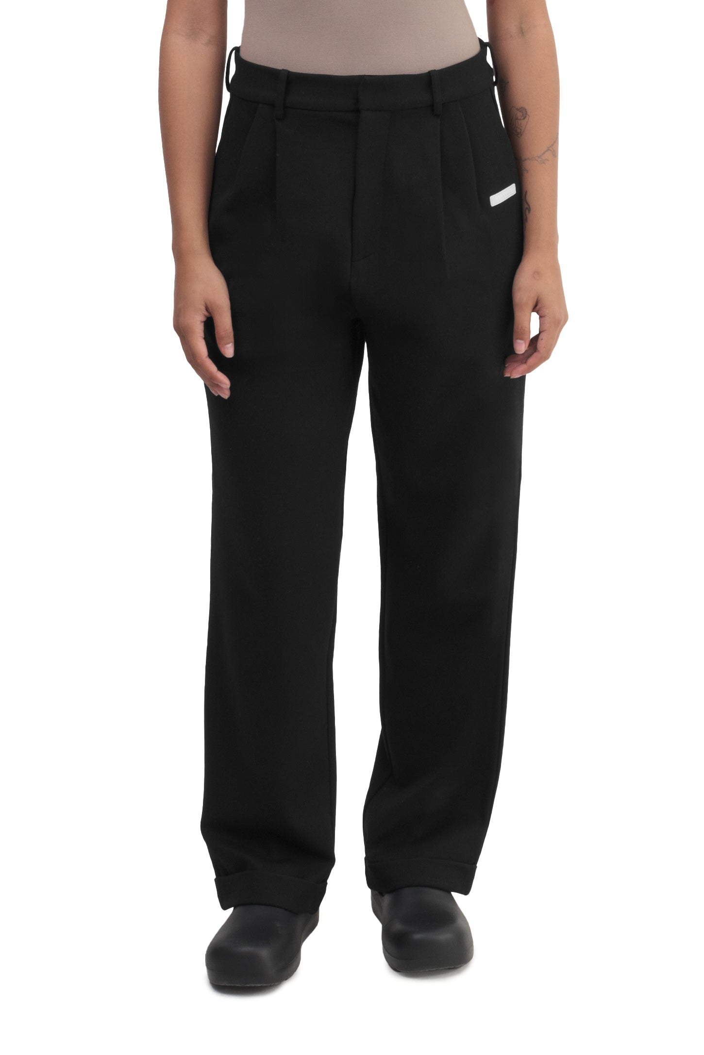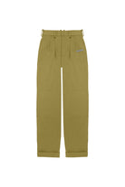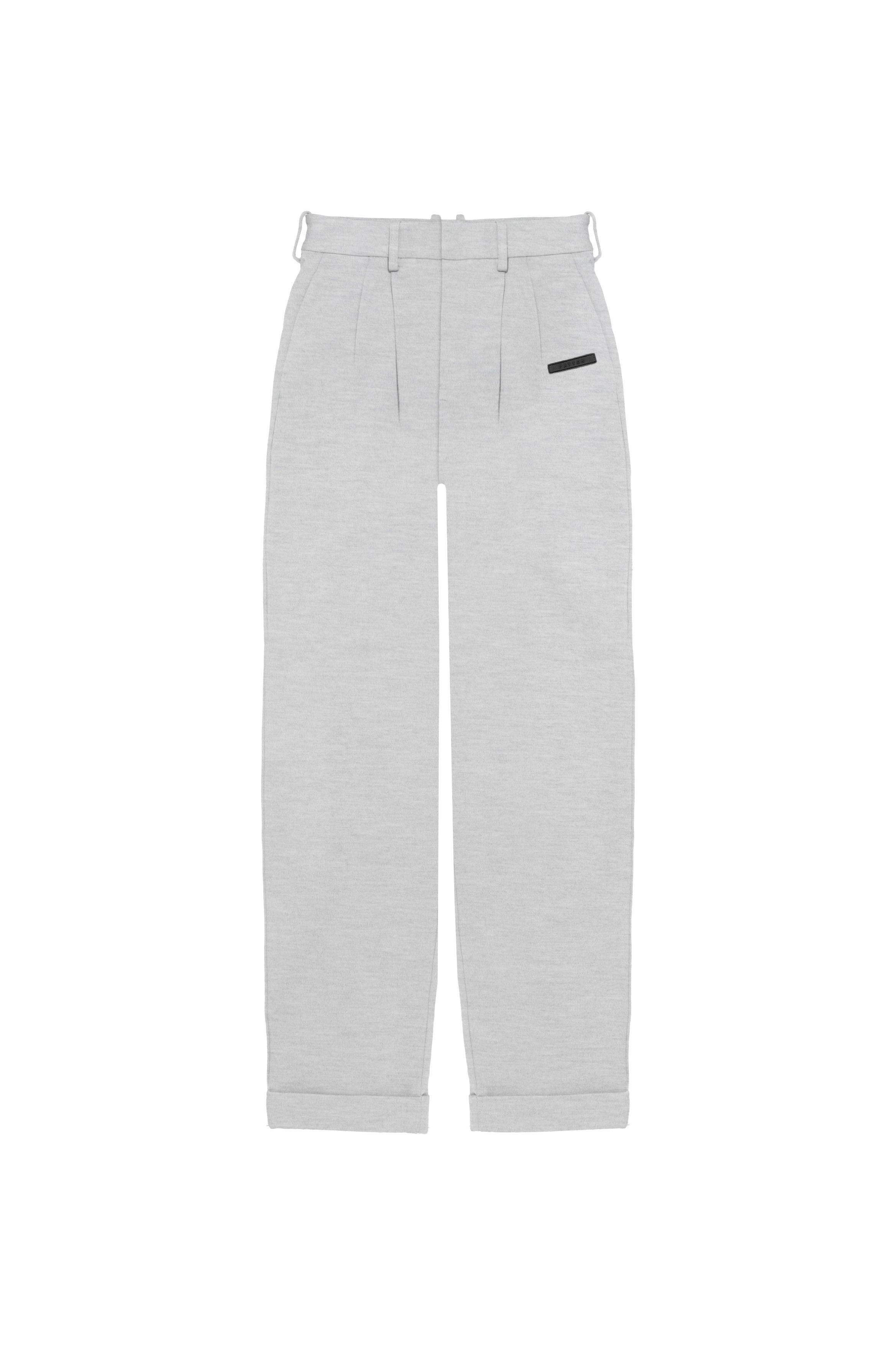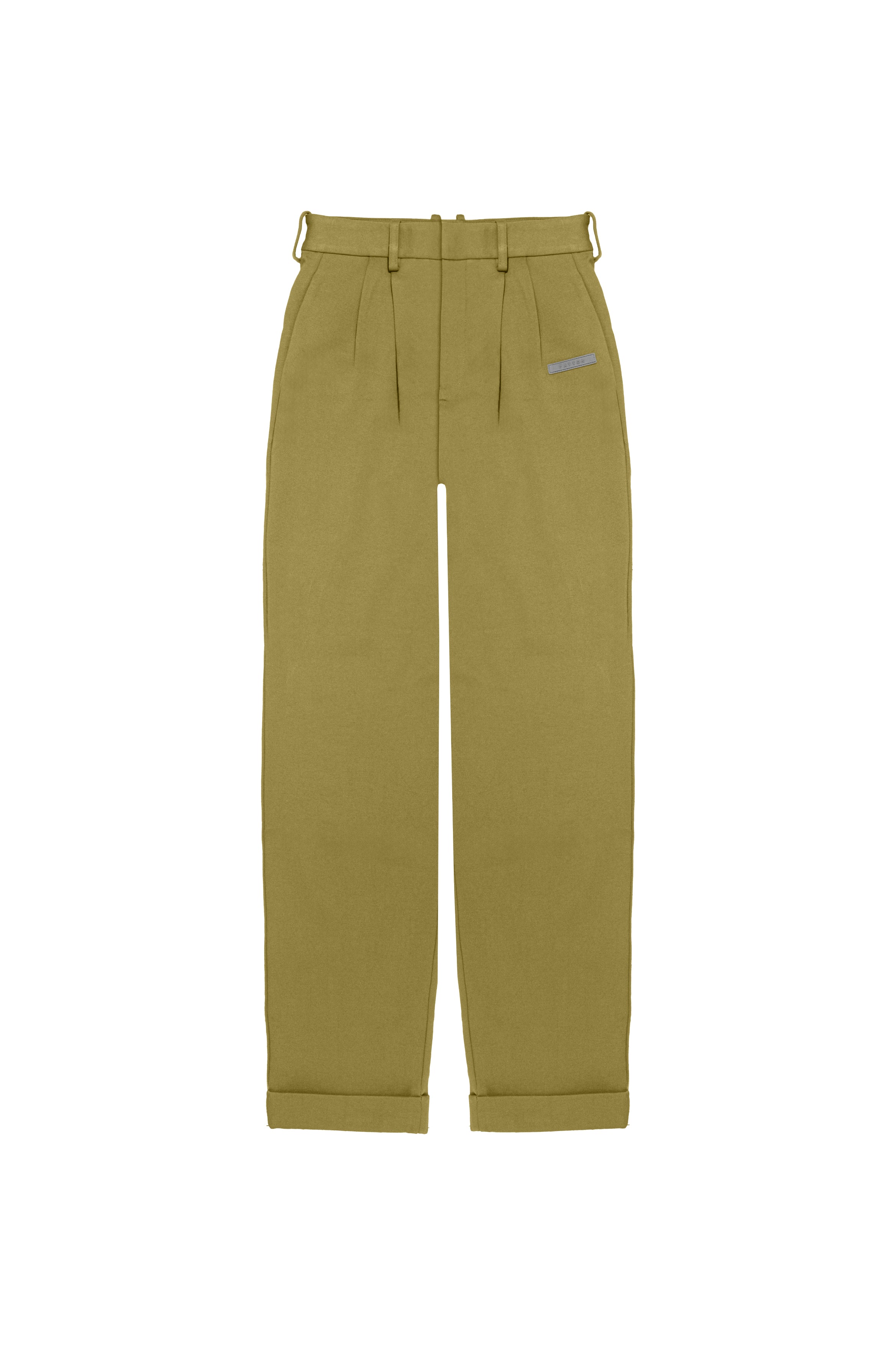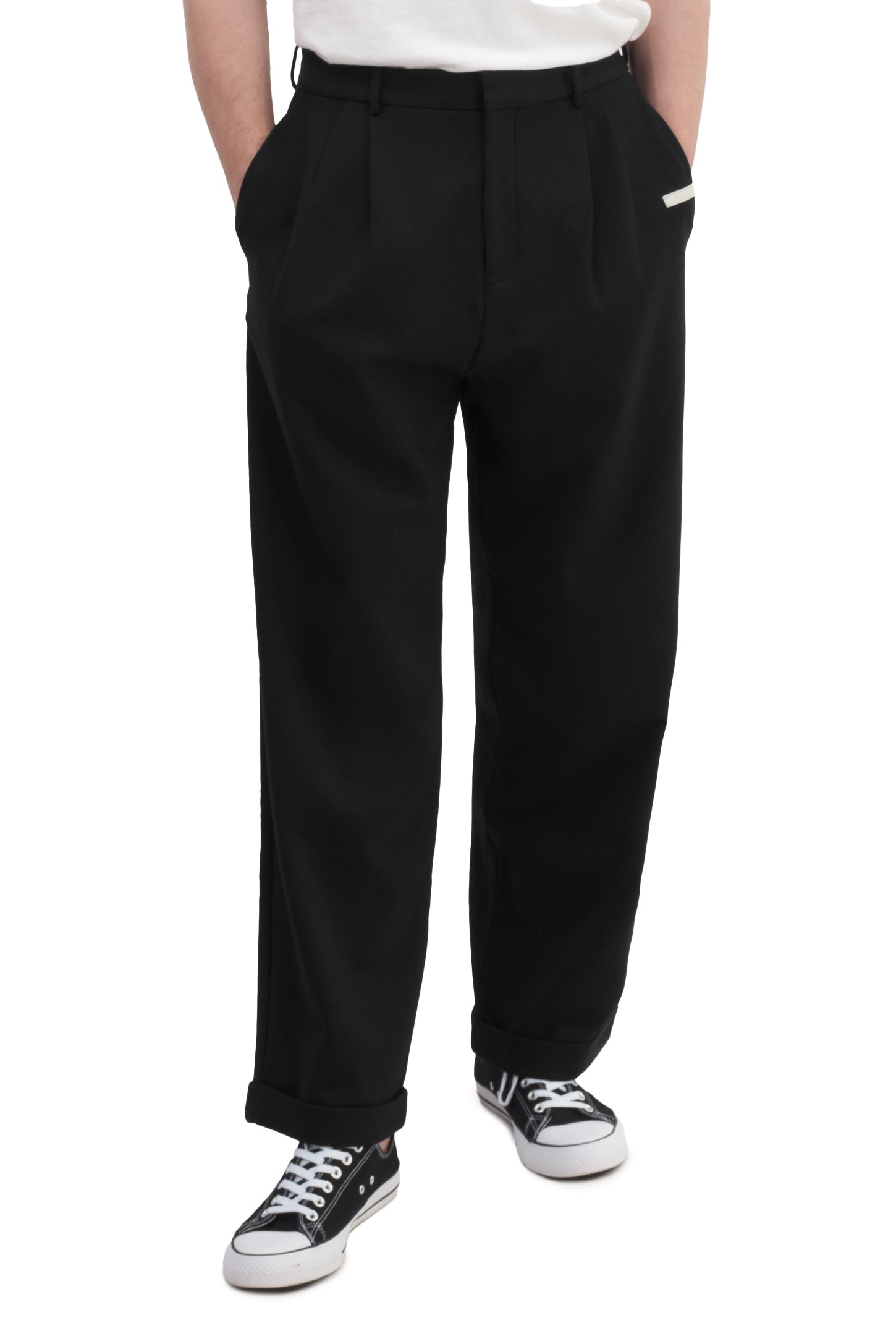 Relaxed-fit, mid-rise unisex trousers that feature a hook with button and zipper closure, frontal pleats, ankle-length design with turn-up hems, side pockets, belt loops, and a rubber patch logo.