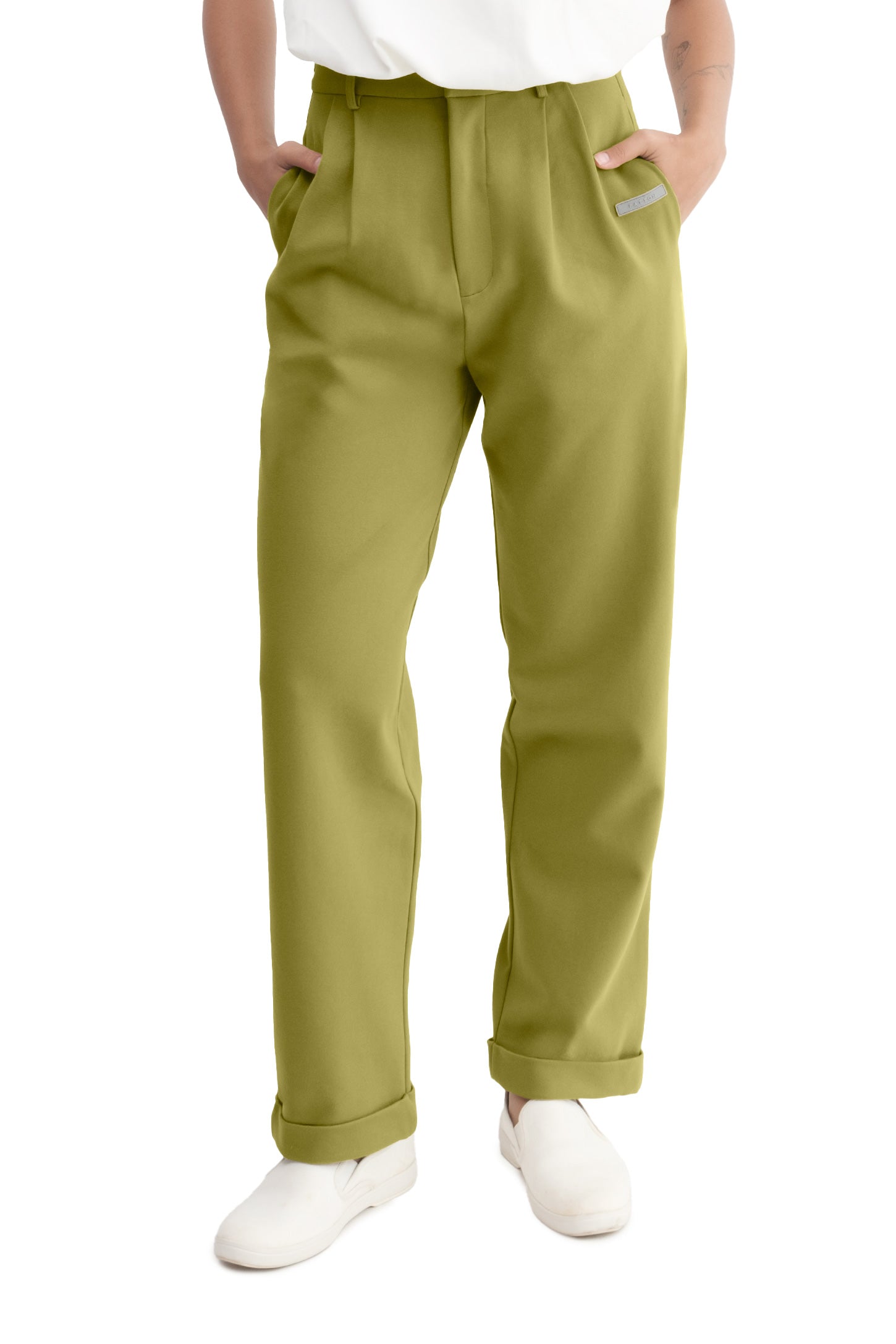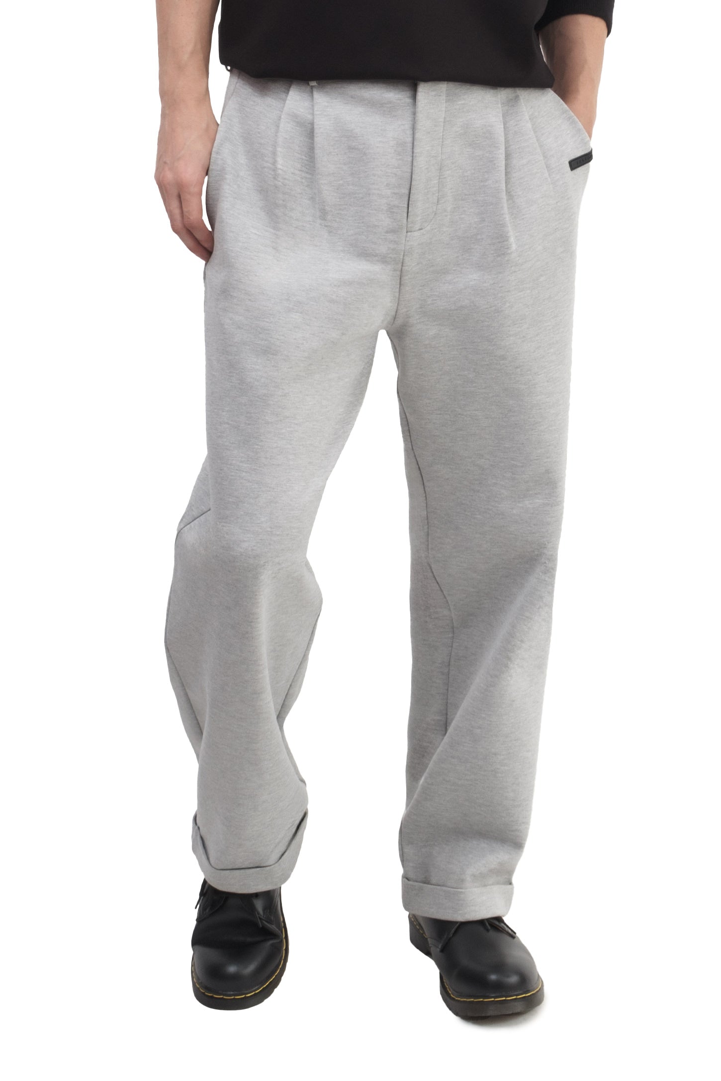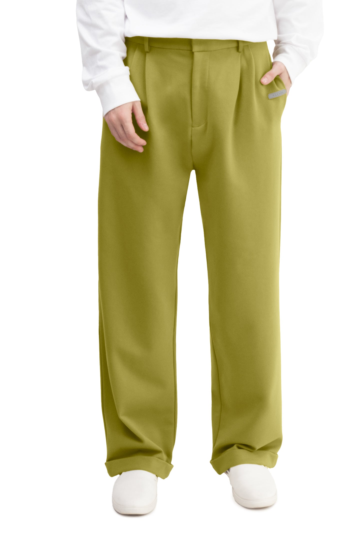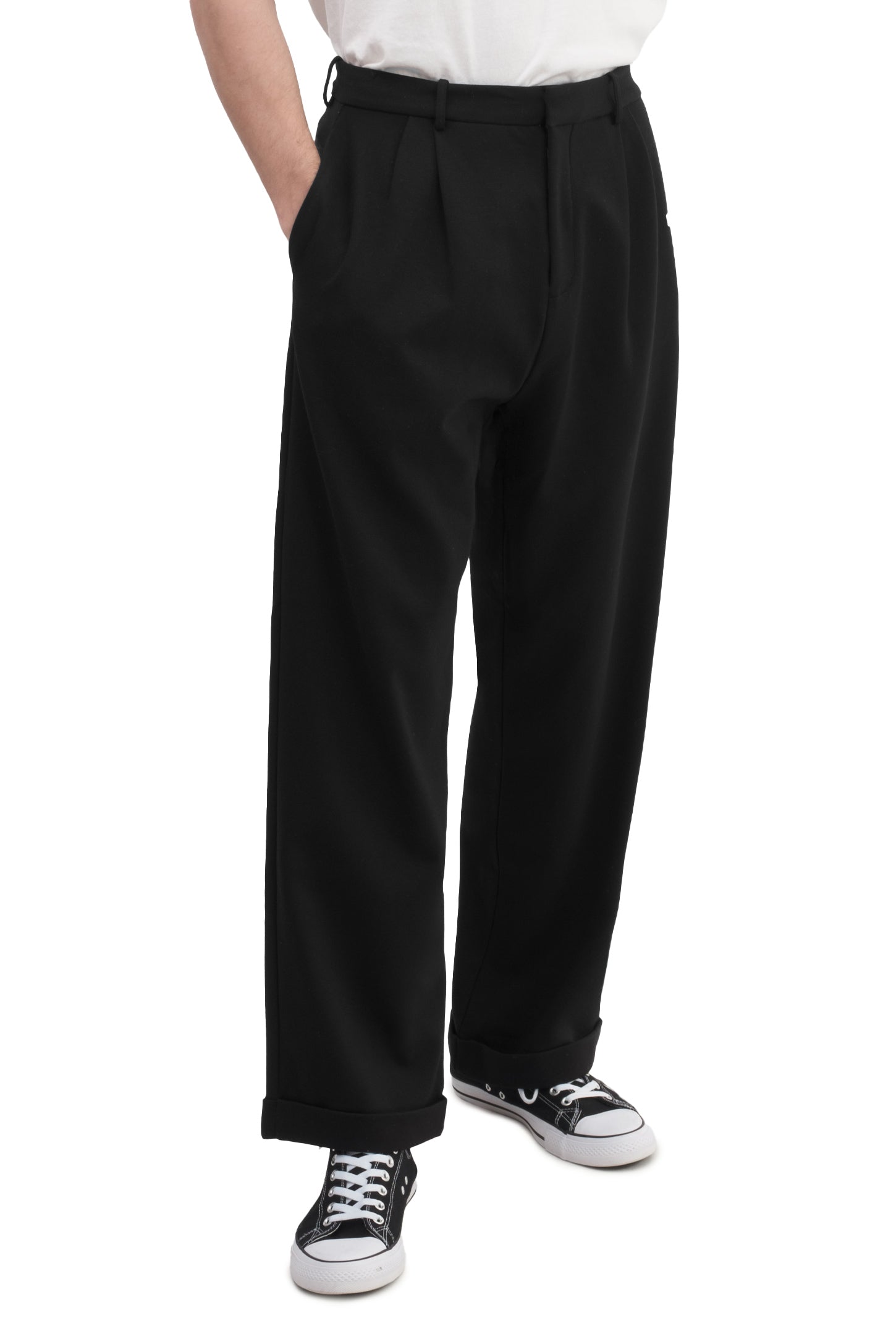 Relaxed-fit, mid-rise unisex trousers that feature a hook with button and zipper closure, frontal pleats, ankle-length design with turn-up hems, side pockets, belt loops, and a rubber patch logo.