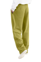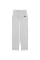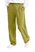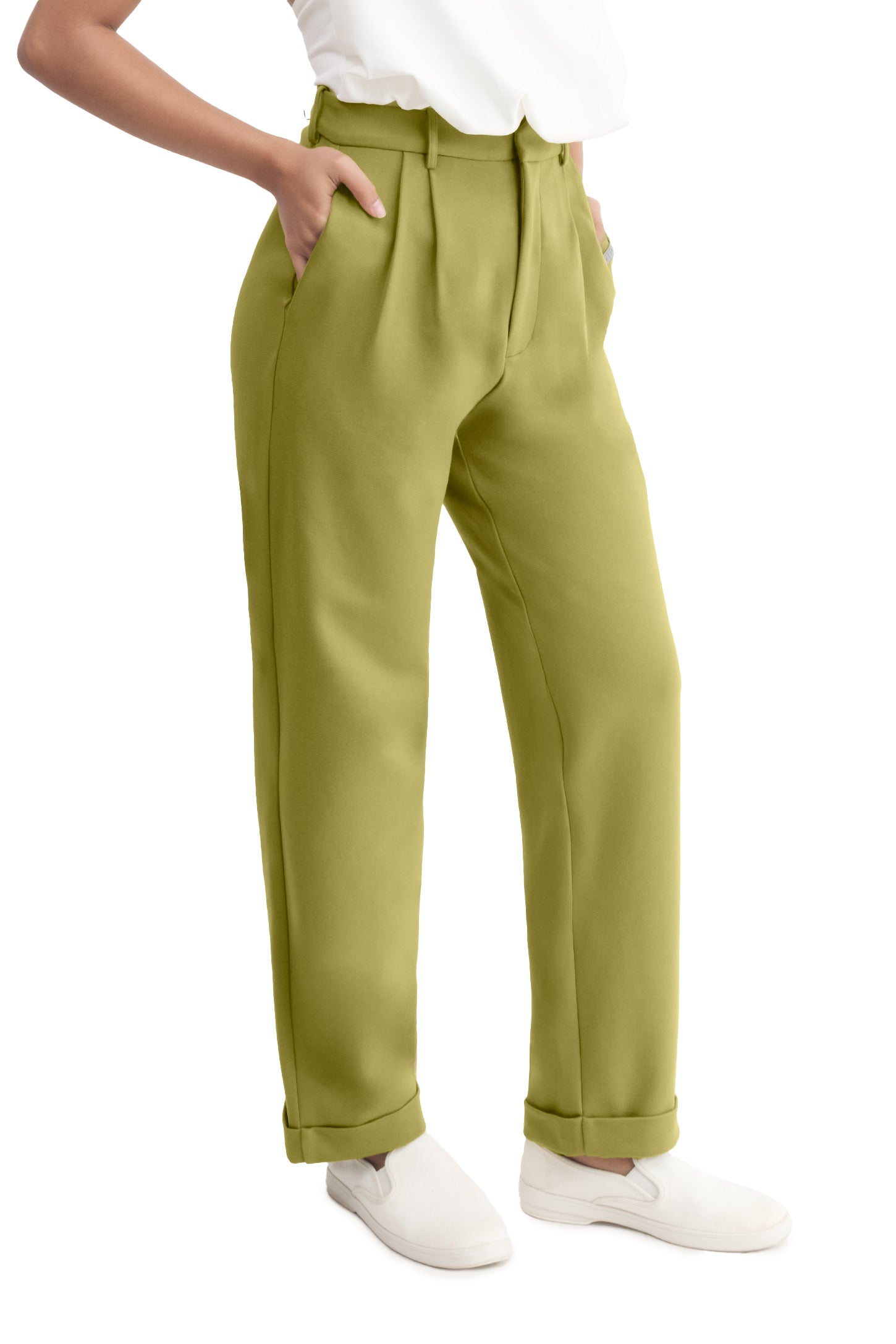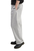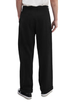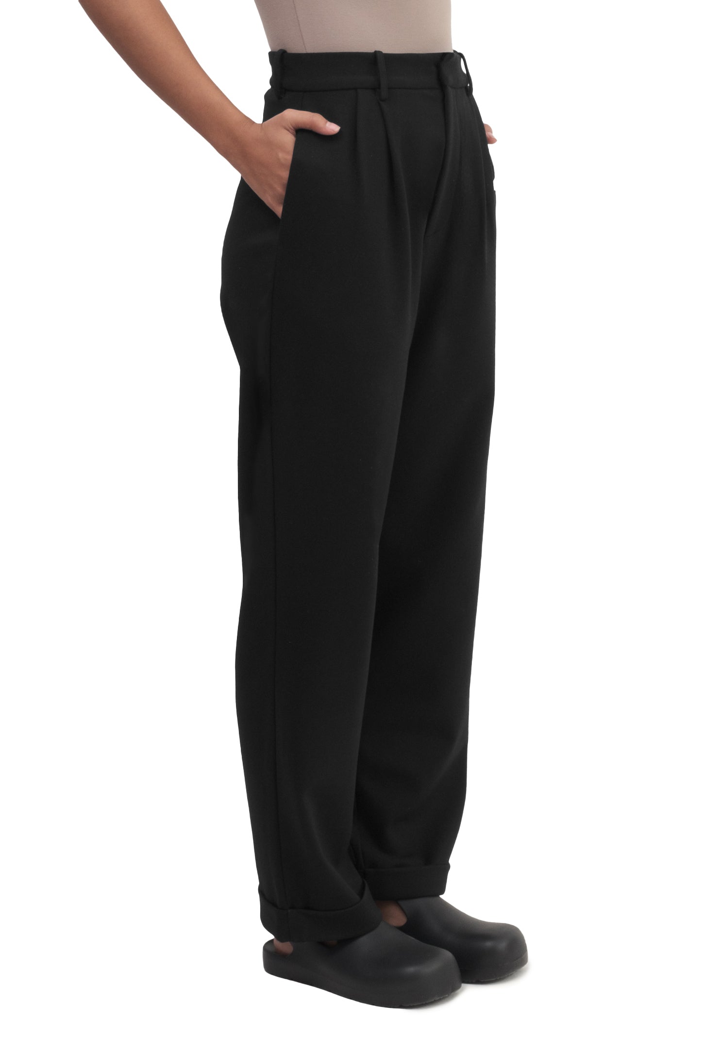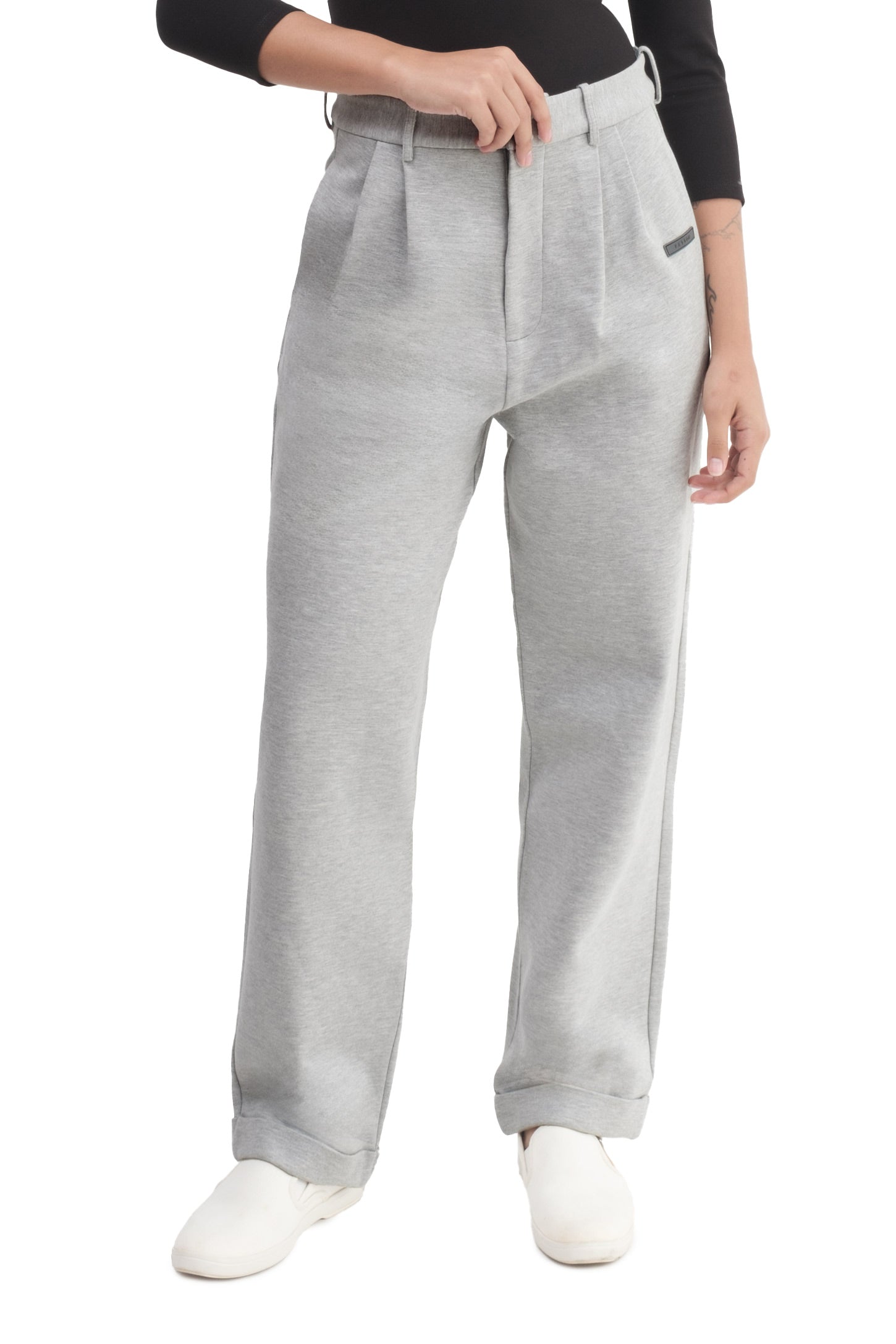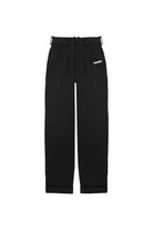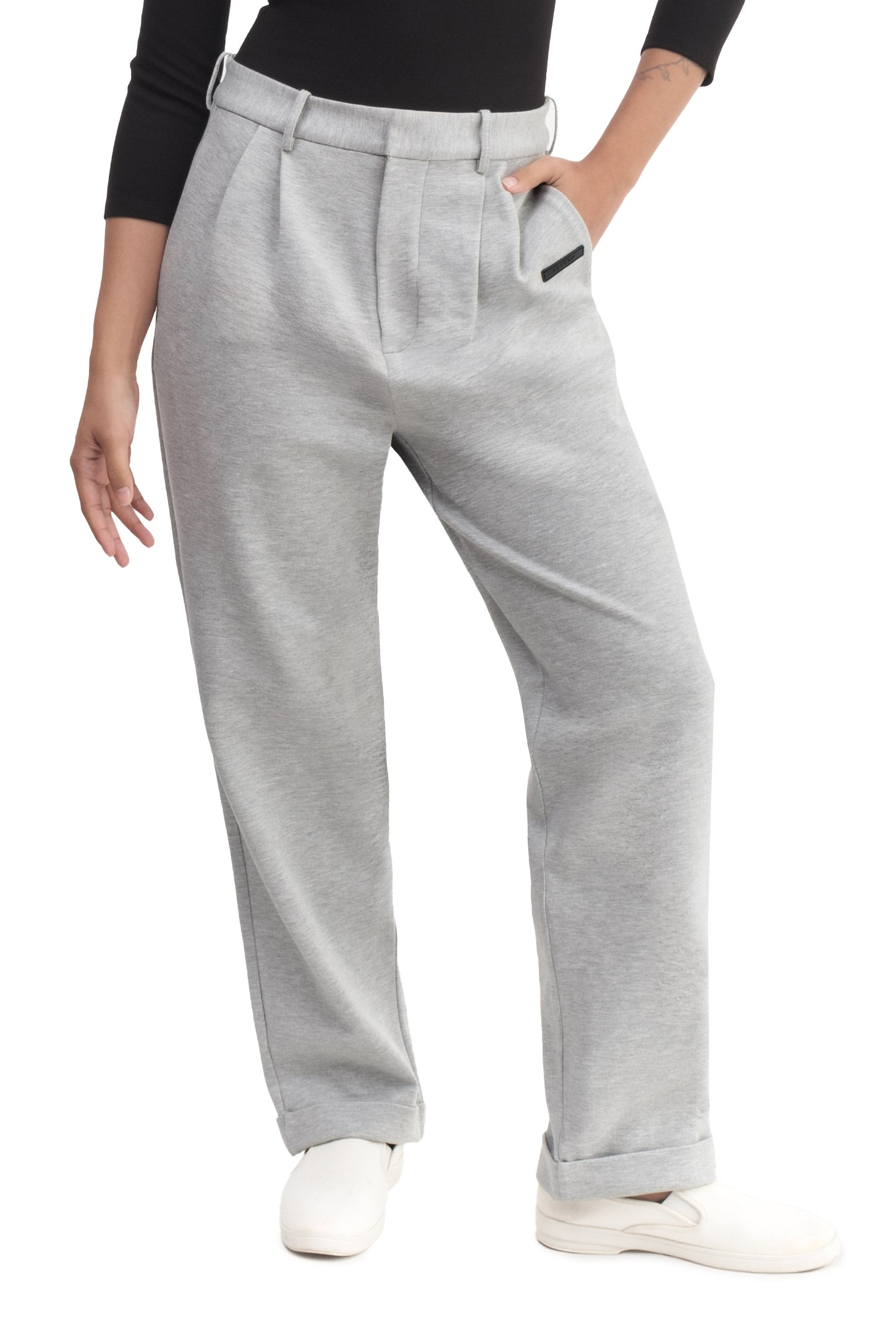 Relaxed-fit, mid-rise unisex trousers that feature a hook with button and zipper closure, frontal pleats, ankle-length design with turn-up hems, side pockets, belt loops, and a rubber patch logo.