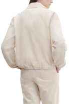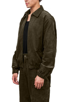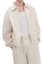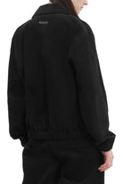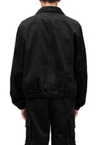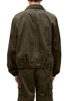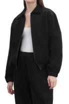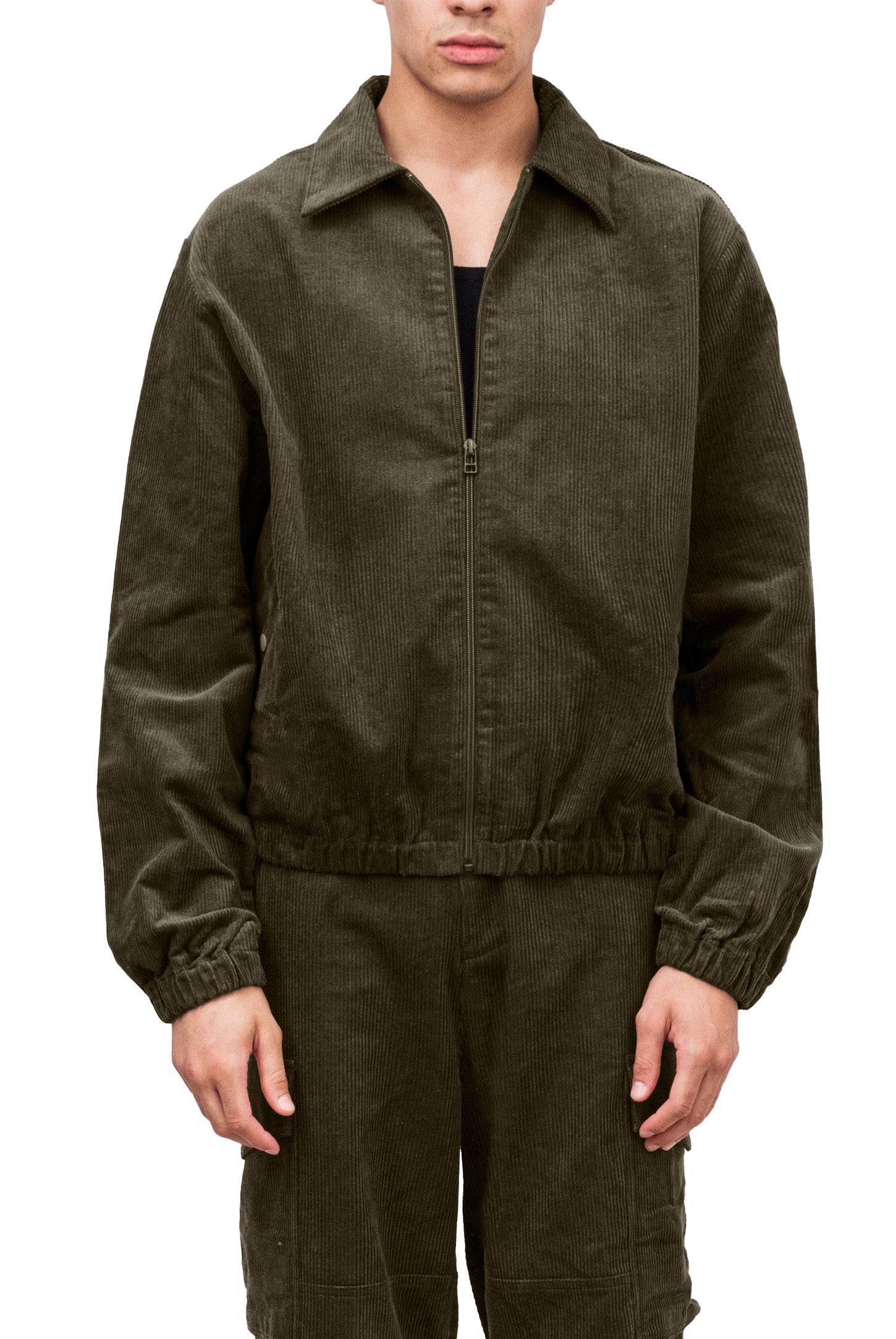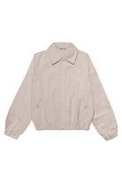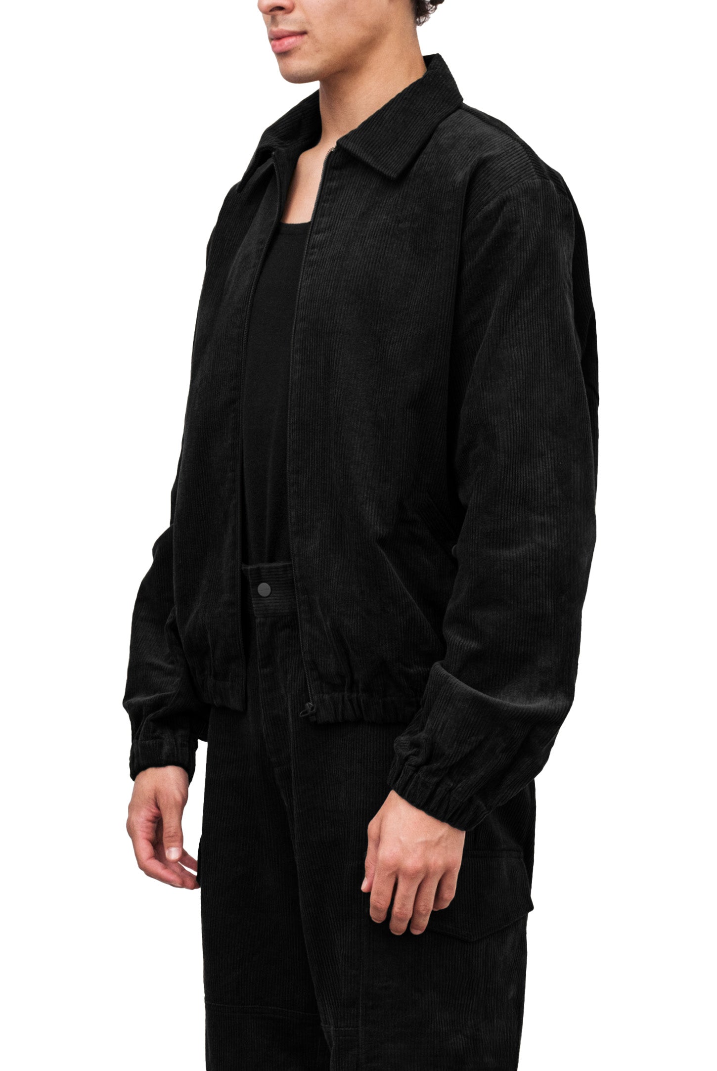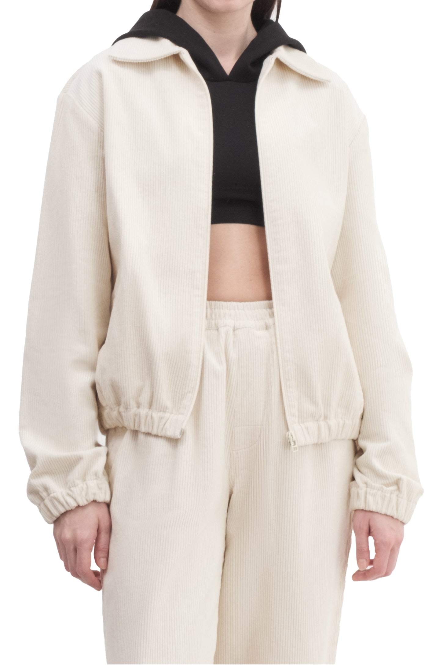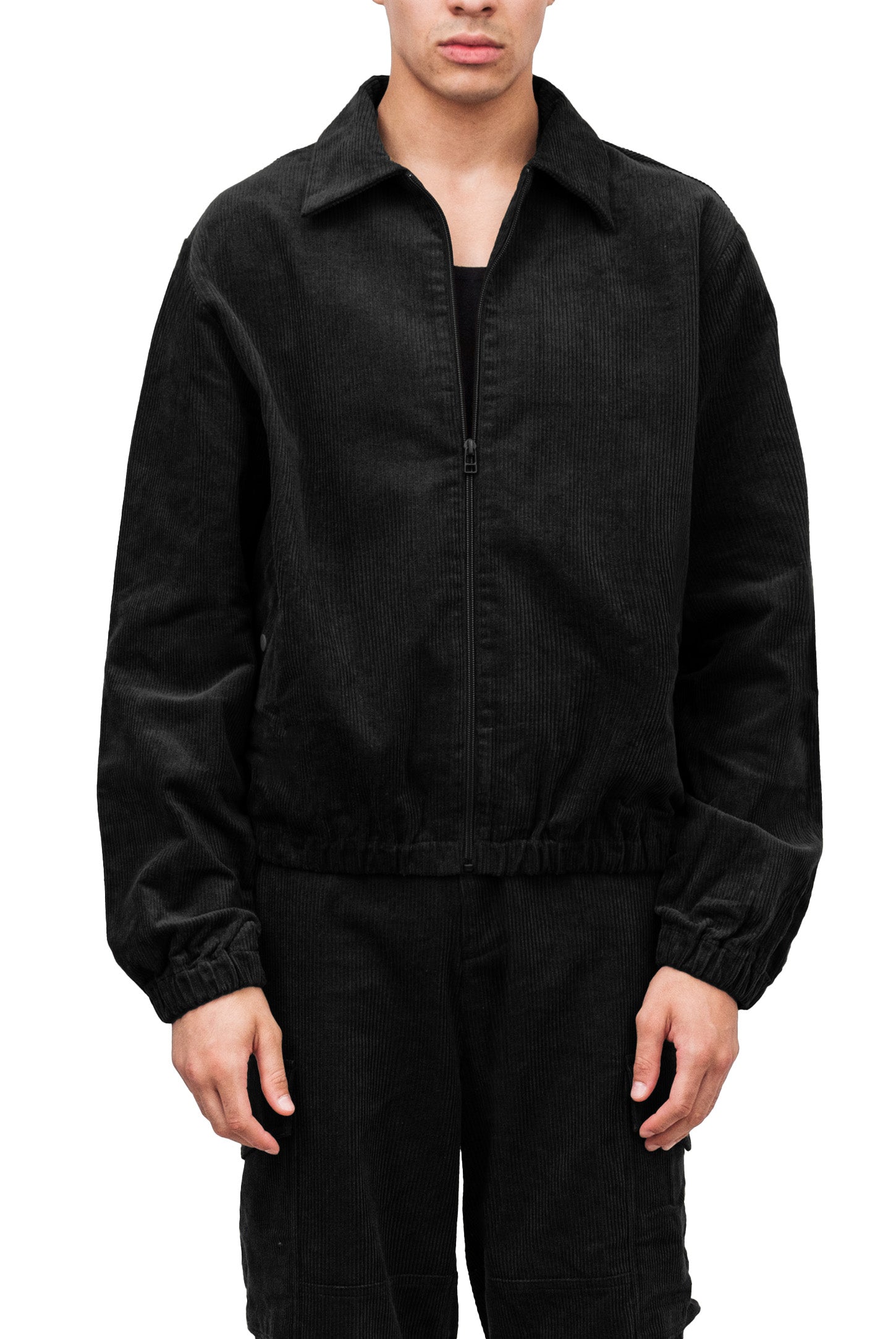 A unisex zip-up jacket featuring a classic collar, side pockets with snap enclosures, gartered cuffs and hem, and a rubber patch logo.