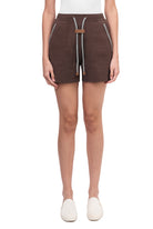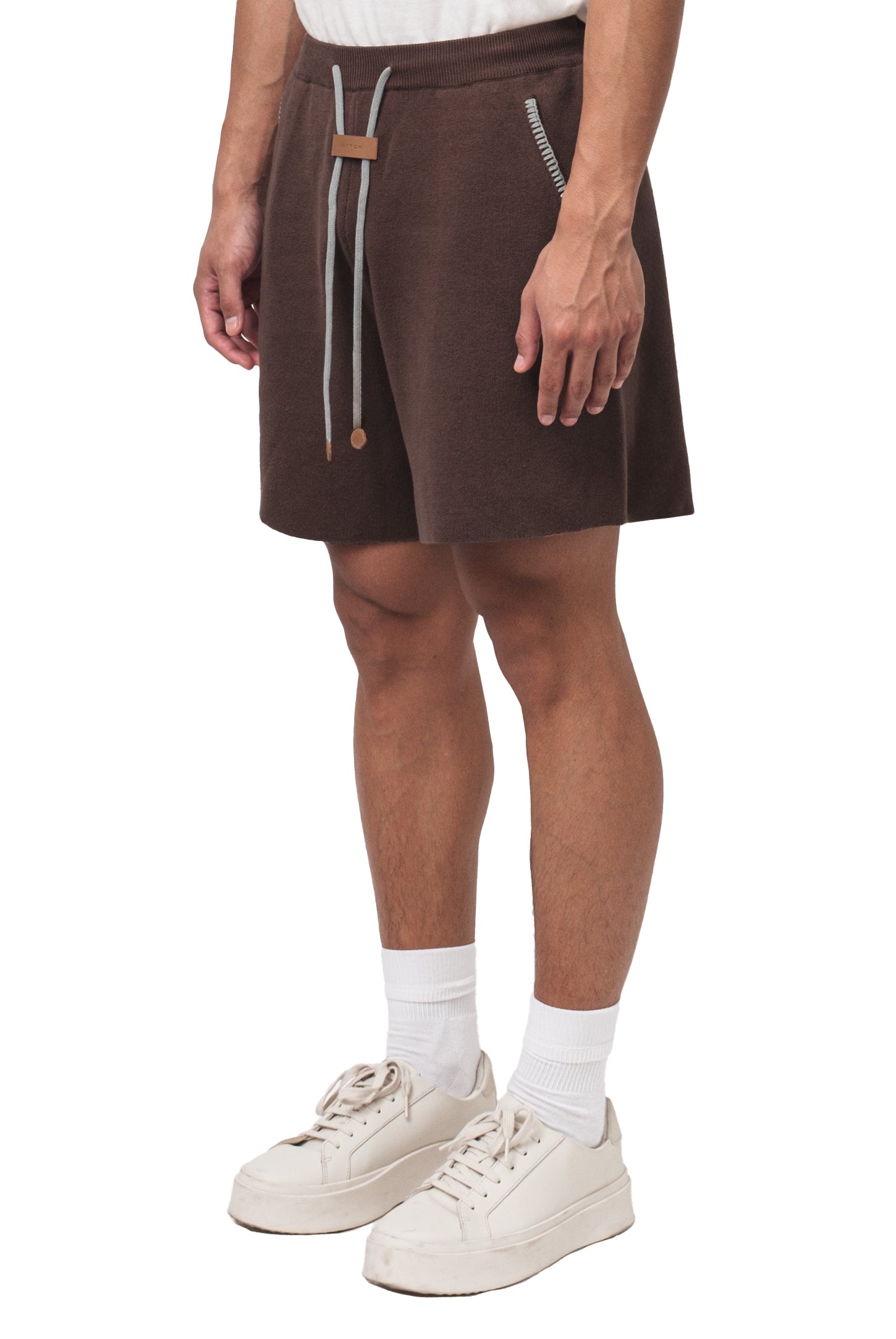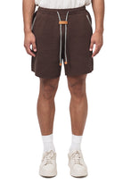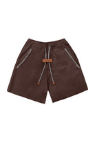 Relaxed fit, unisex shorts with contrast-color stitching, gartered waistband, adjustable strings with leather aglets, side pockets, and a jacron label.