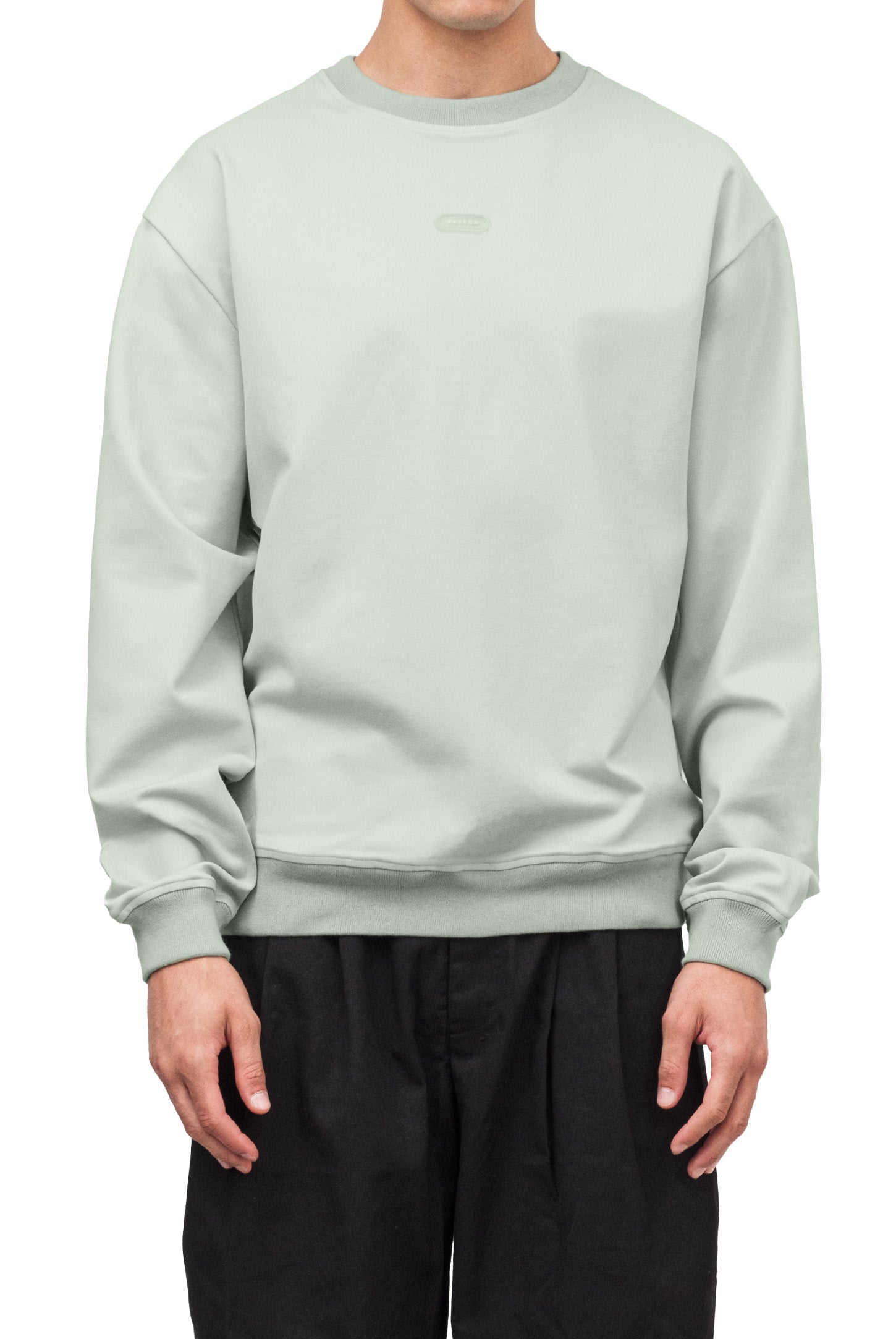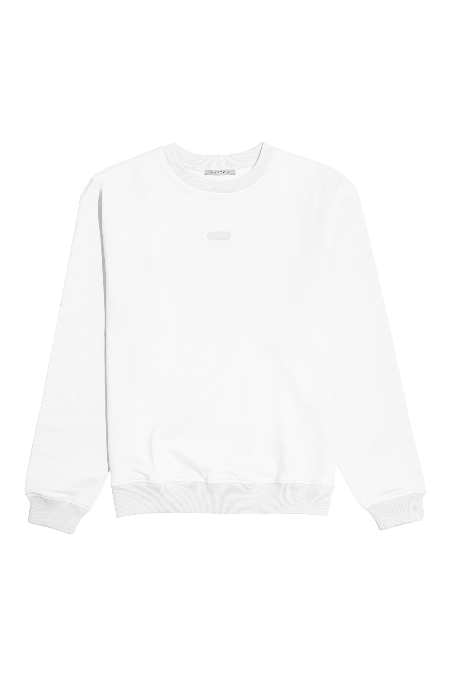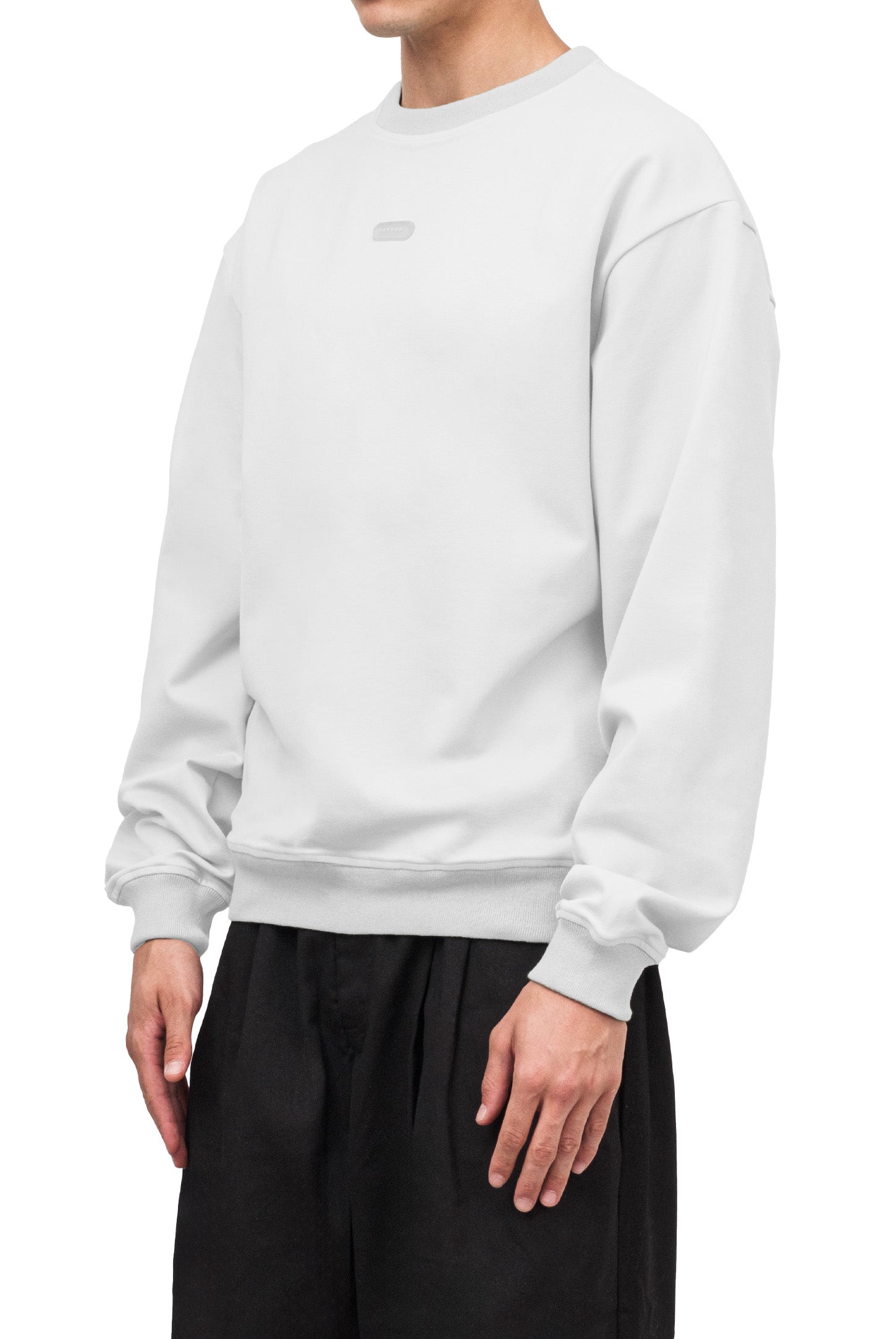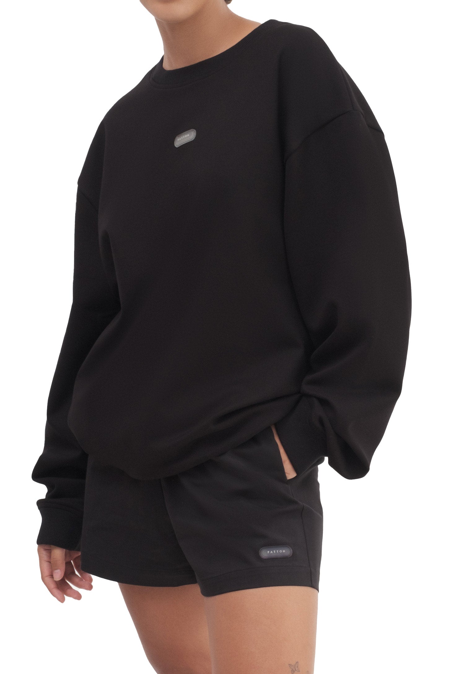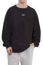 An oversized pullover with a ribbed crew neckline and cuffs, and a rubber patch logo.