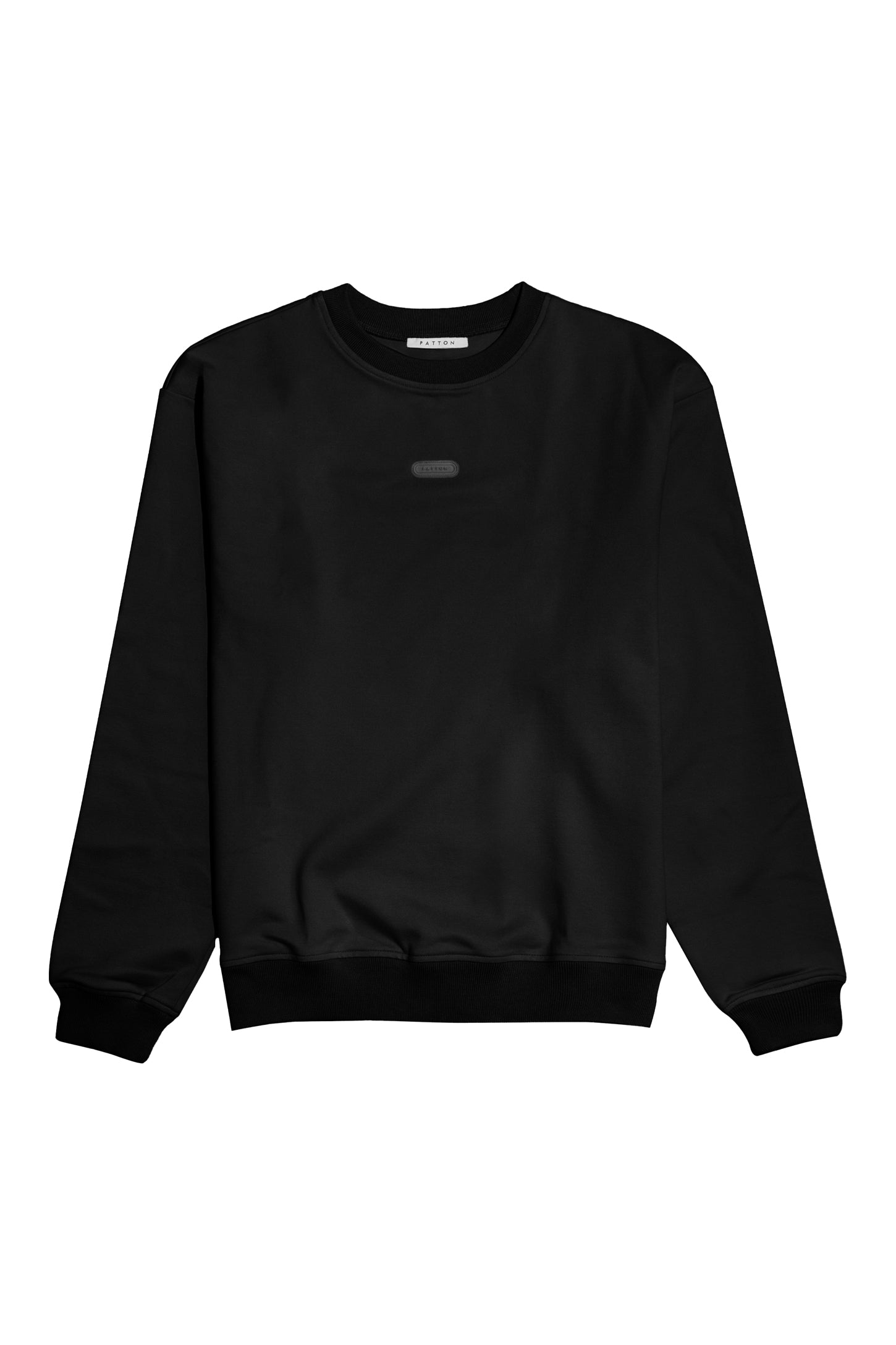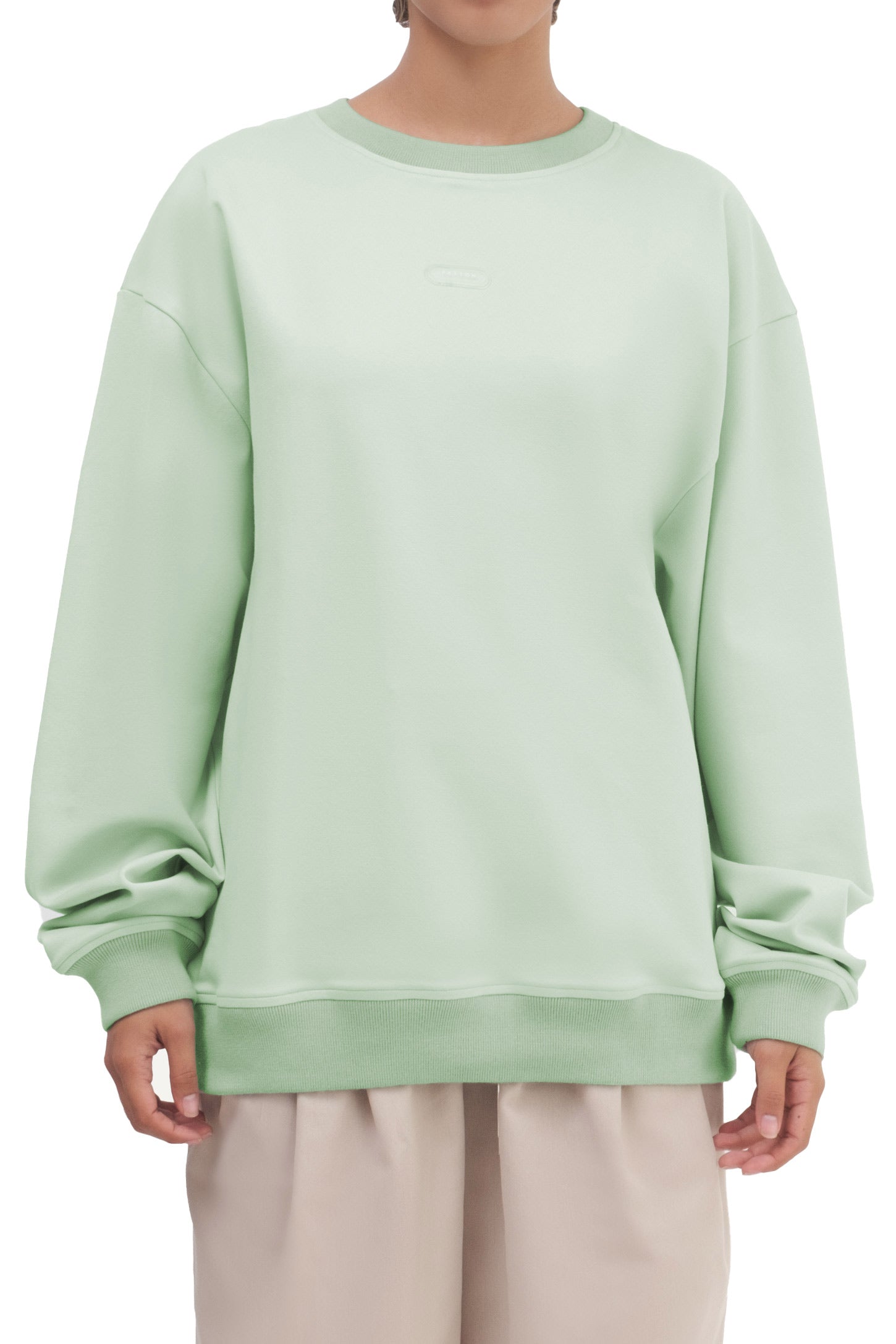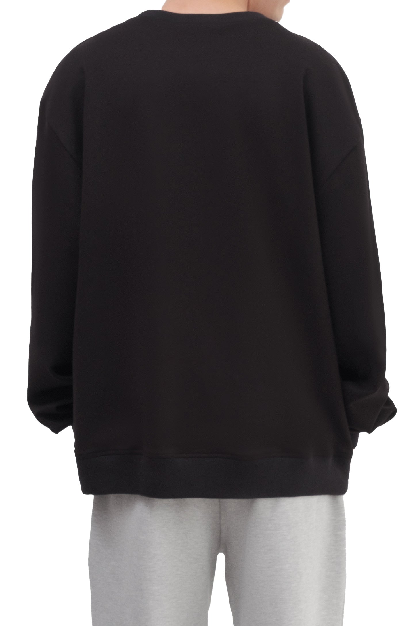 An oversized pullover with a ribbed crew neckline and cuffs, and a rubber patch logo.