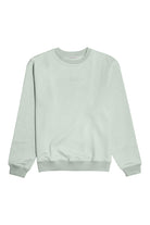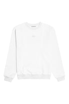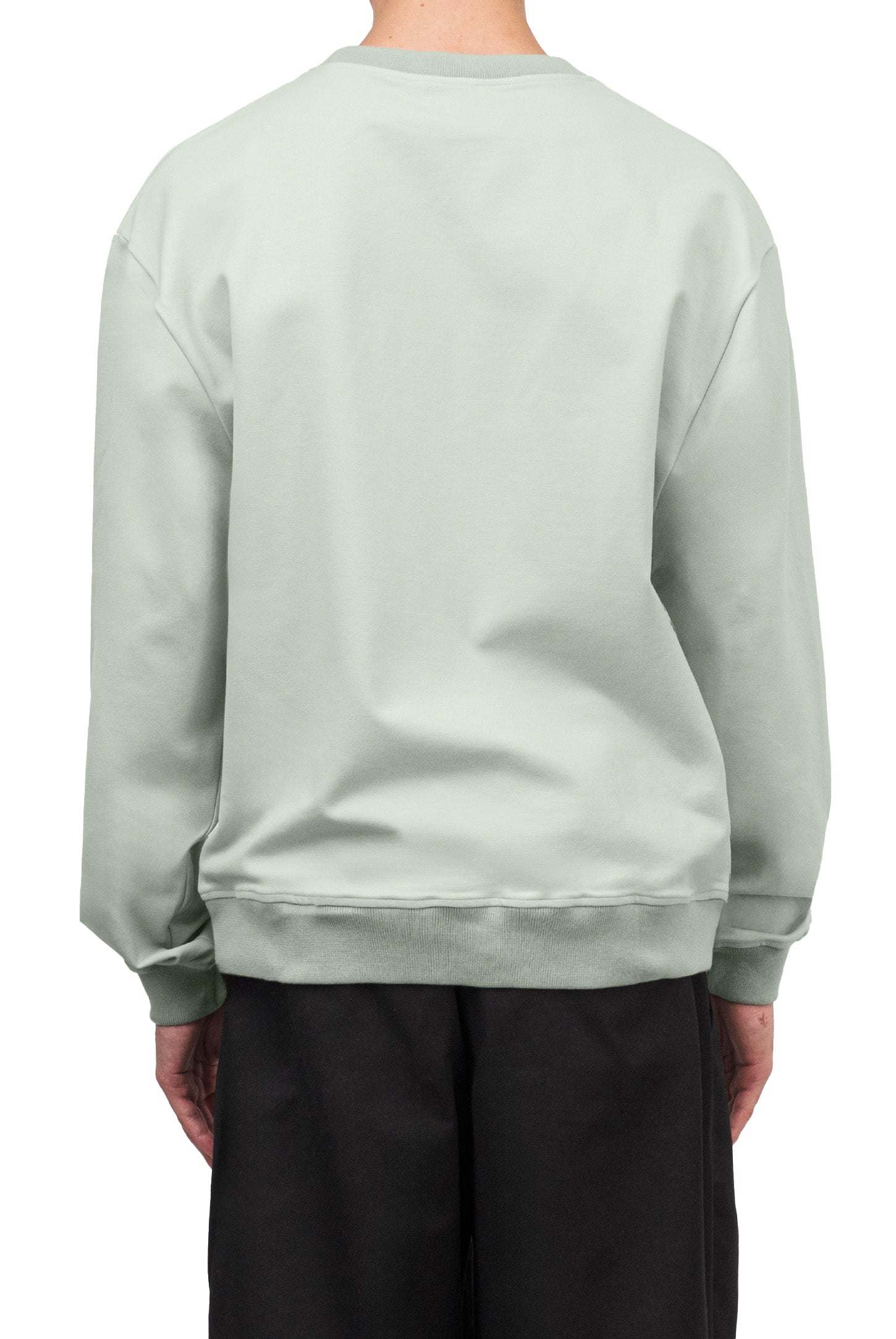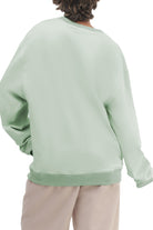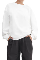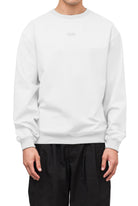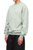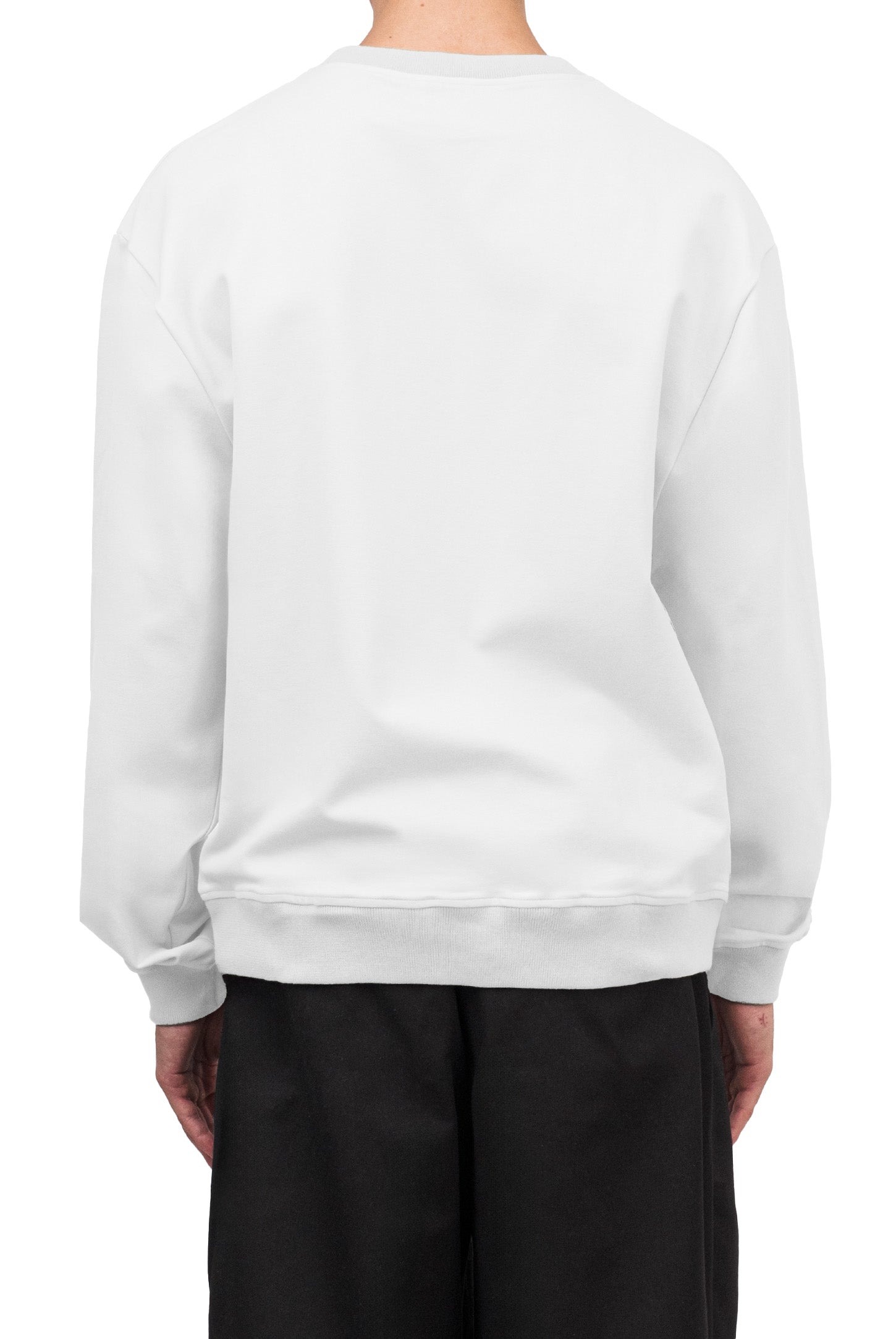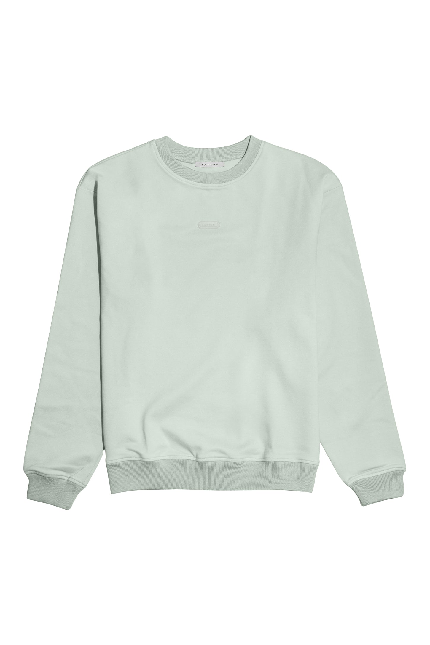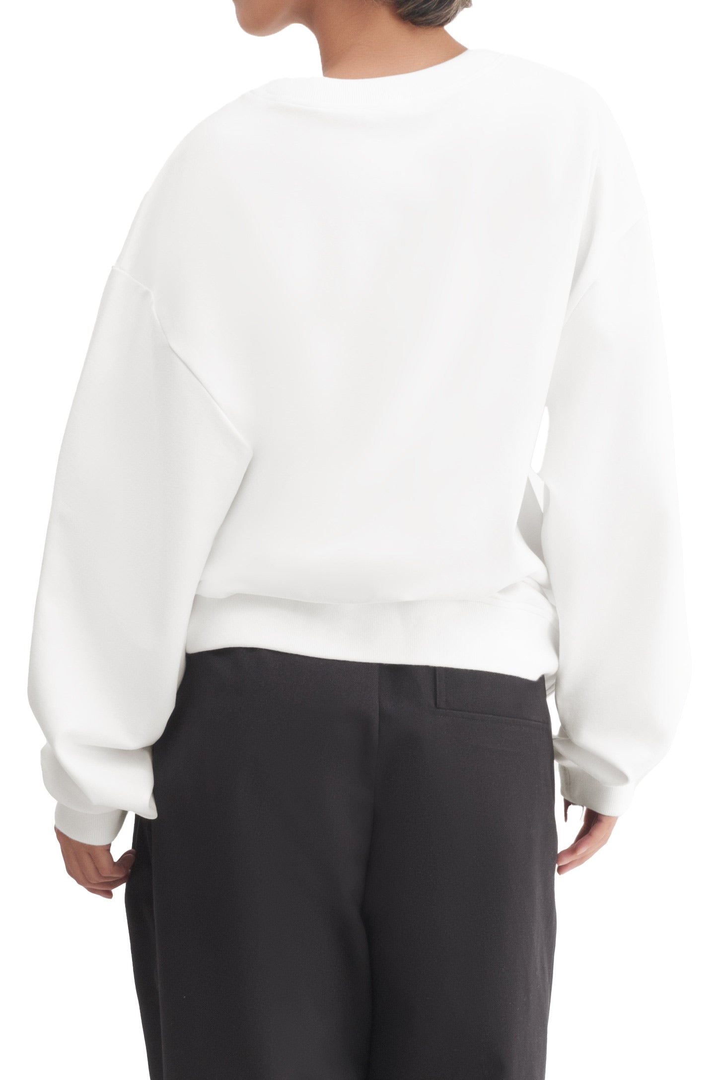 An oversized pullover with a ribbed crew neckline and cuffs, and a rubber patch logo.