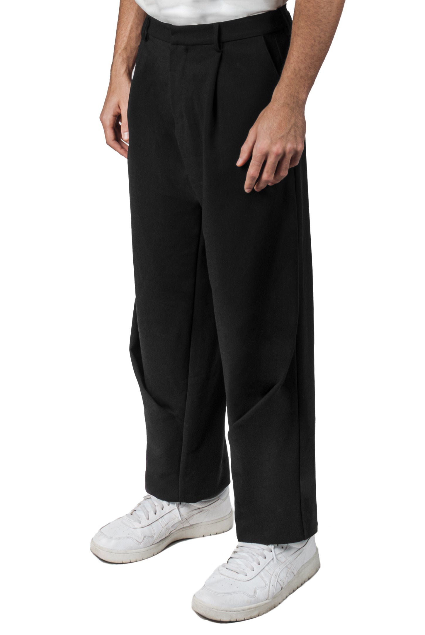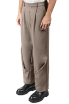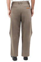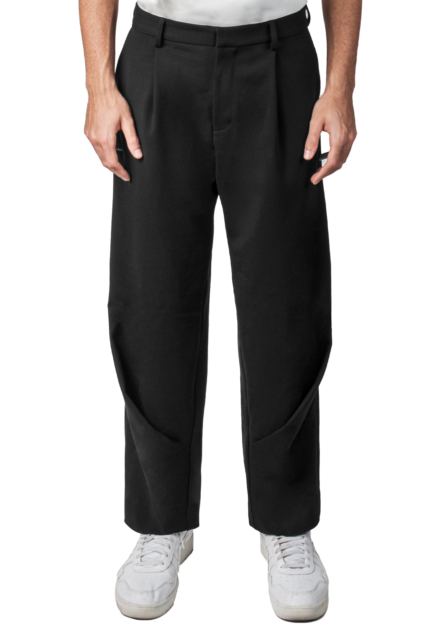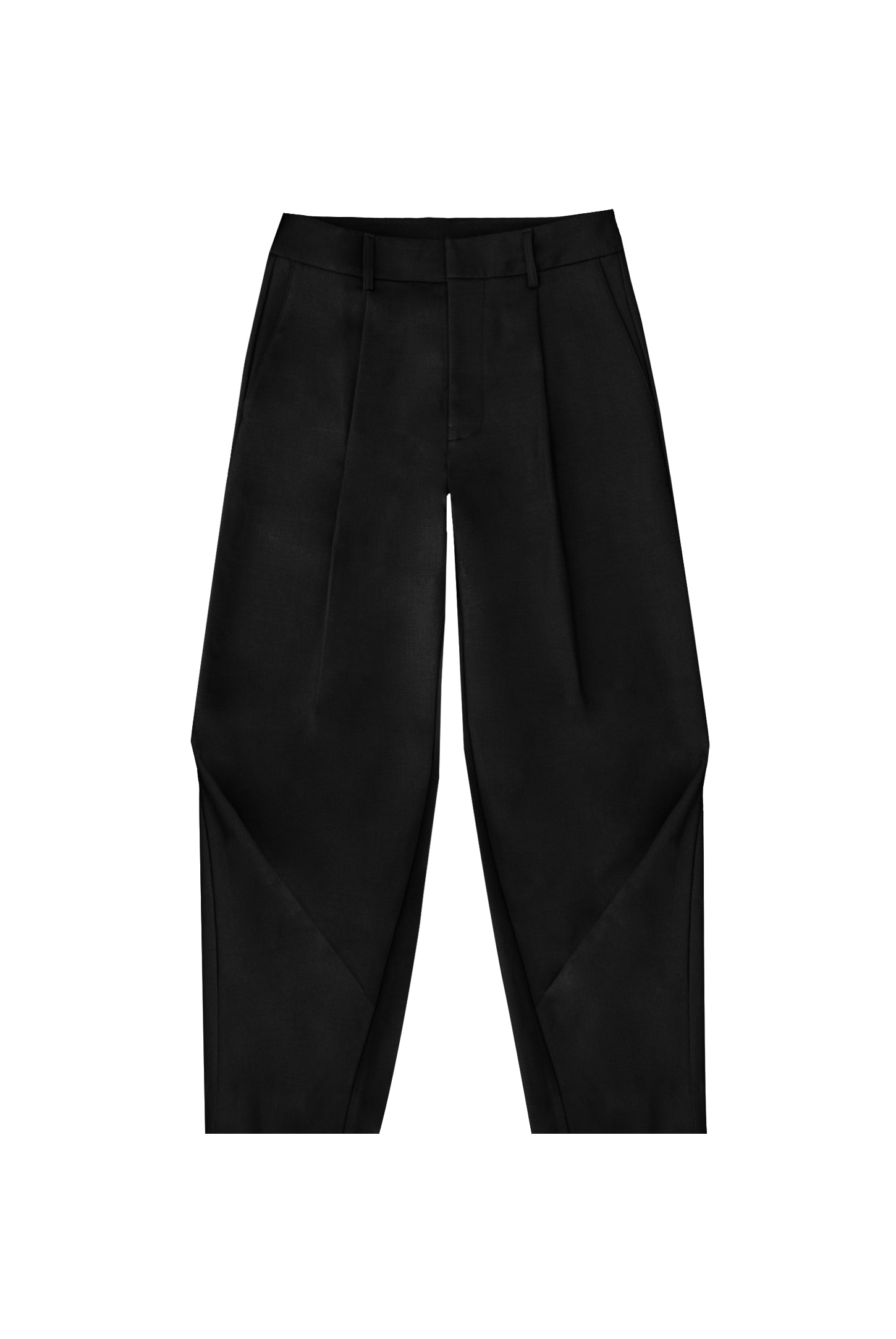 Relaxed-fit, unisex trousers with curved pleated hems, a hook and zipper closure, side and back welt pockets, belt loops, and a jacron label.