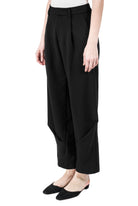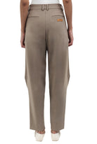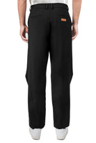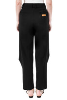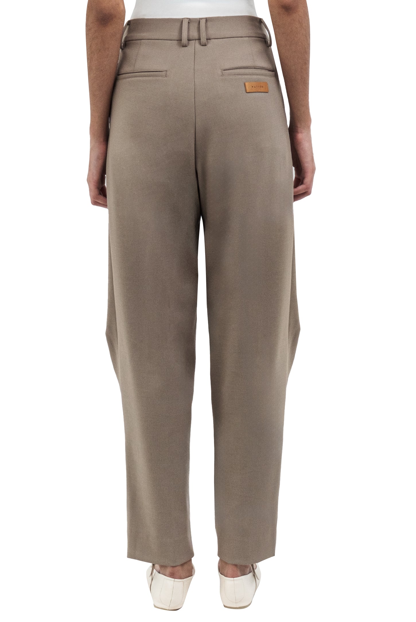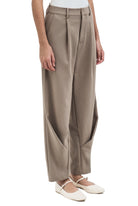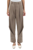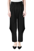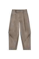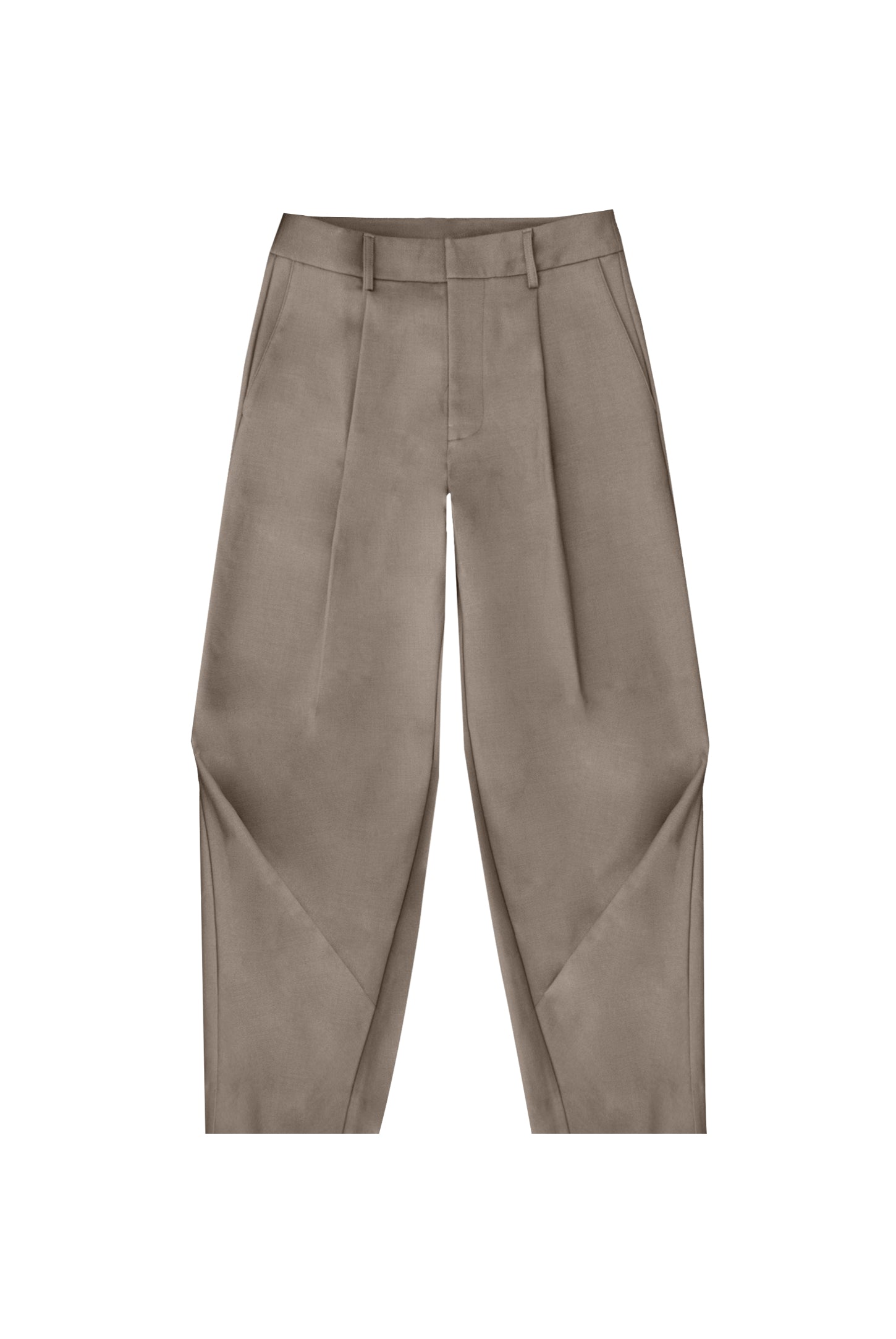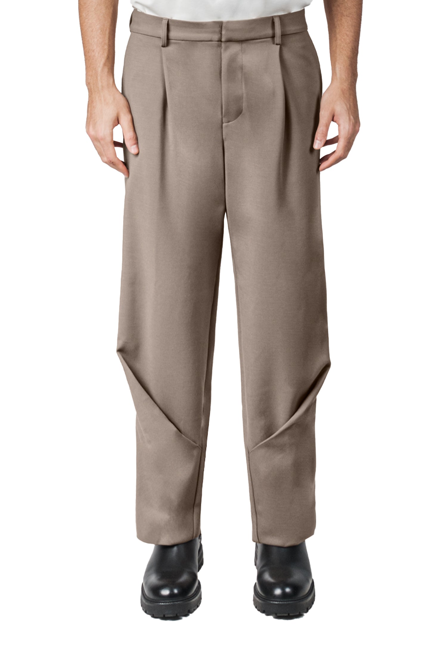 Relaxed-fit, unisex trousers with curved pleated hems, a hook and zipper closure, side and back welt pockets, belt loops, and a jacron label.