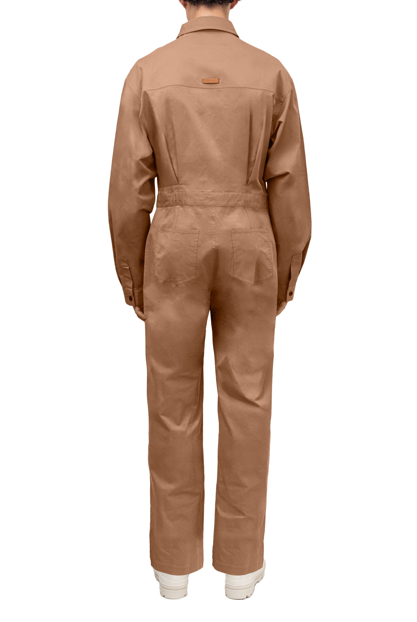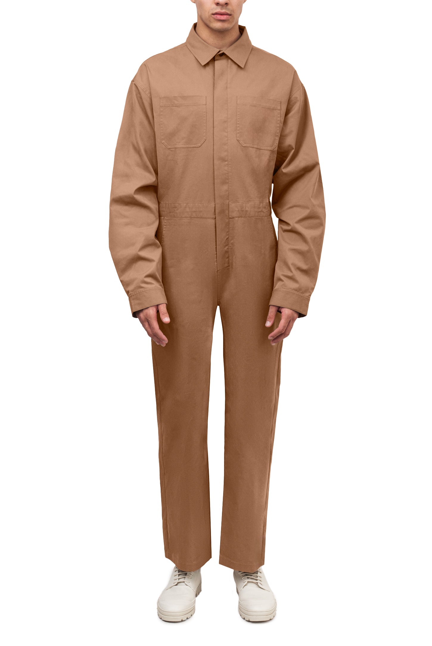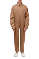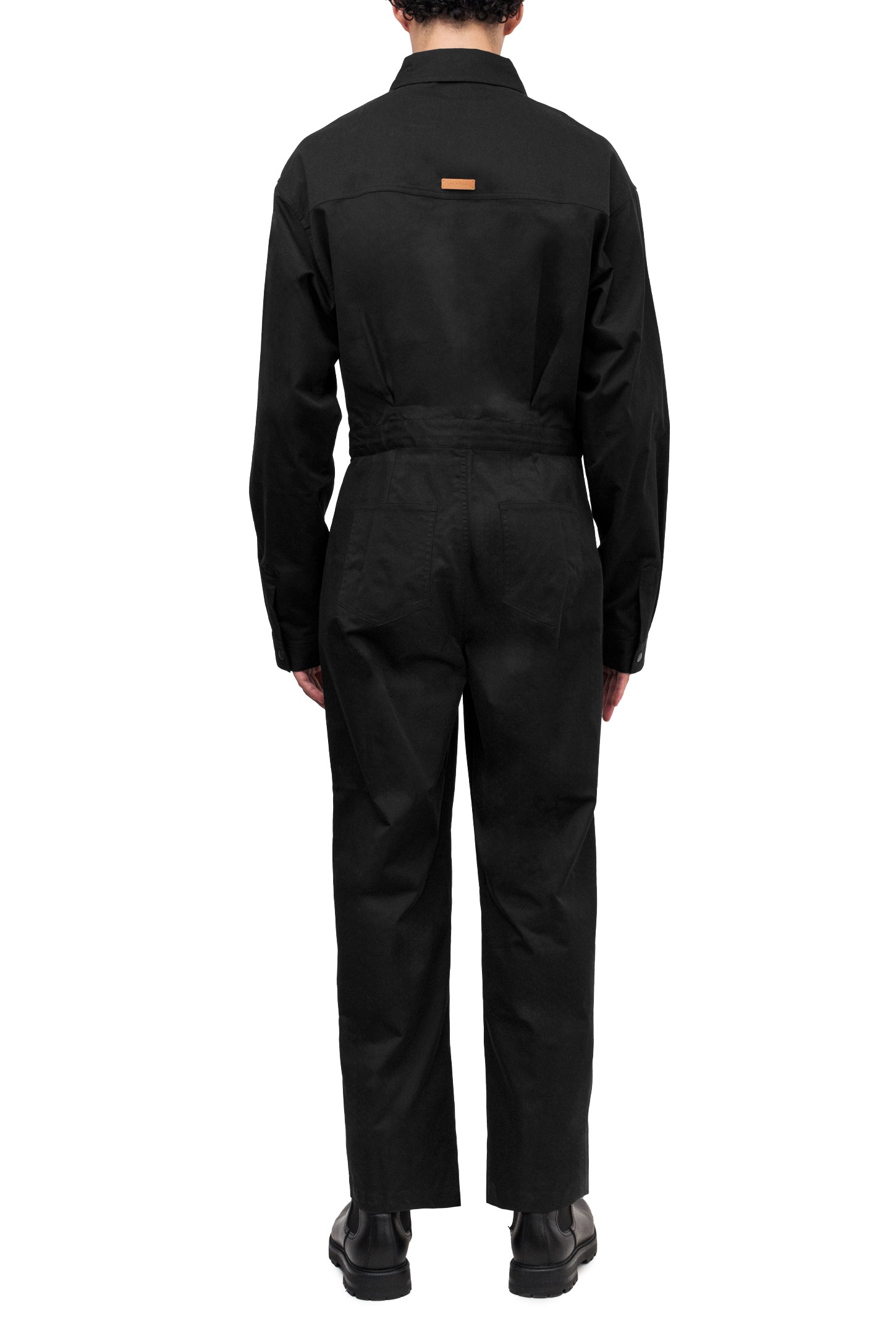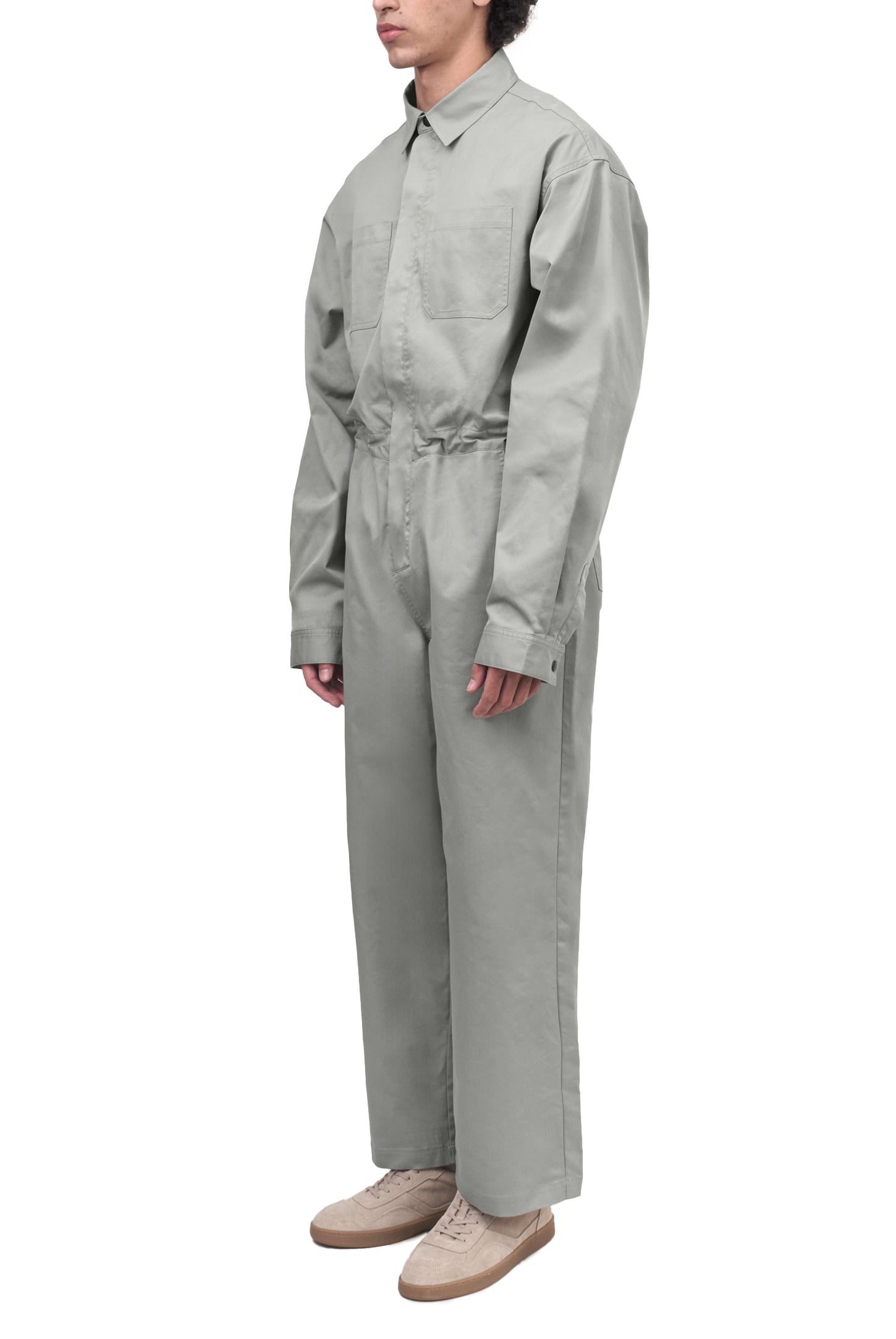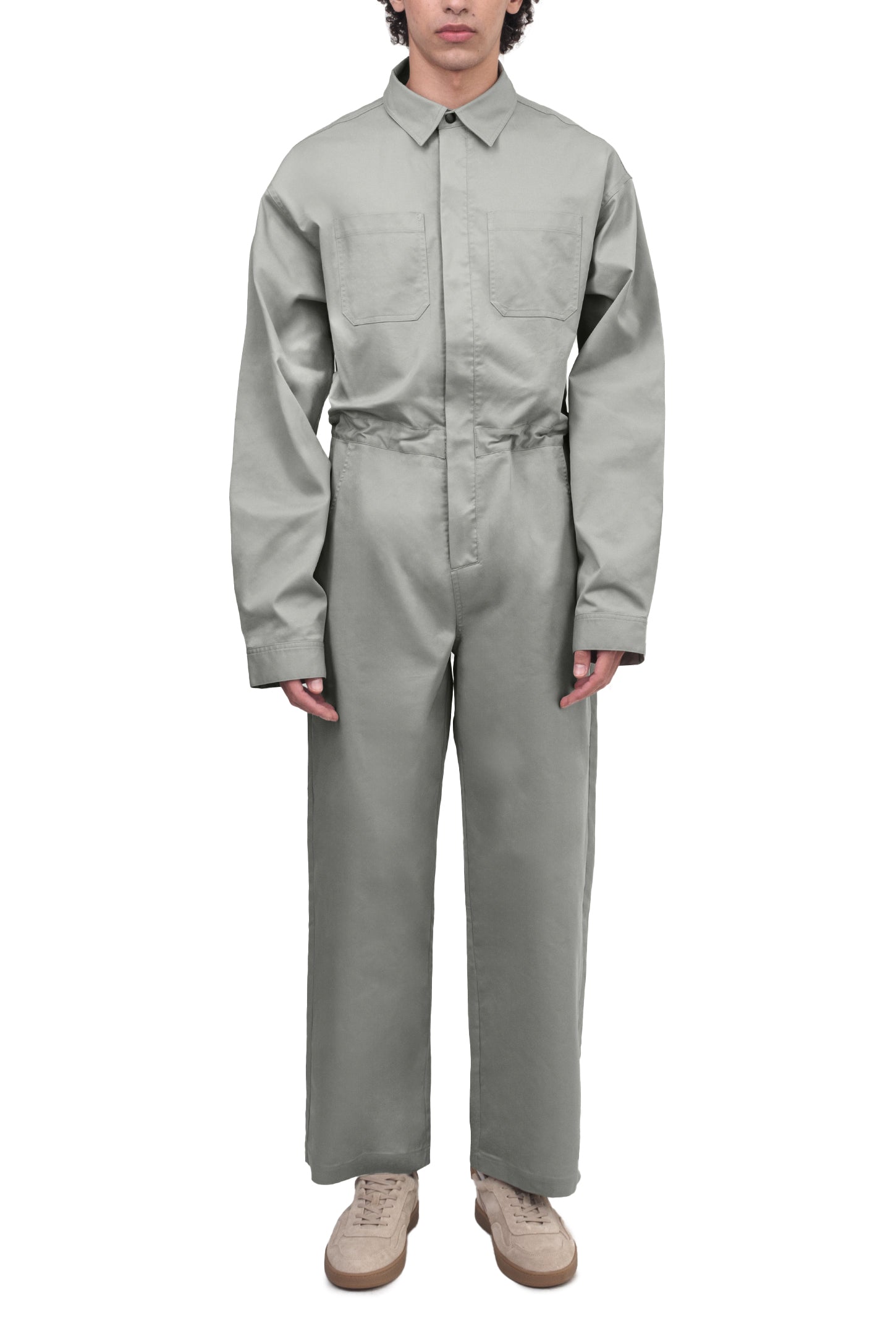 Relaxed fit, unisex long-sleeve overalls with a hidden button-down closure, a hidden adjustable drawstring waistband, side and back patch pockets, and a jacron label.