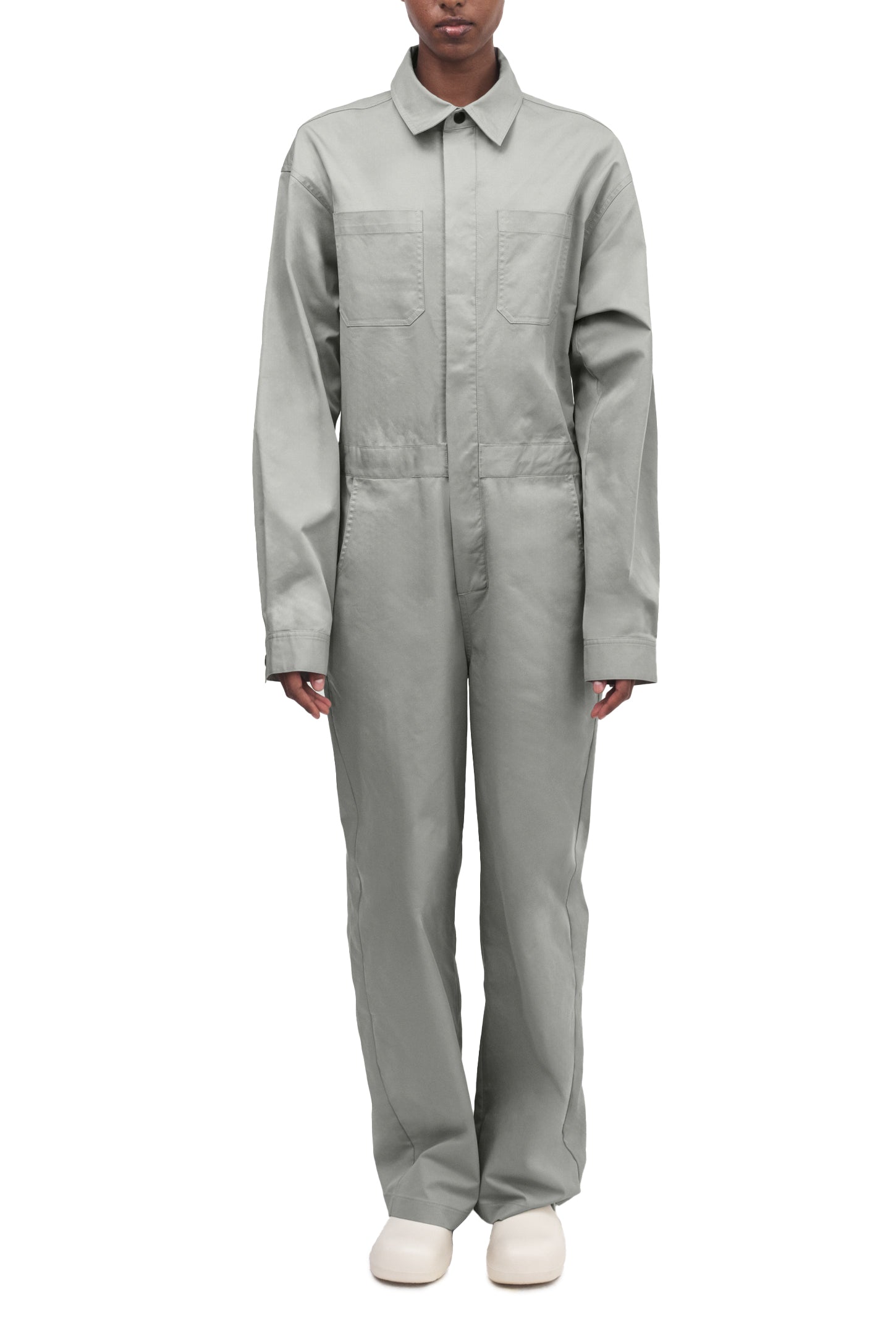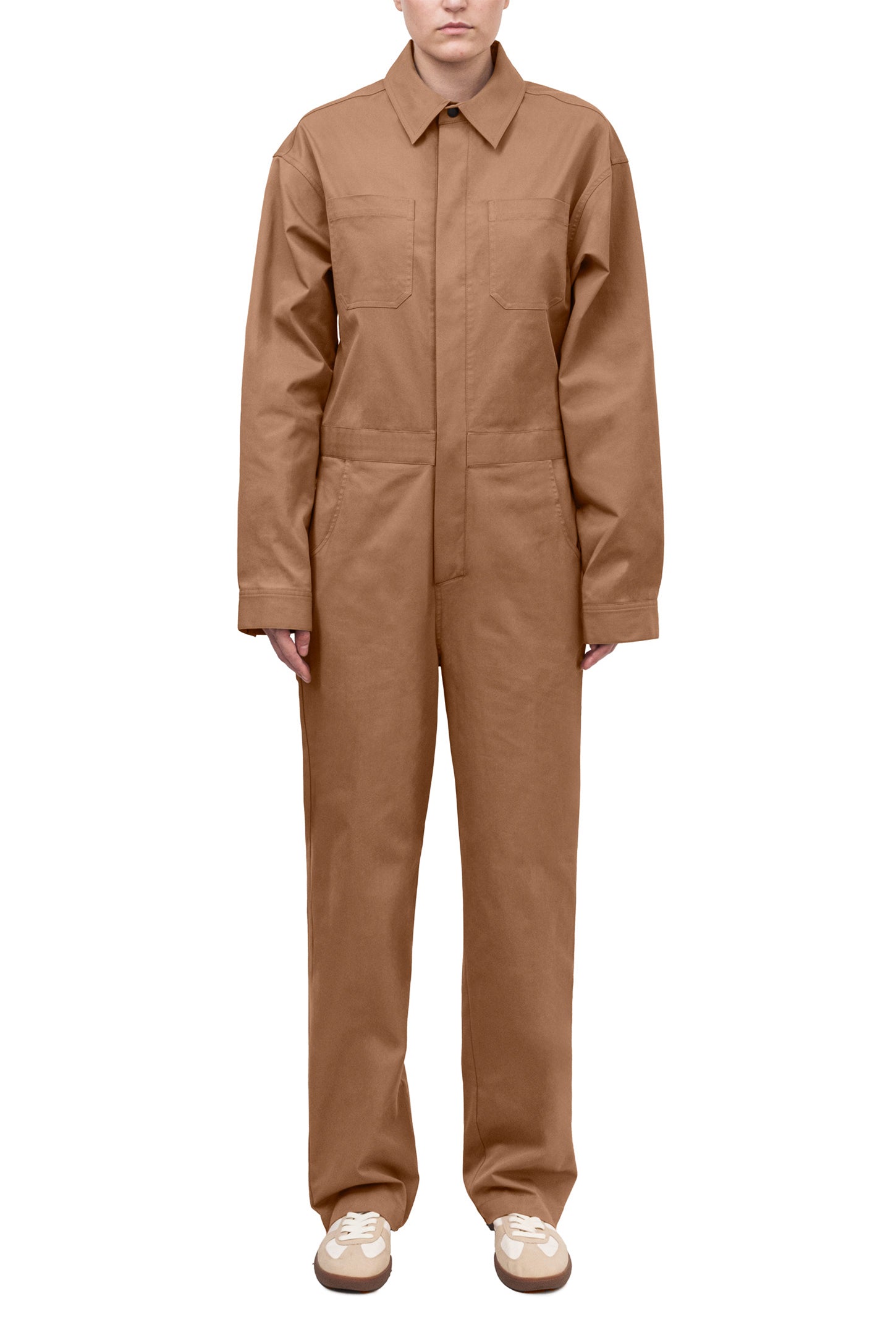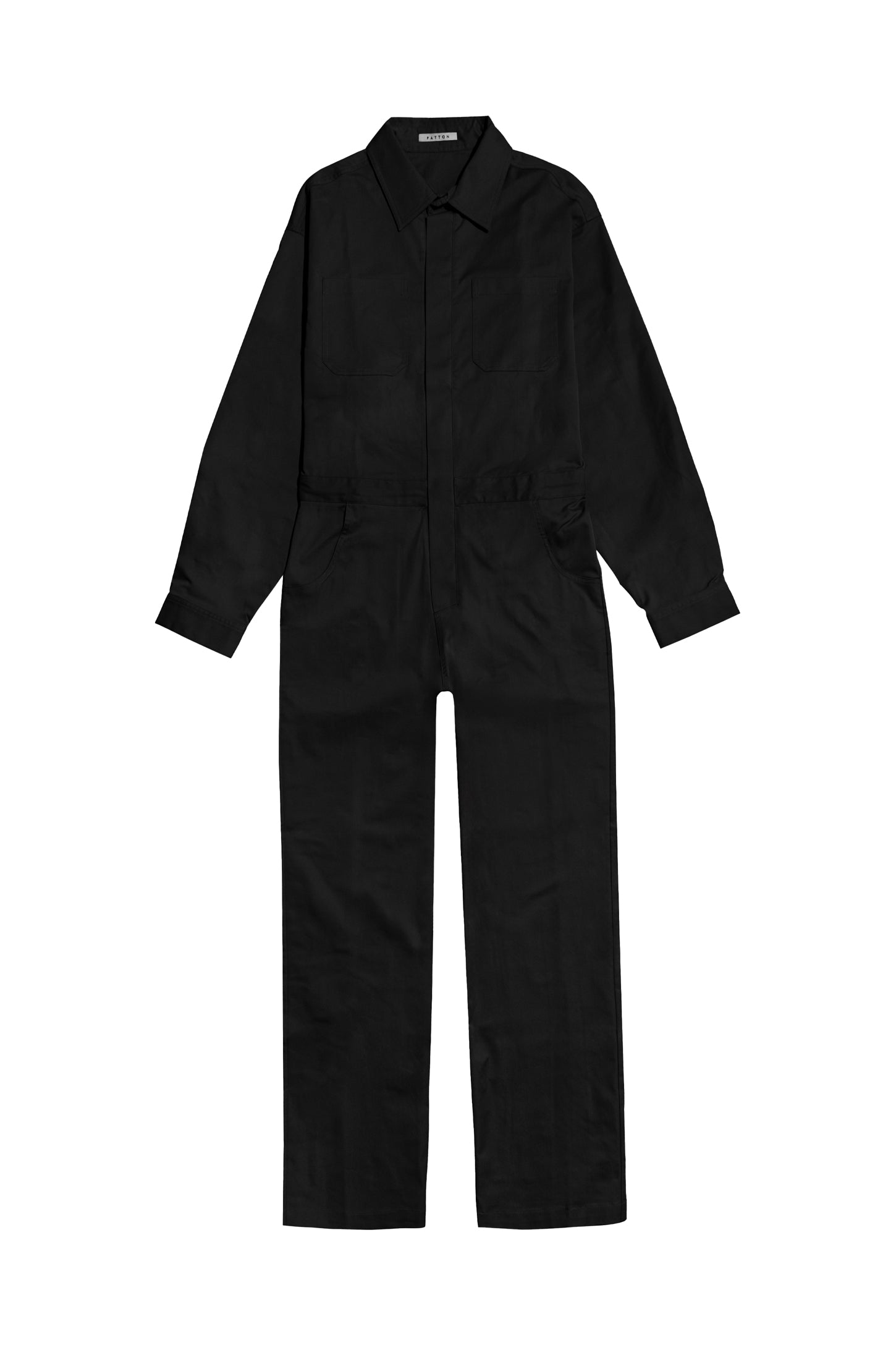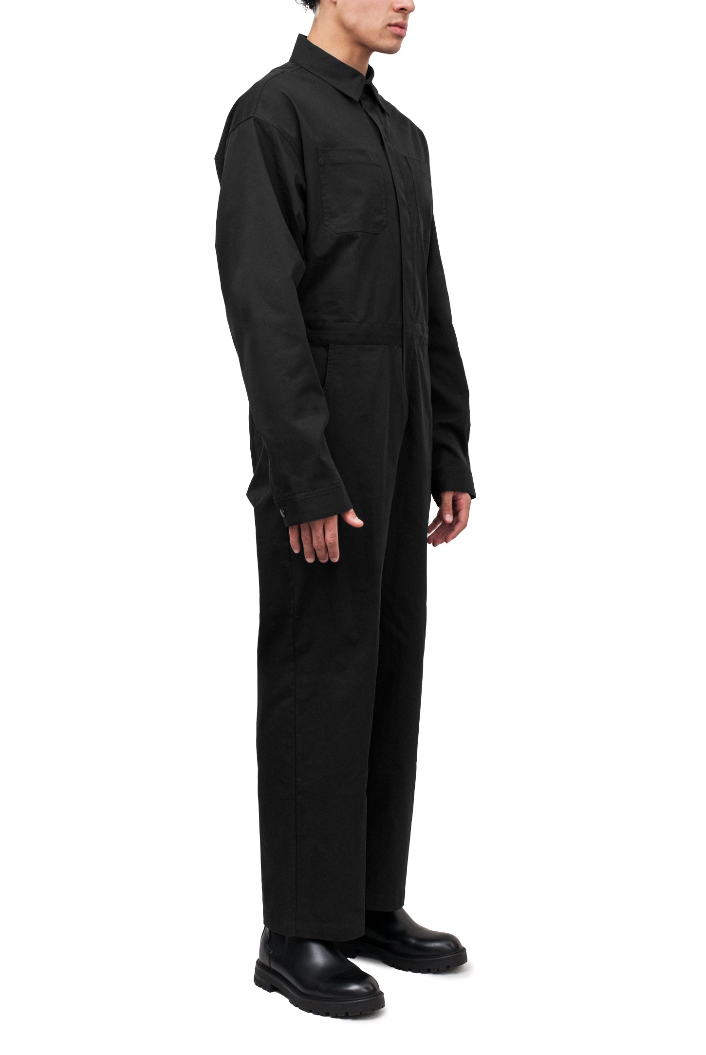 Relaxed fit, unisex long-sleeve overalls with a hidden button-down closure, a hidden adjustable drawstring waistband, side and back patch pockets, and a jacron label.