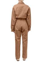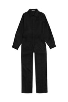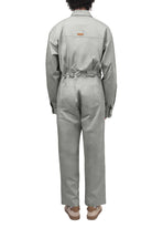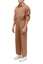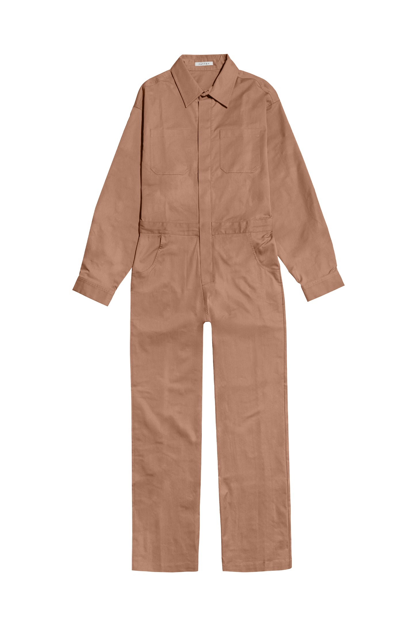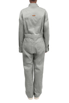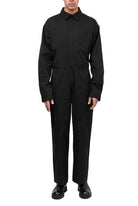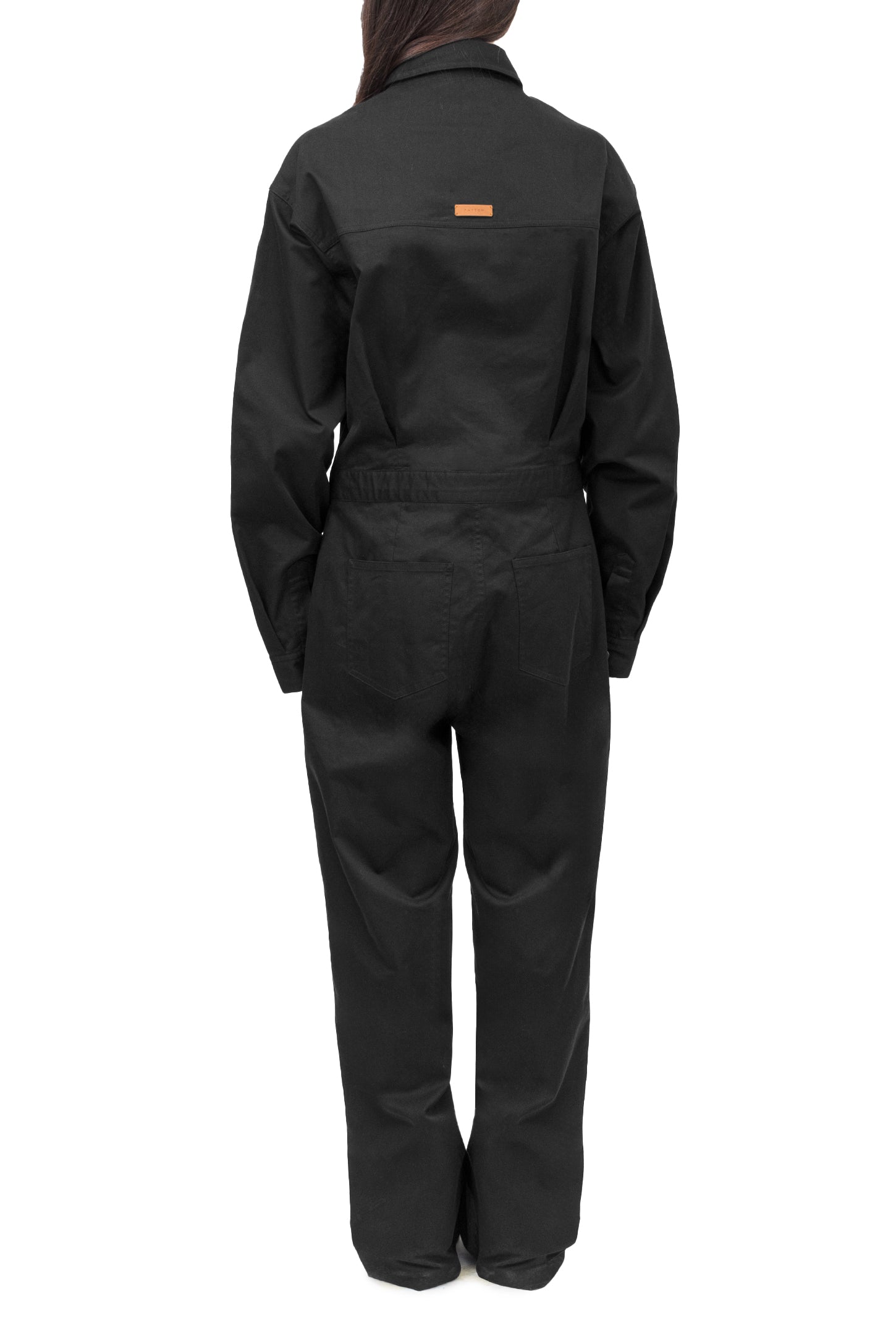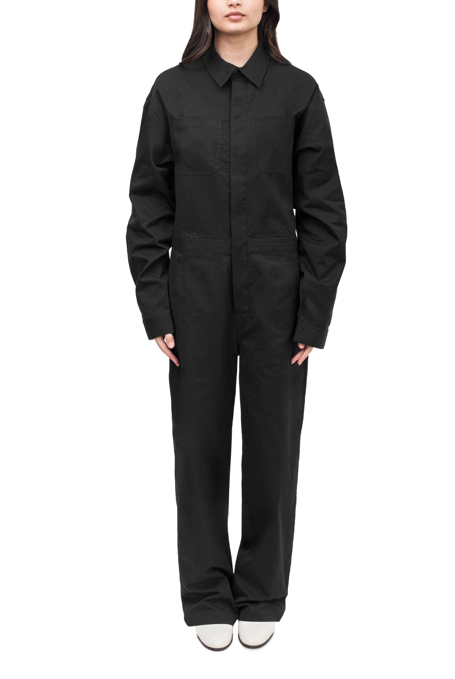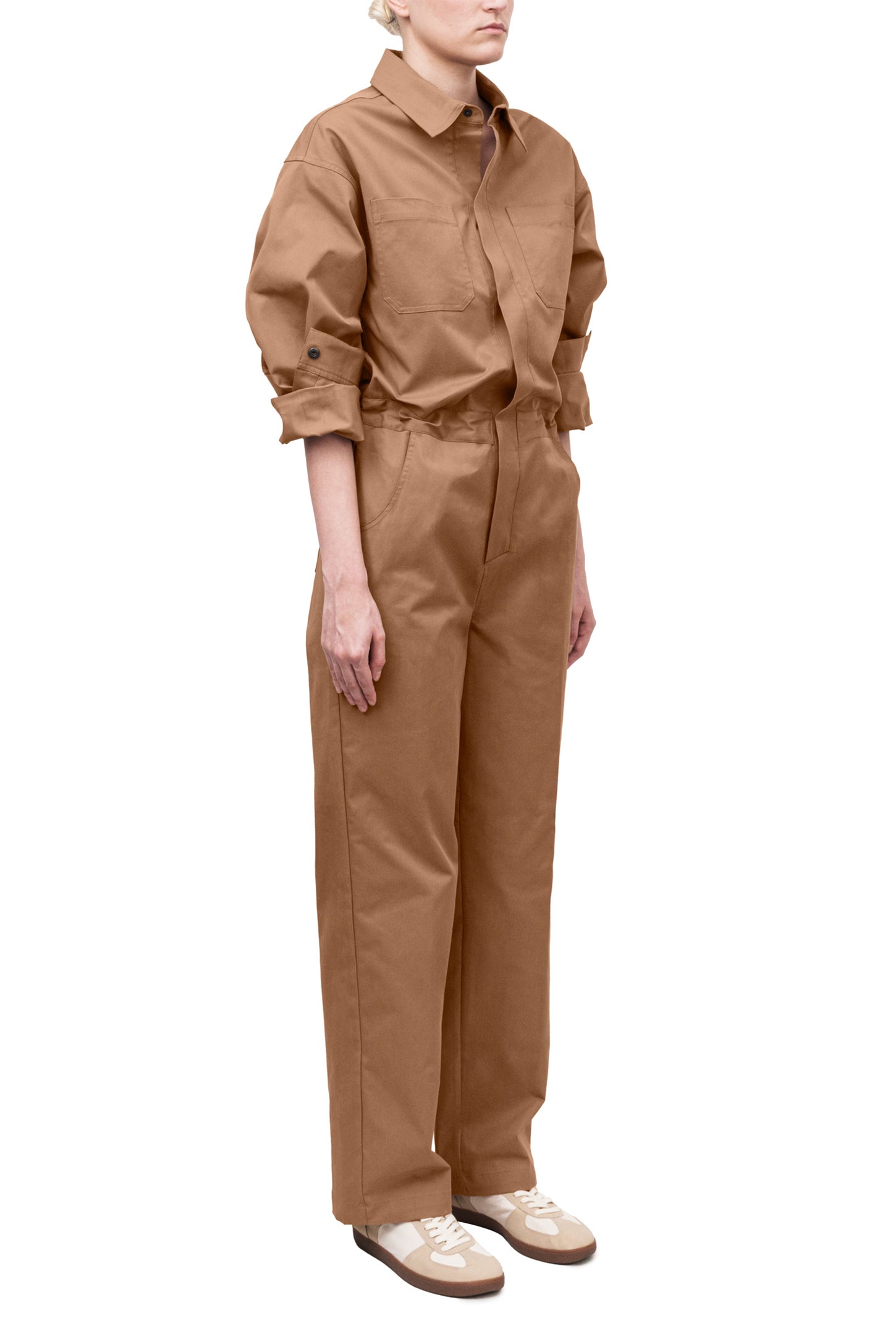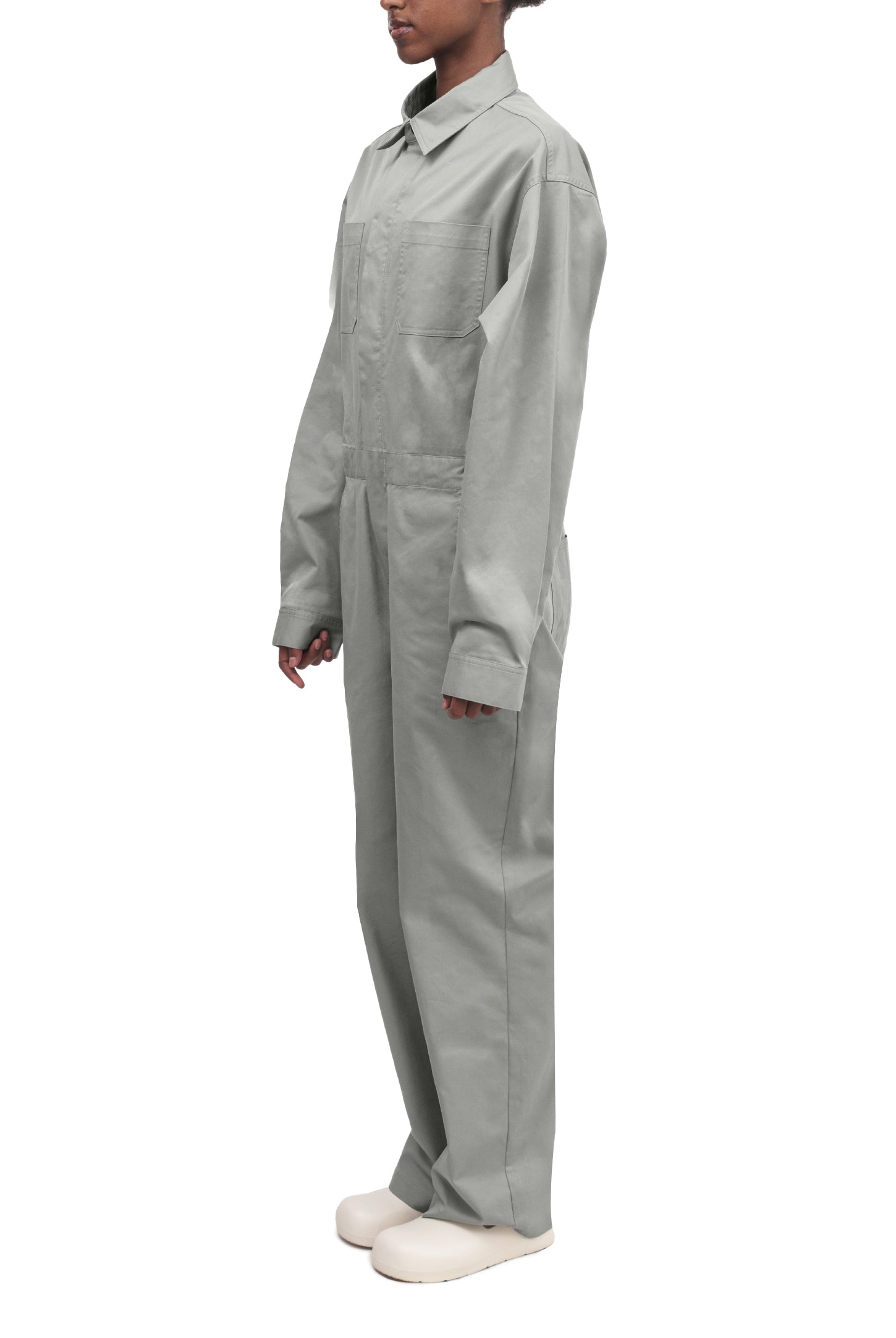 Relaxed fit, unisex long-sleeve overalls with a hidden button-down closure, a hidden adjustable drawstring waistband, side and back patch pockets, and a jacron label.