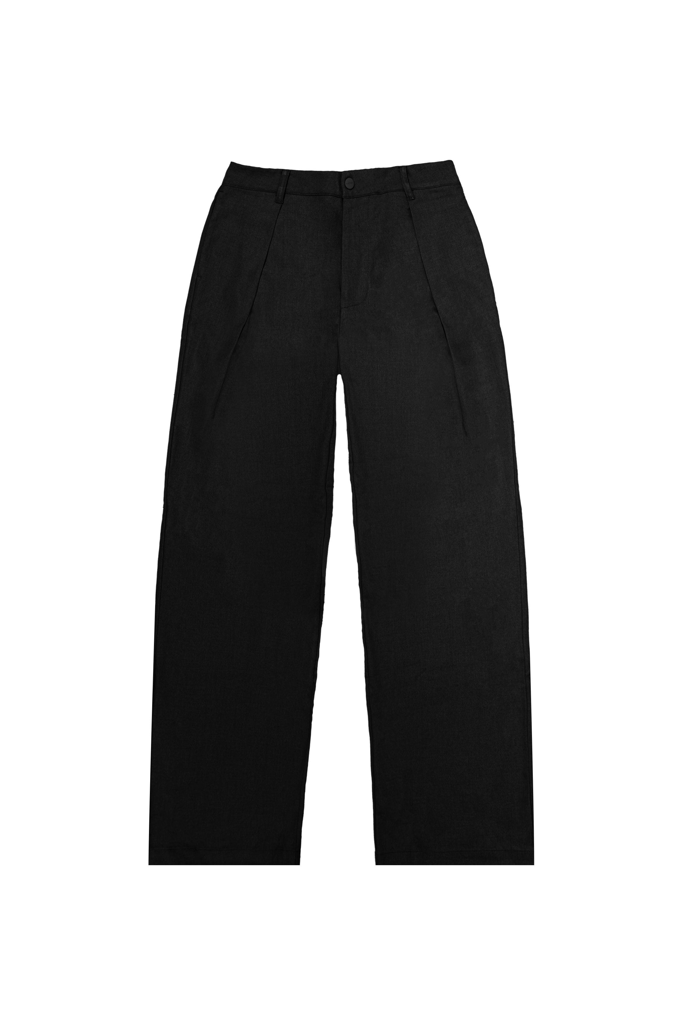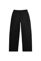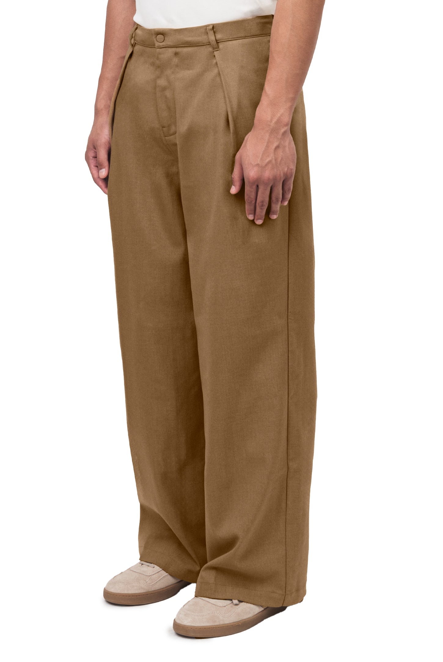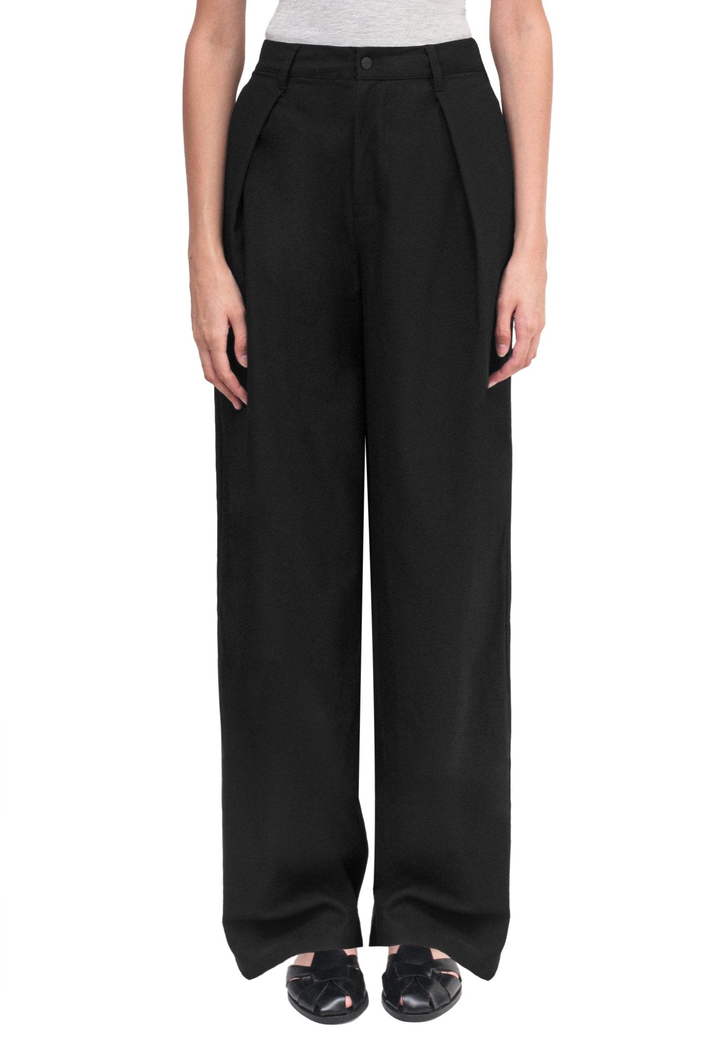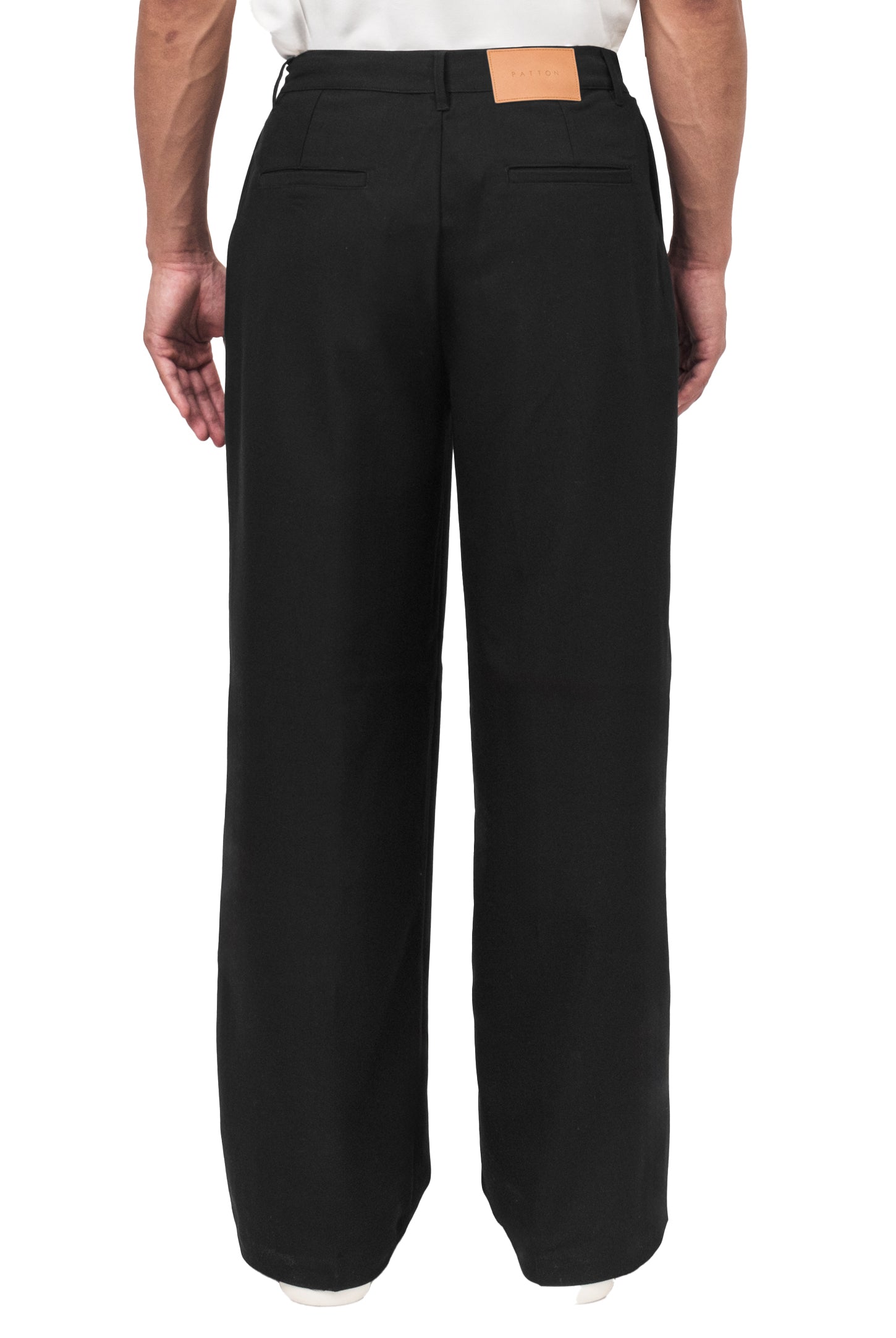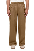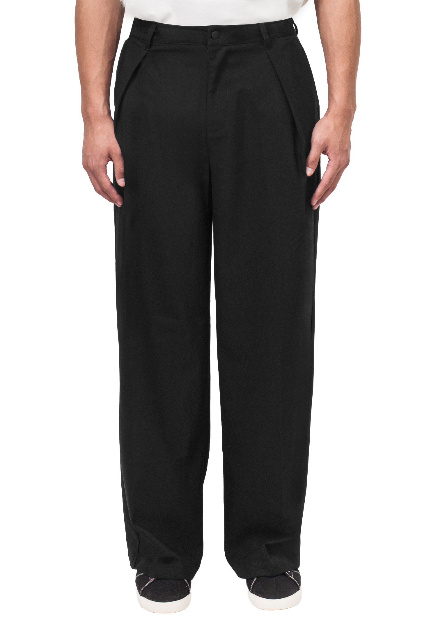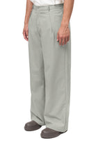 Relaxed-fit, mid-rise unisex trousers with a straight-leg fit and frontal pleats, featuring a snap button and zipper closure, side pockets and back welt pockets, belt loops, and a jacron label.