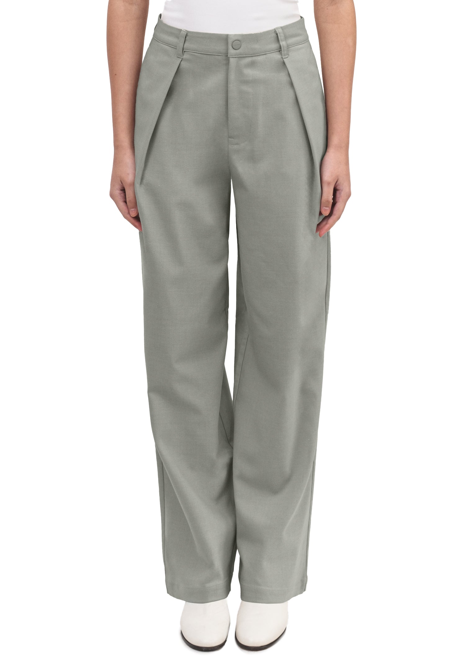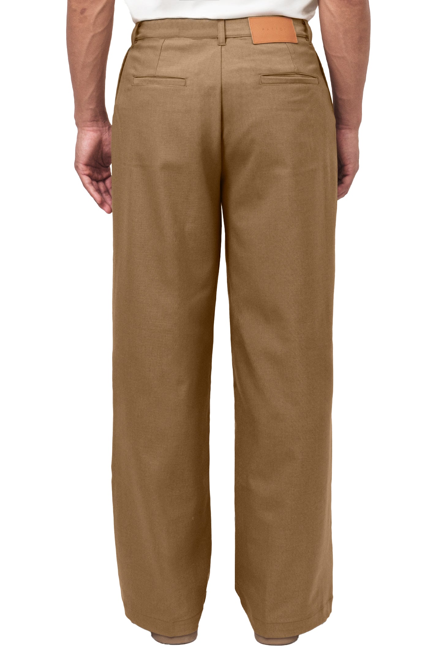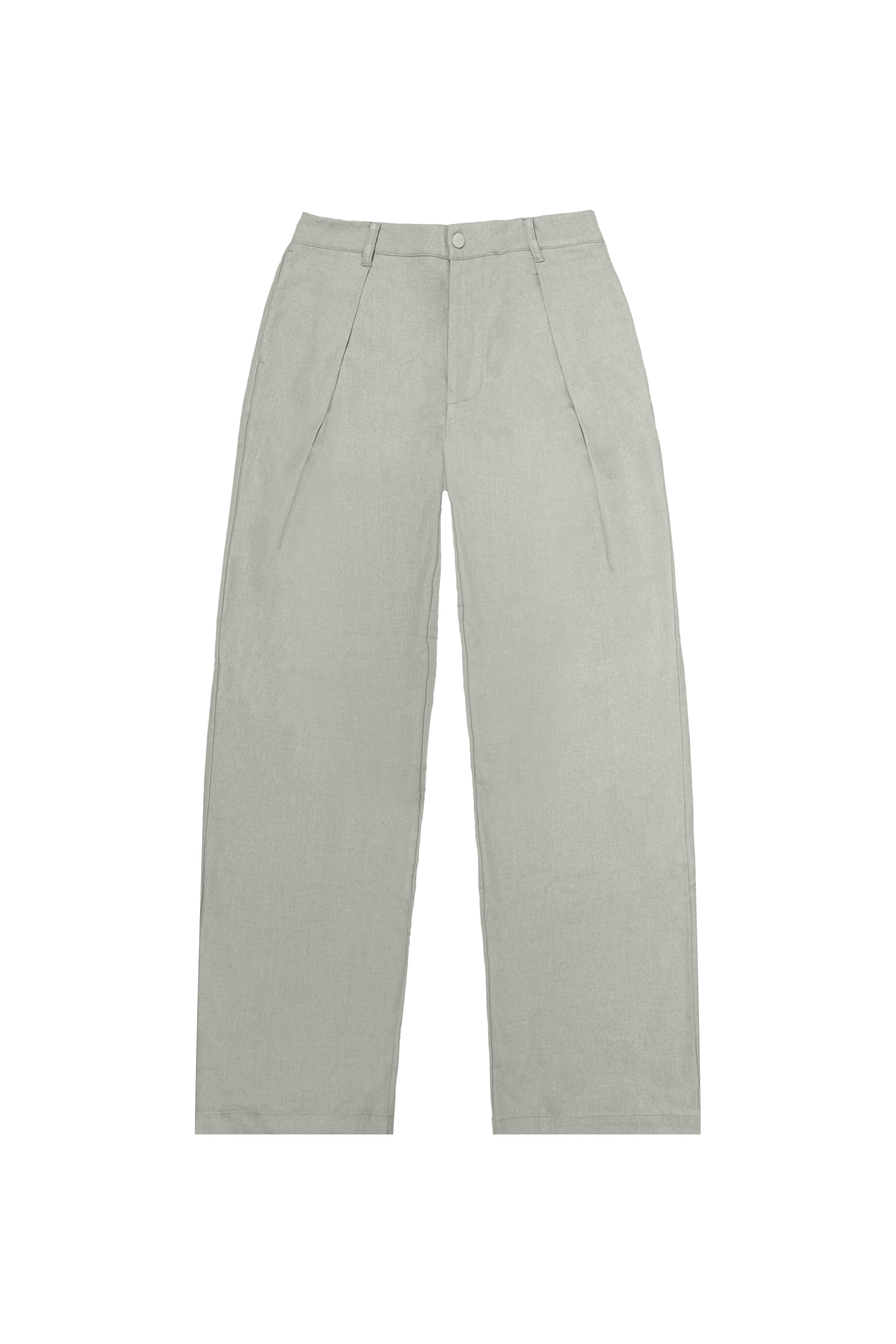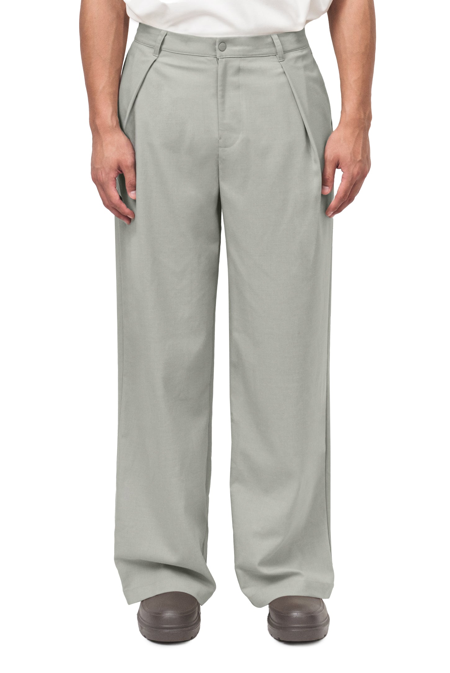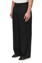 Relaxed-fit, mid-rise unisex trousers with a straight-leg fit and frontal pleats, featuring a snap button and zipper closure, side pockets and back welt pockets, belt loops, and a jacron label.