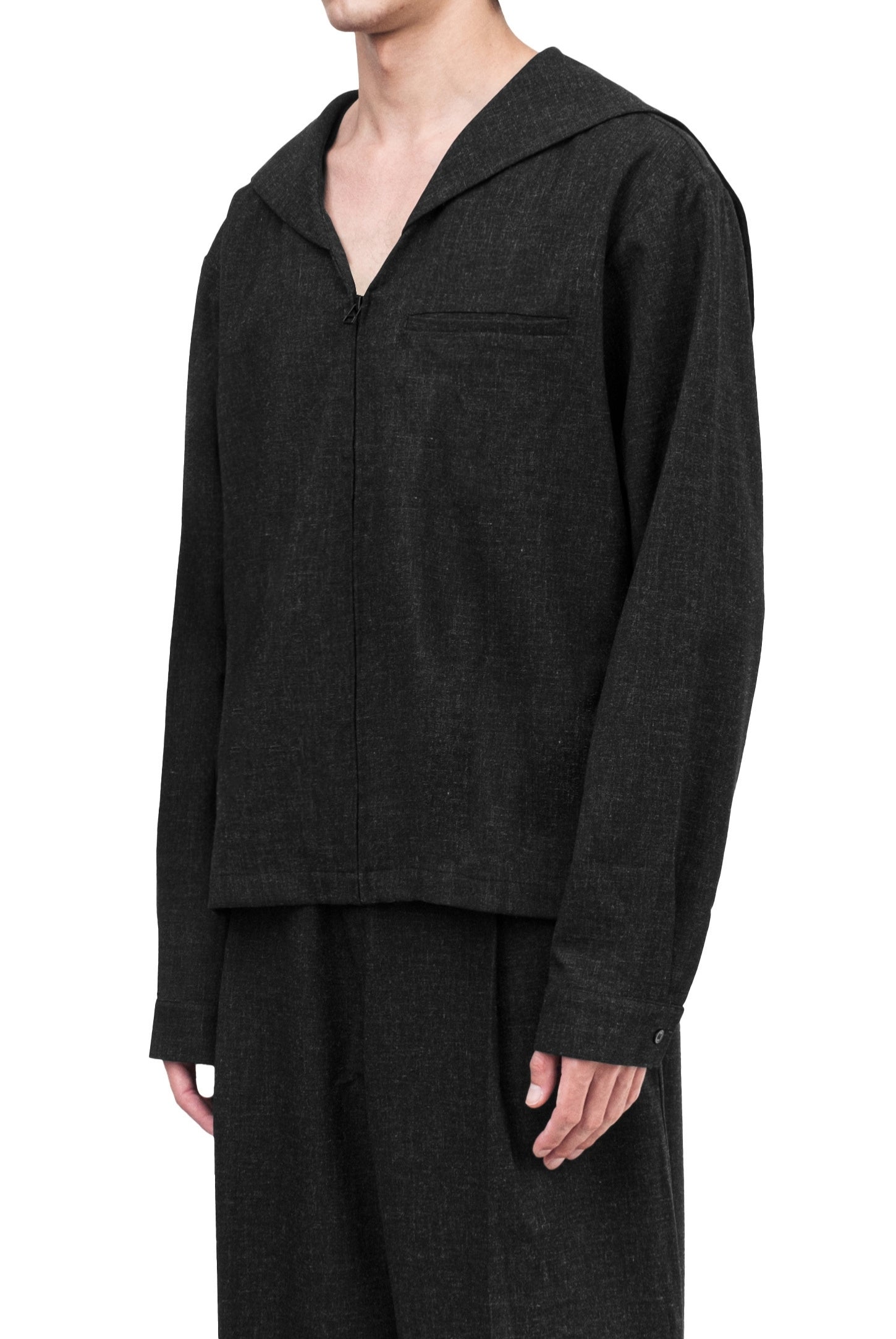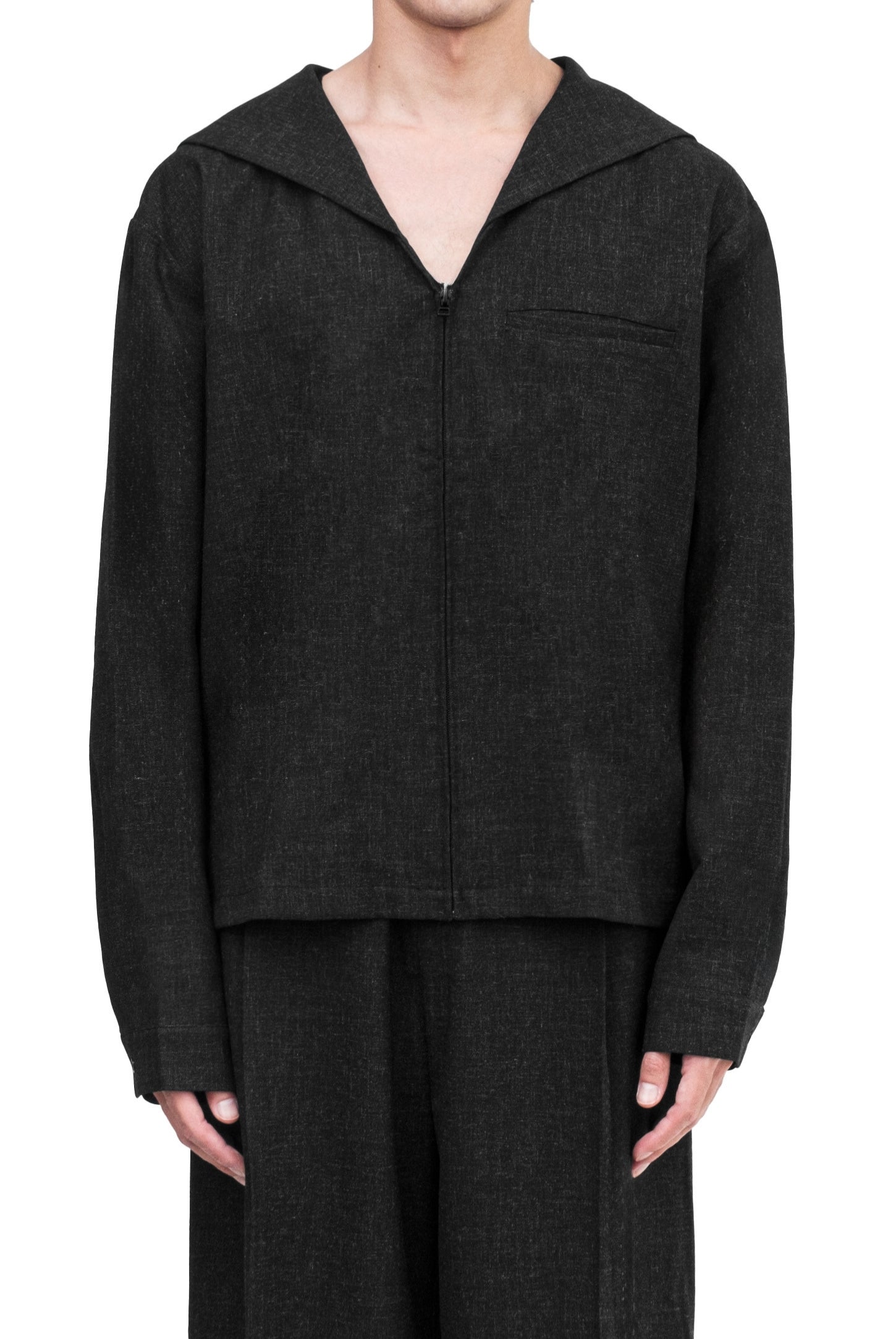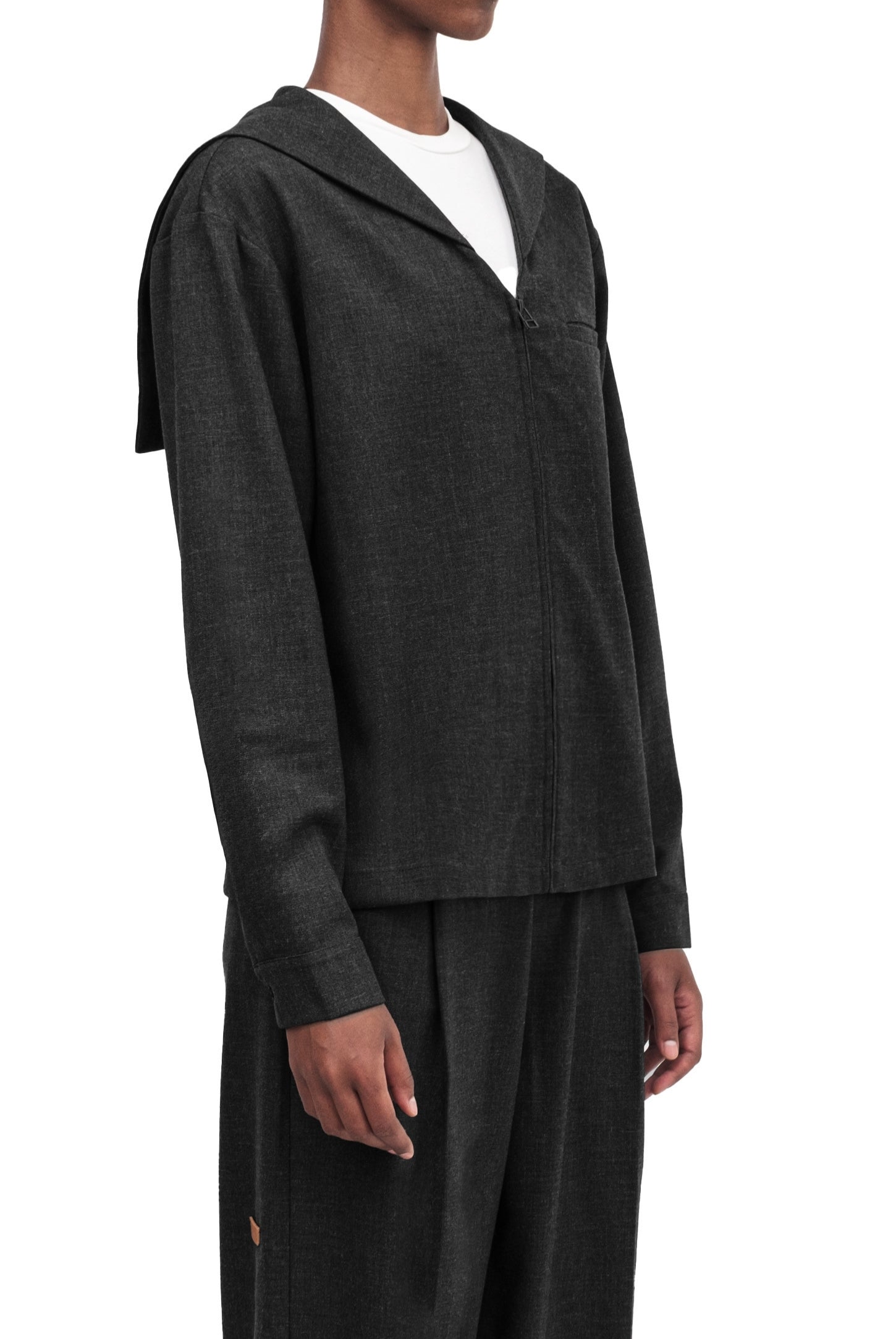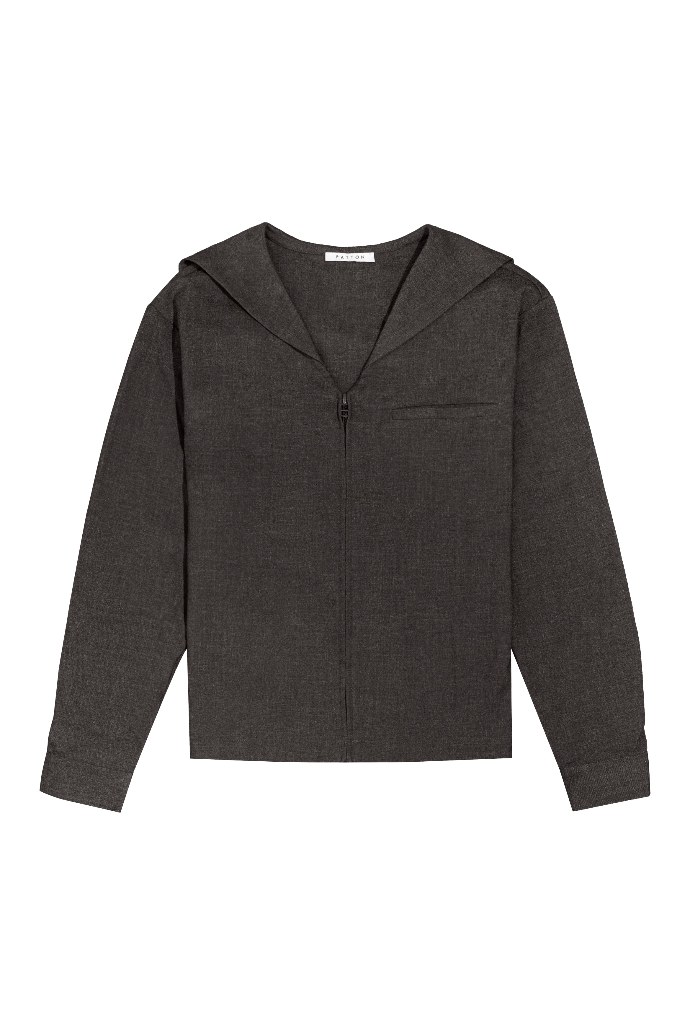 A unisex zip-up jacket with a sailor collar, buttoned cuffs, a chest welt pocket, and a jacron label.