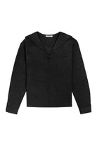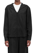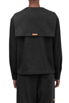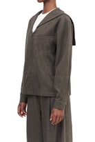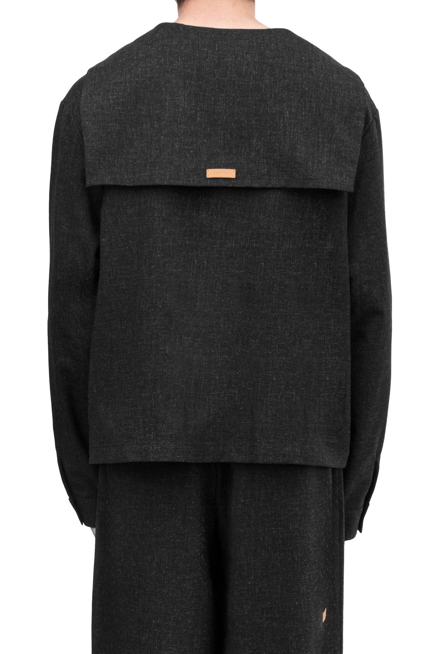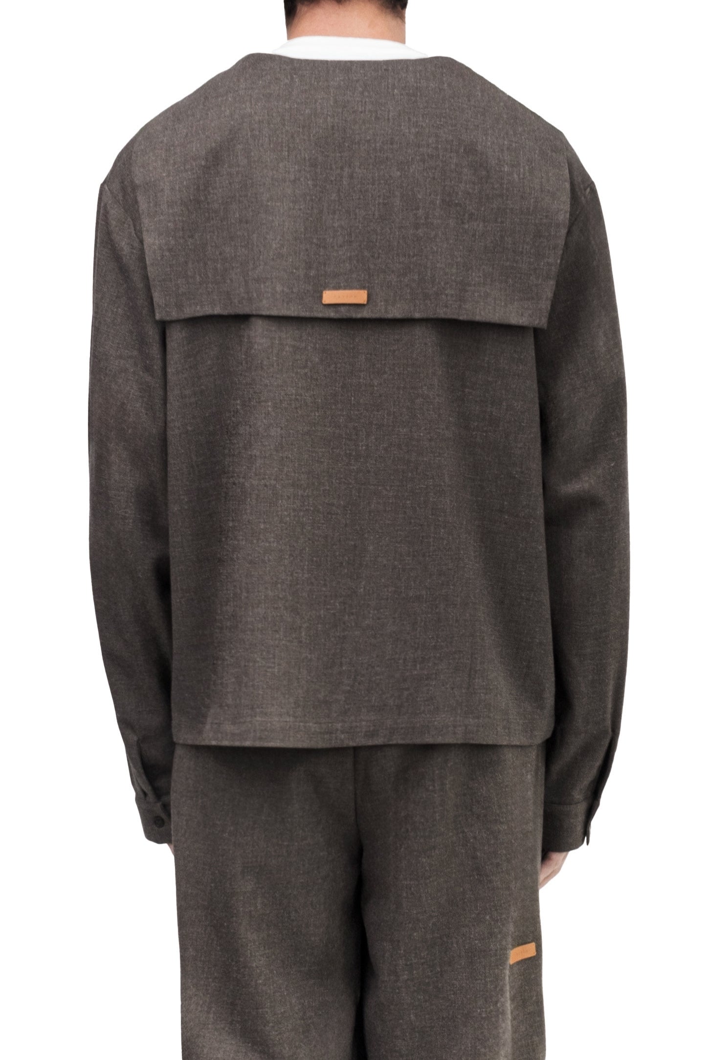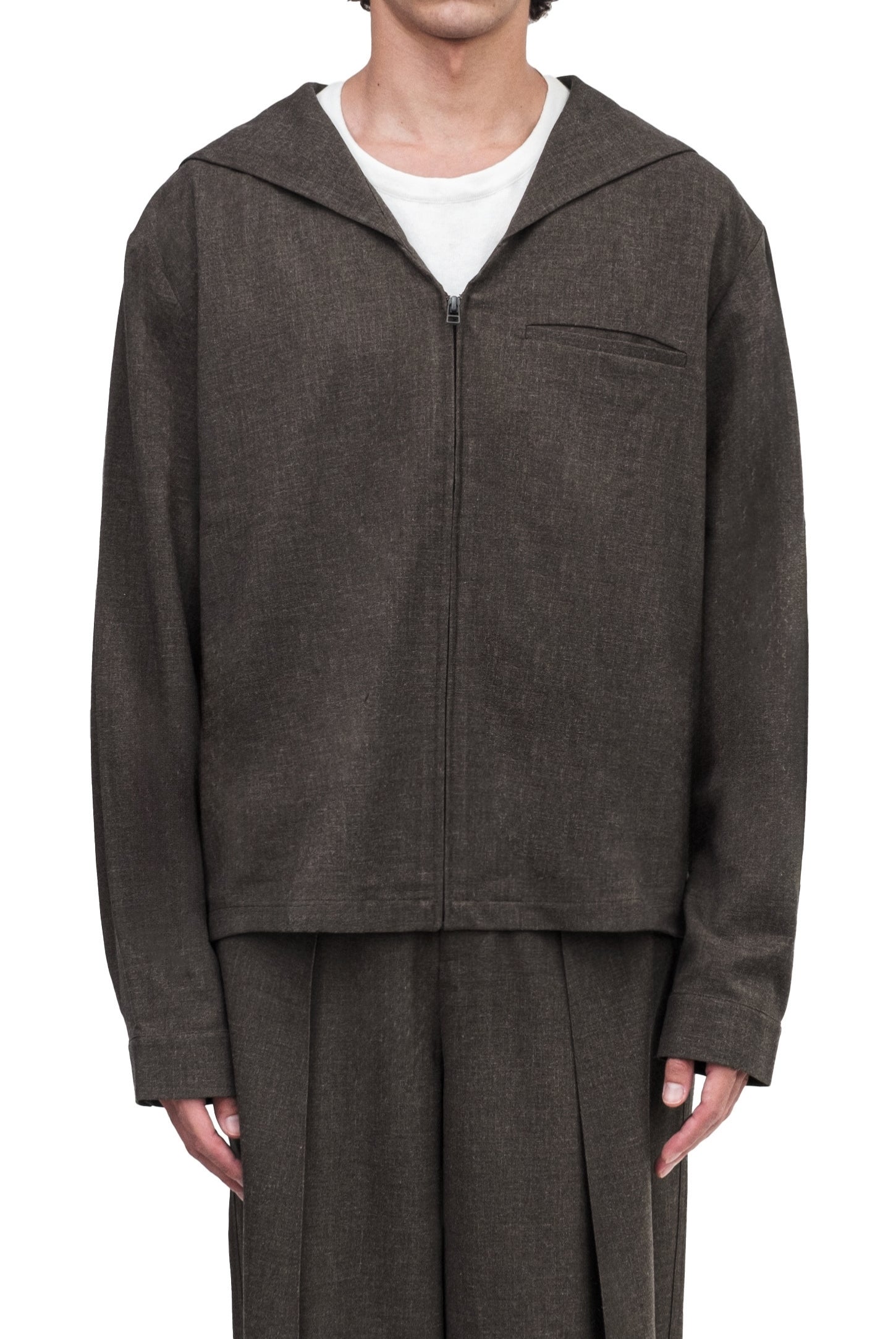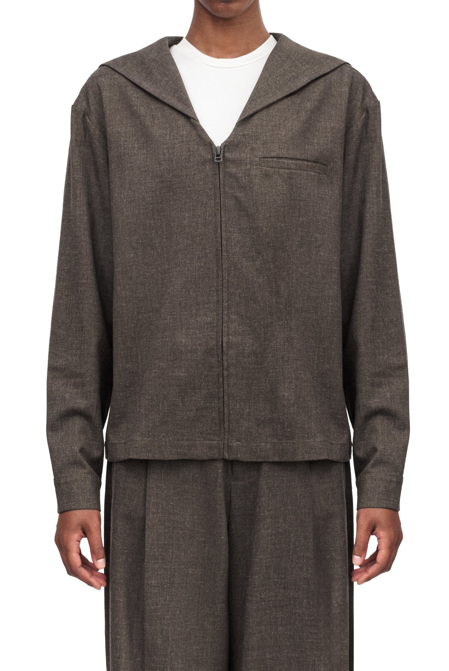 A unisex zip-up jacket with a sailor collar, buttoned cuffs, a chest welt pocket, and a jacron label.