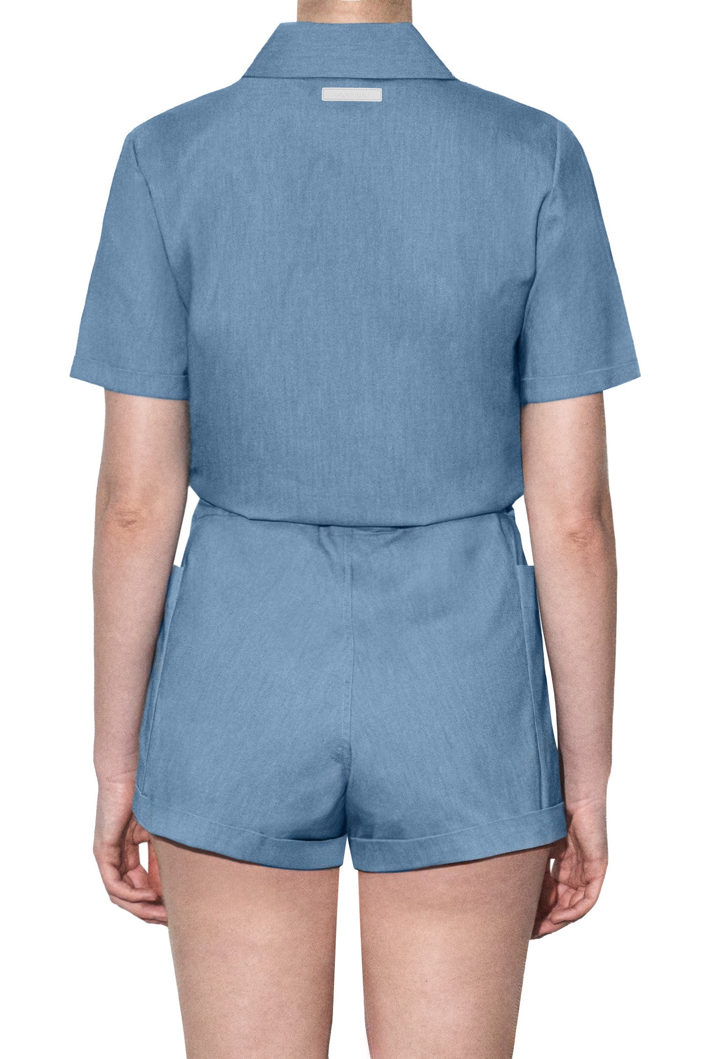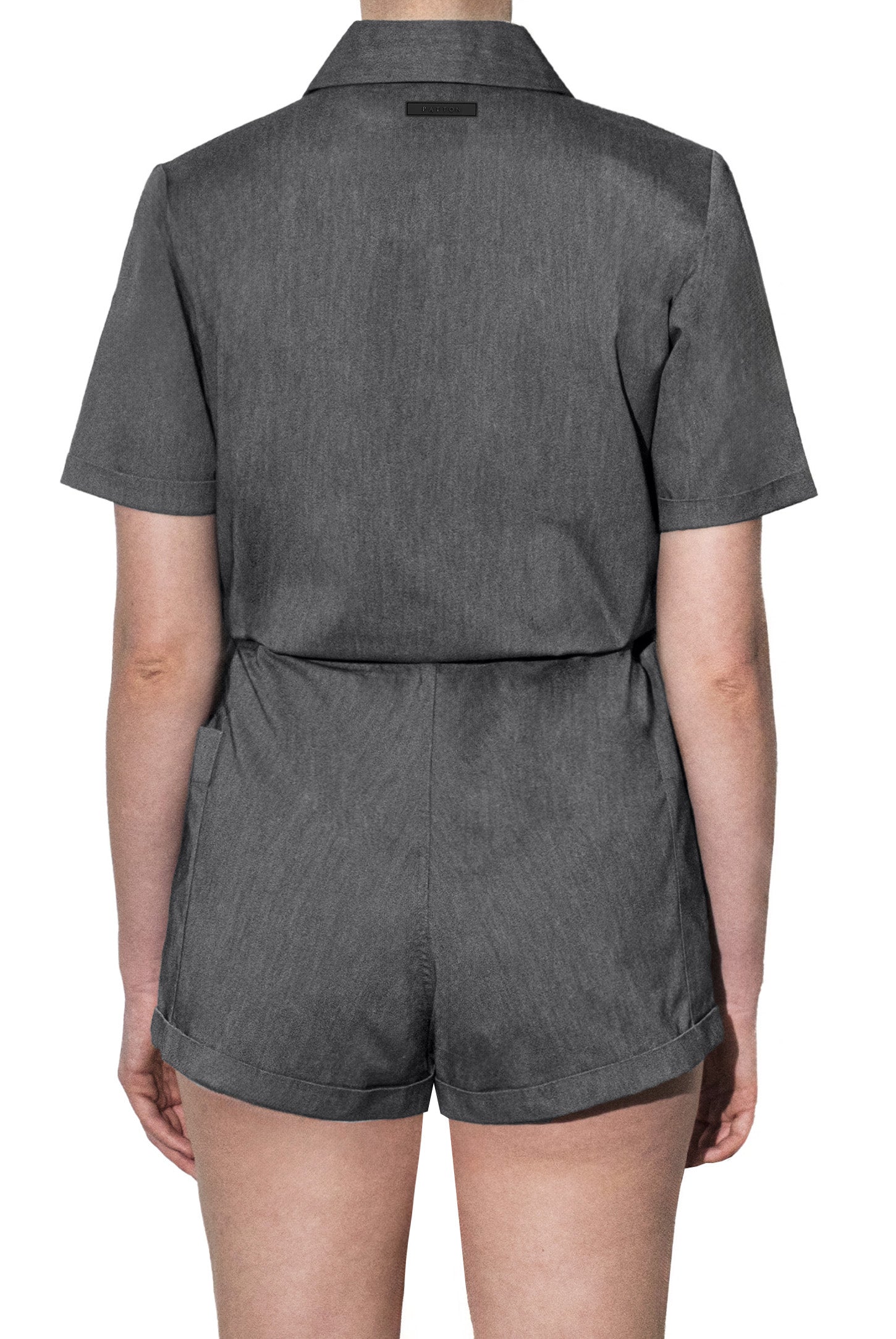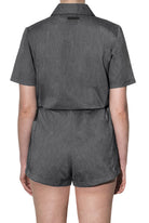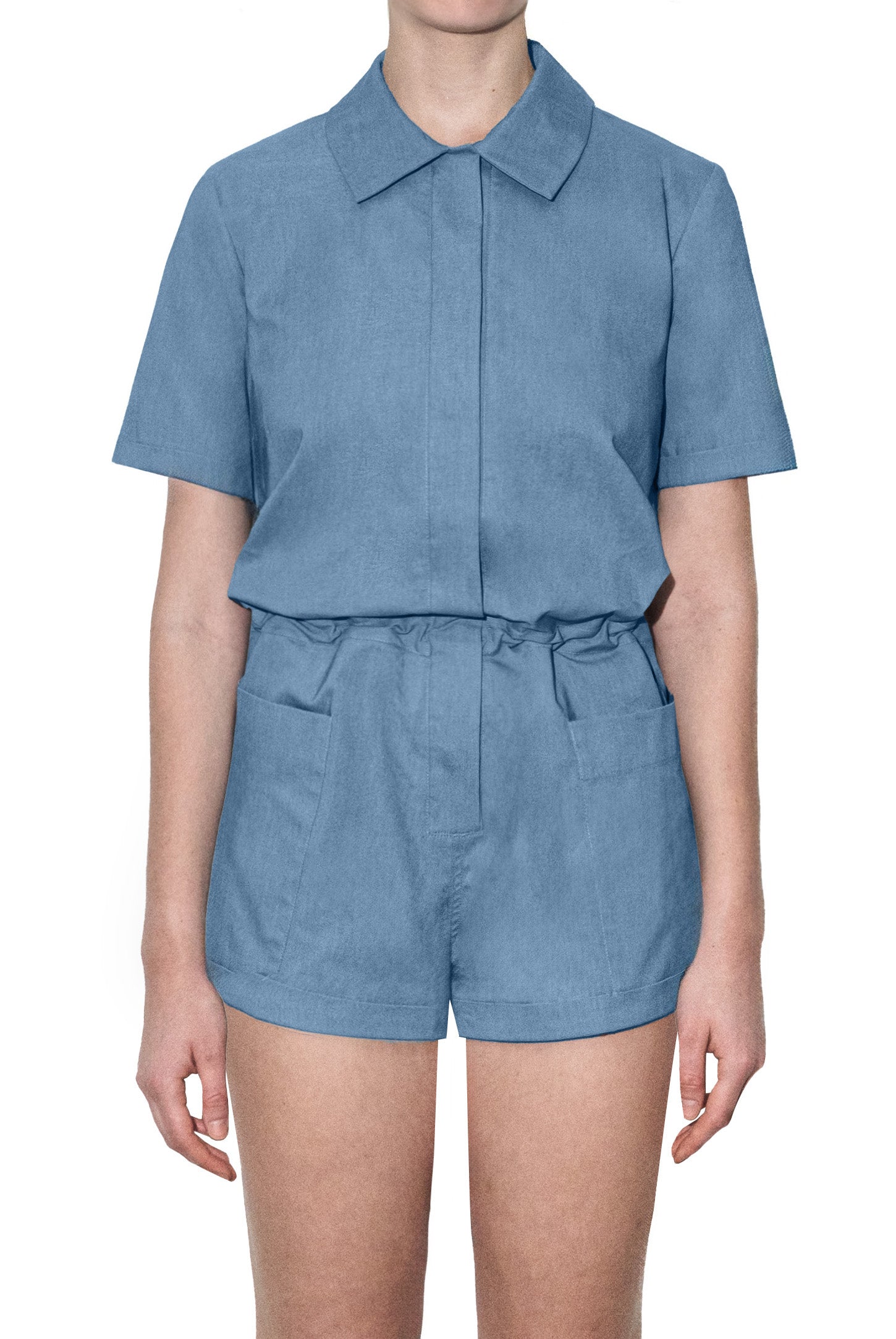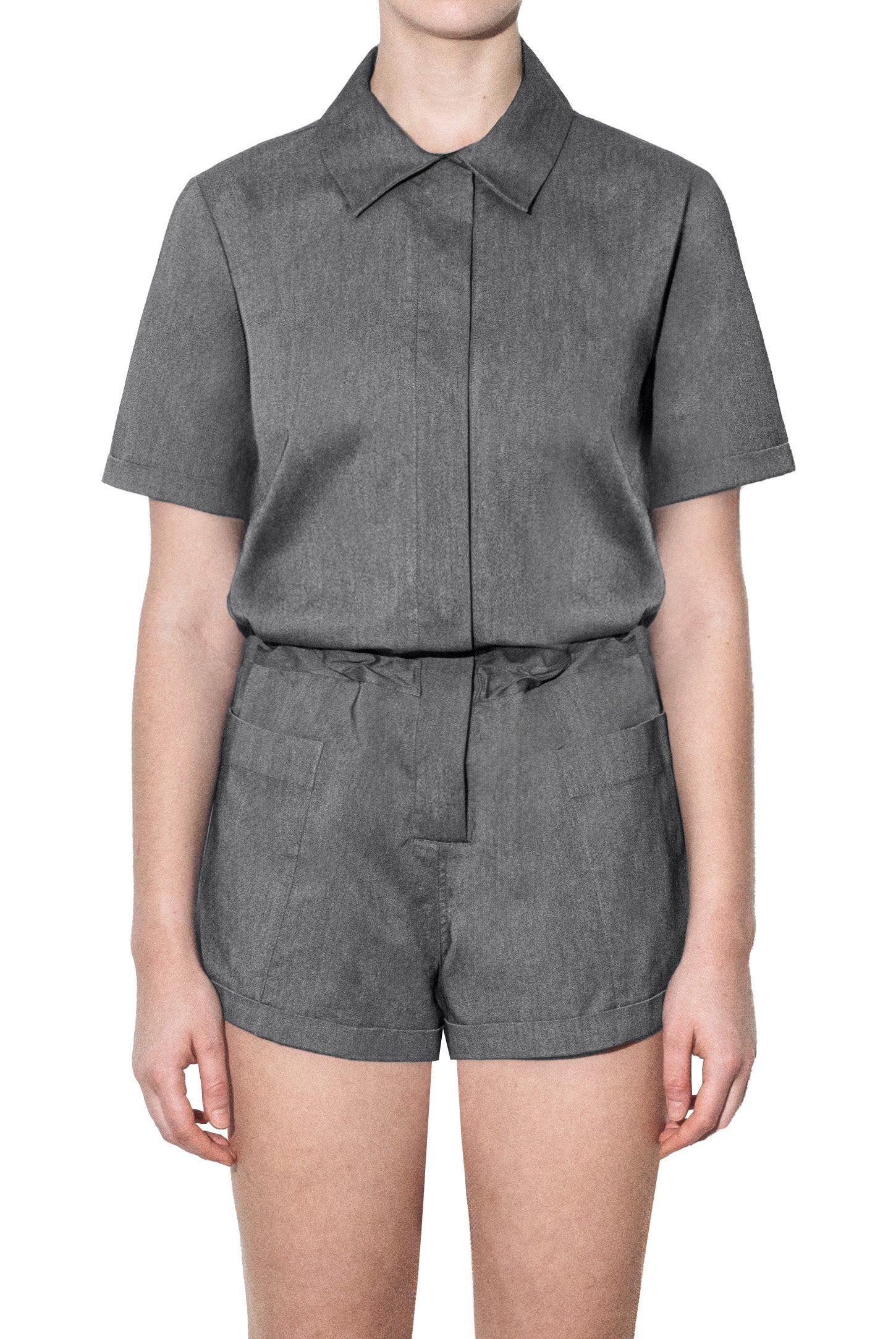 A button-down shirt playsuit with turn-up sleeves and shorts, side patch pockets, hidden adjustable drawstring waistband, and a rubber logo.