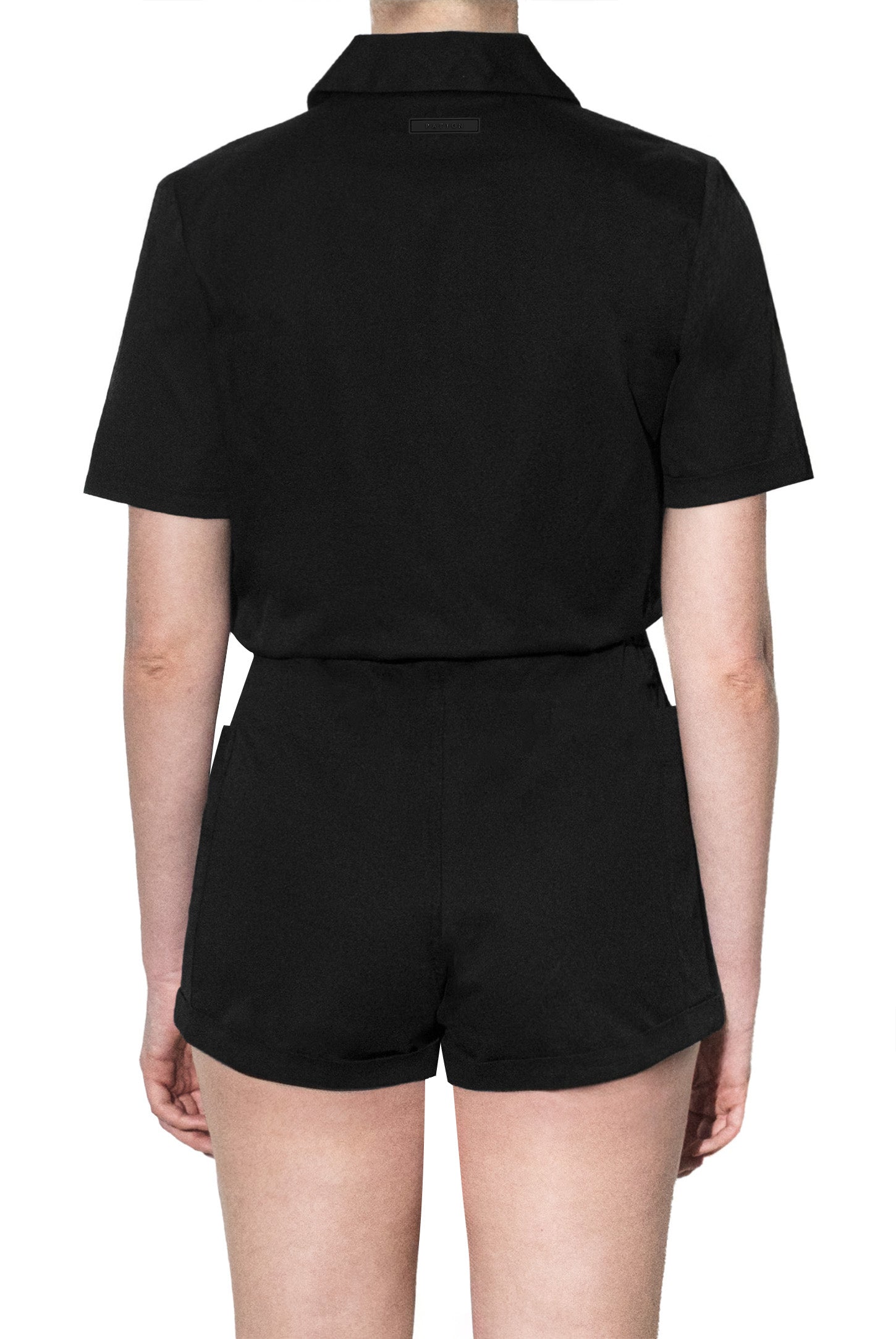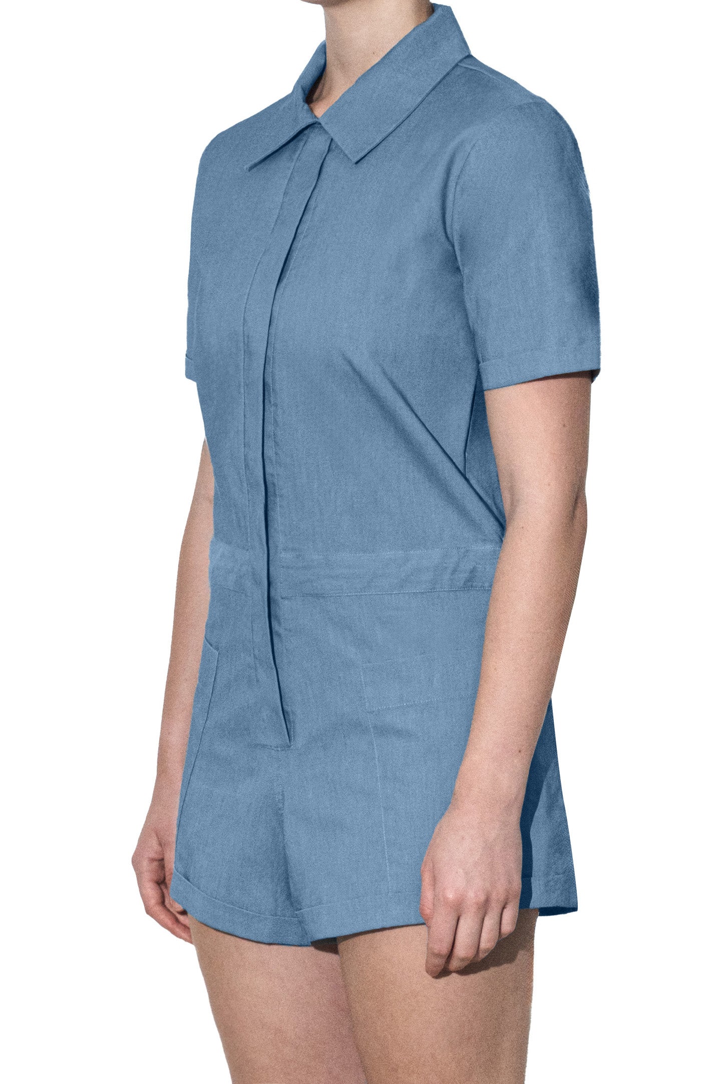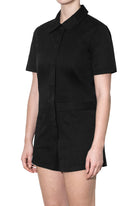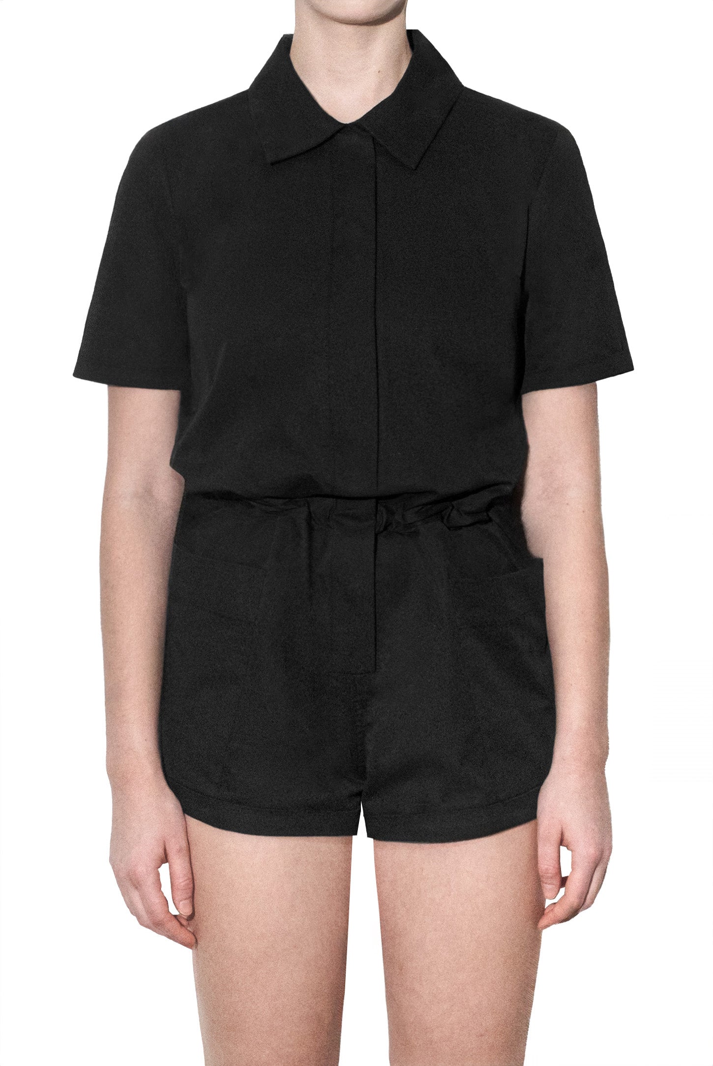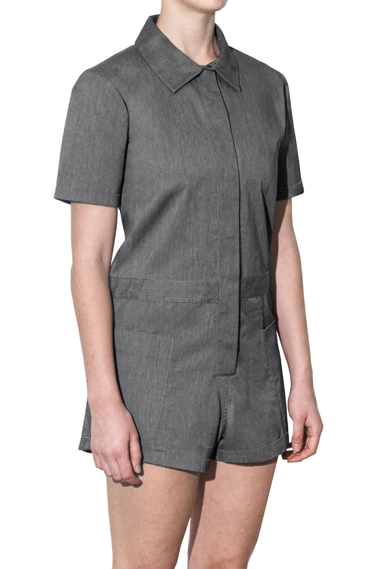 A button-down shirt playsuit with turn-up sleeves and shorts, side patch pockets, hidden adjustable drawstring waistband, and a rubber logo.