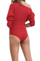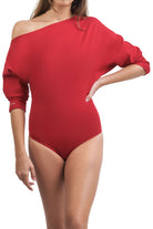 A long-sleeve bodysuit with an asymmetric neckline, embroidered logo in one sleeve and snap buttons.