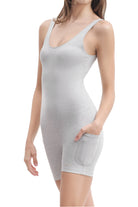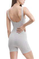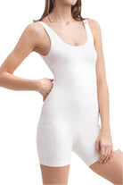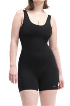 A biker-short length unitard with a classic scoop neckline, low back, side pockets, and embroidered logo.
