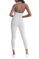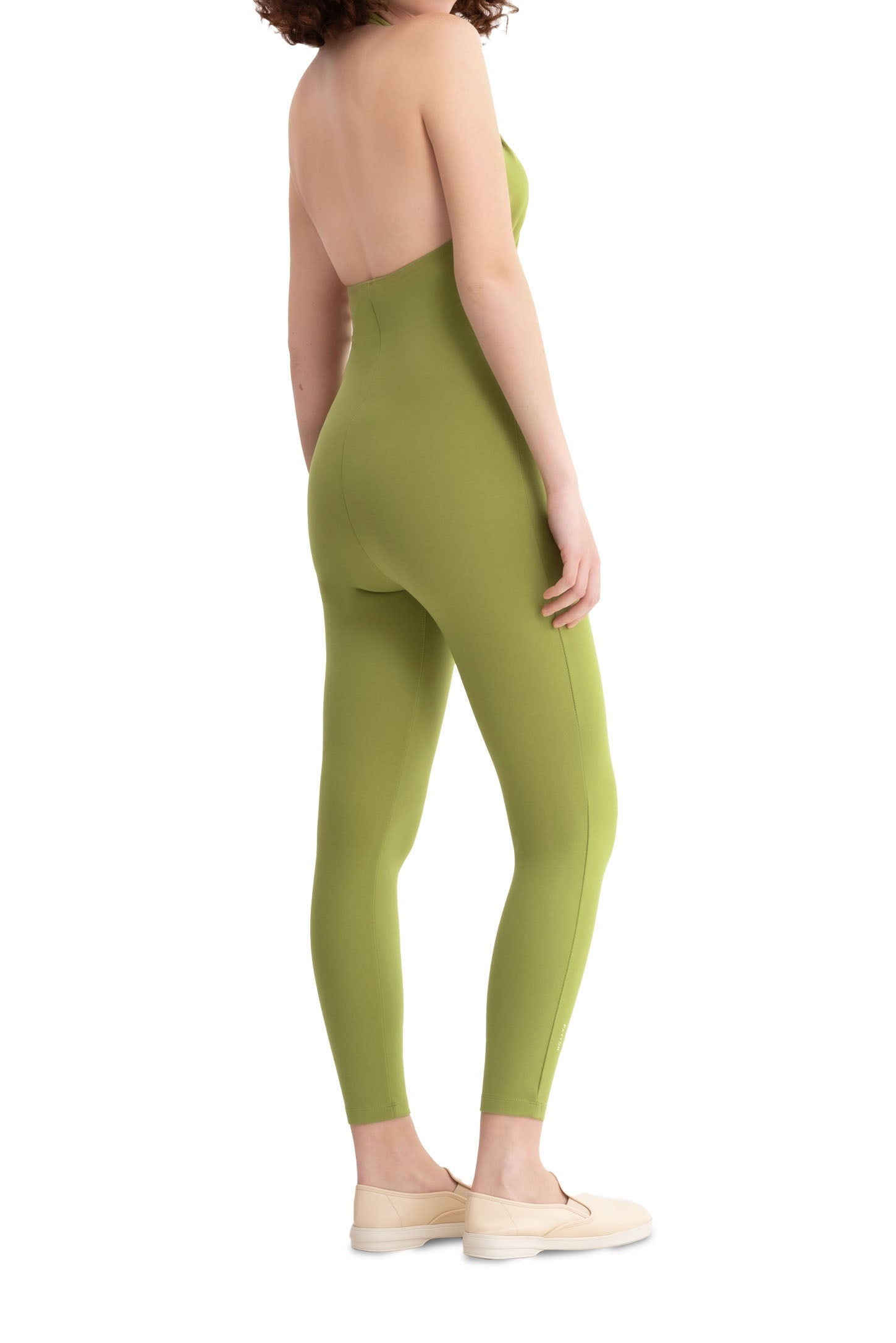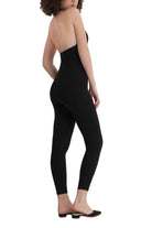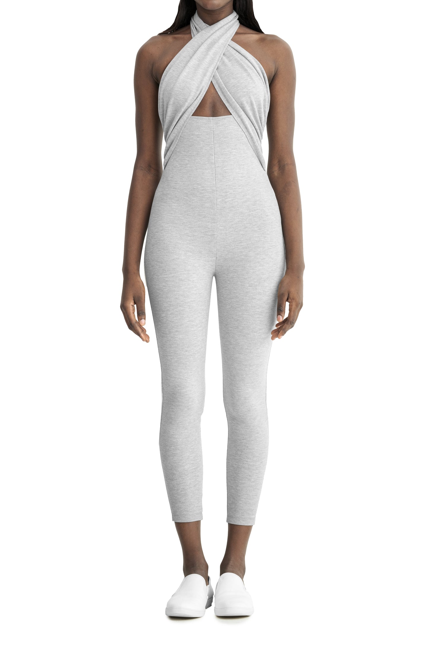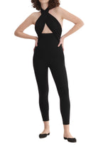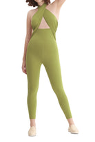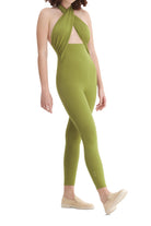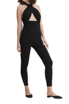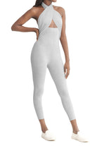 A full length unitard featuring a crisscross halter neckline with cut out and an embroidered logo.