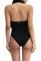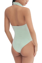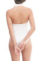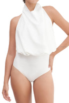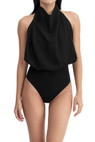 A halter-neck, sleeveless bodysuit featuring a draped, backless design with a fitted inner layer, snap buttons and an embroidered logo.