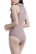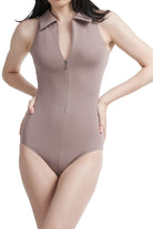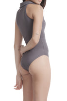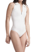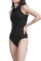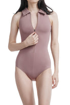 A bodysuit with a halter neckline and classic collar, front zip fastening, snap closures, and embroidered logo.