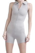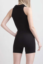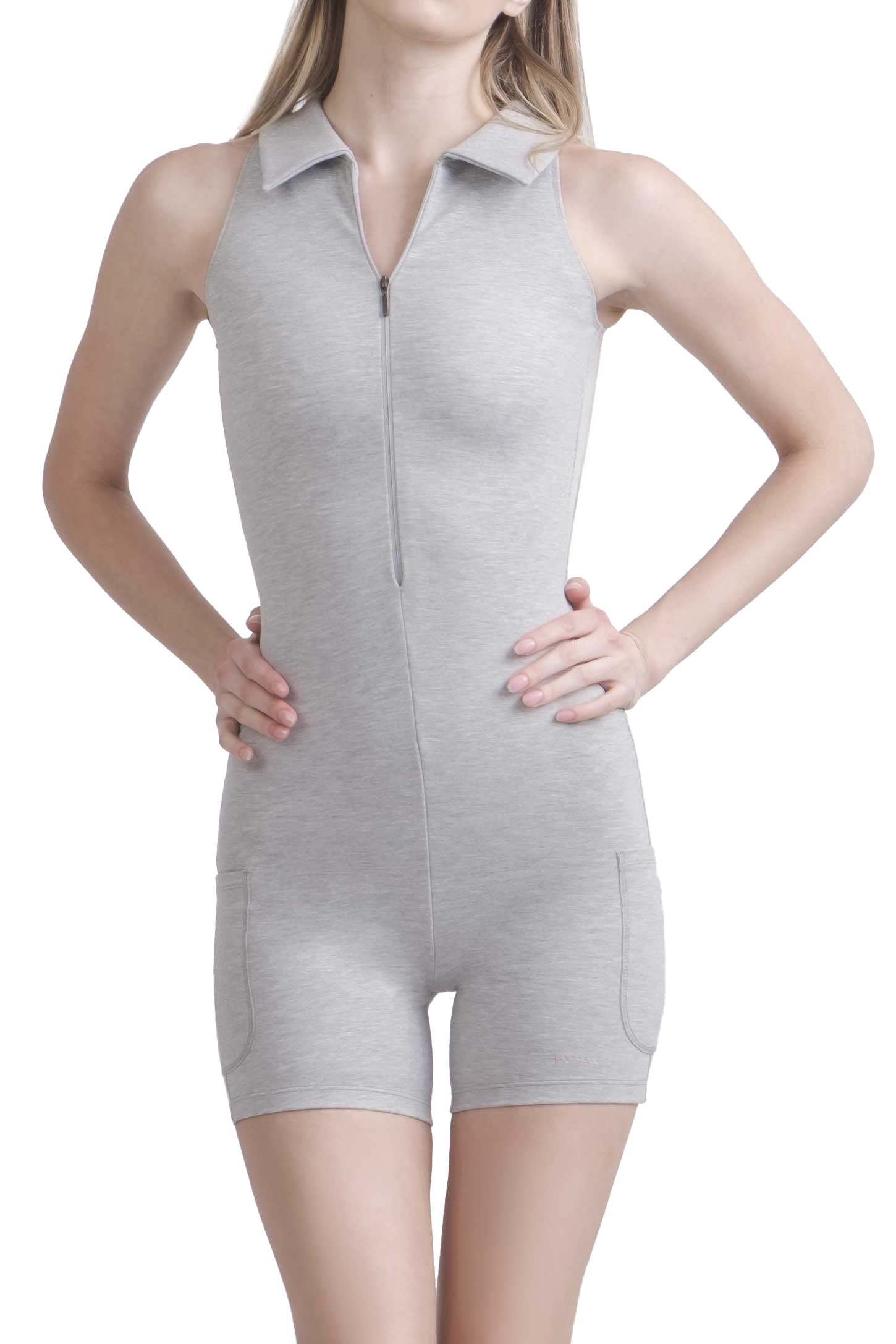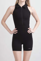 A biker-length unitard with a halter neckline and classic collar, front zip fastening, side pockets, and an embroidered logo.