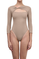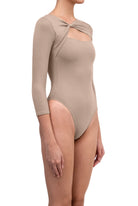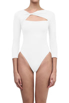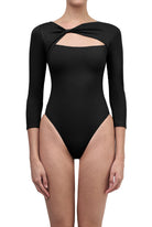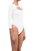 A fitted bodysuit featuring quarter-length sleeves, an asymmetric knotted front design with a cut-out detail, snap buttons, and an embroidered logo.